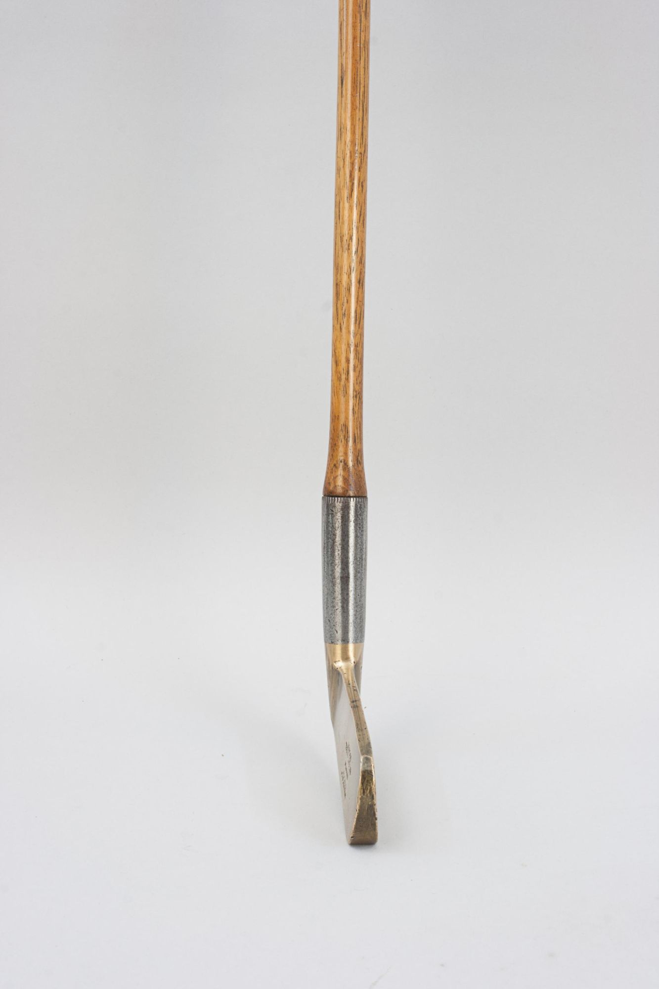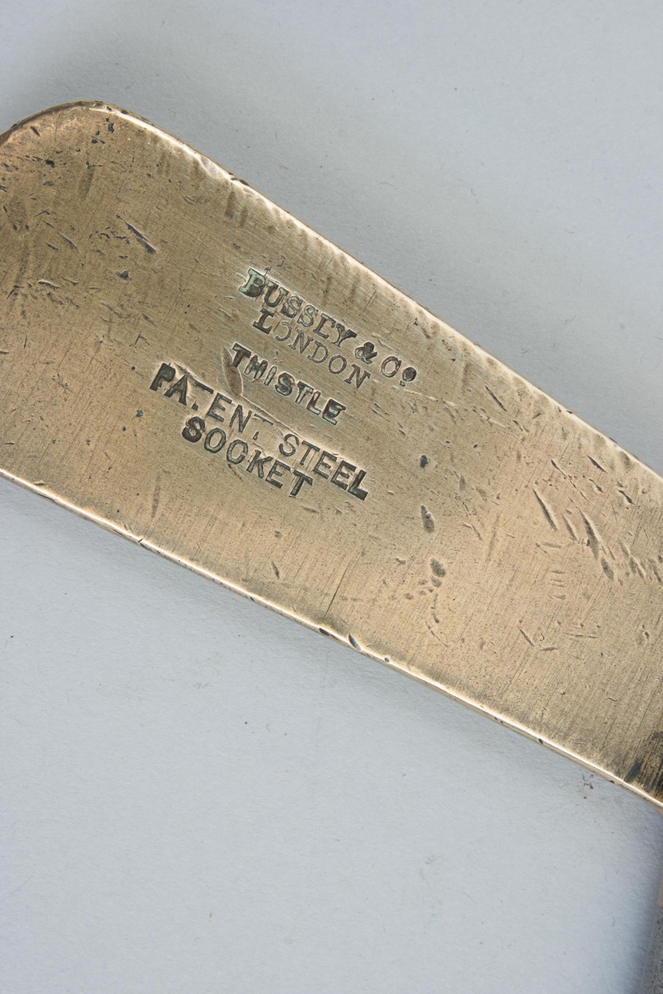 An attractive, desirable late 19th century blade putter by Bussey & Co. London. The patent club head is constructed from two separate parts, a steel hosel and a gun metal blade, with the two parts being brazed together. The head is glued to the original hickory shaft which is adorned with Gibson's patent leather grip of a single folded piece of leather with stitching up the back. The idea behind the grip is to prevent unravelling and to aid the placement and alinement of the grip. The back of the club head is stamped 'Bussey & Co. London, Thistle, Patent Steel Socket'.
