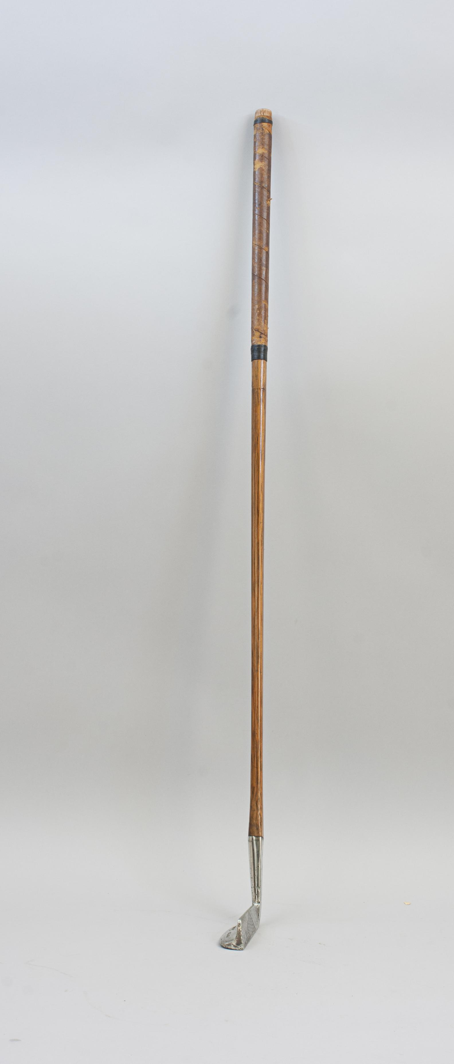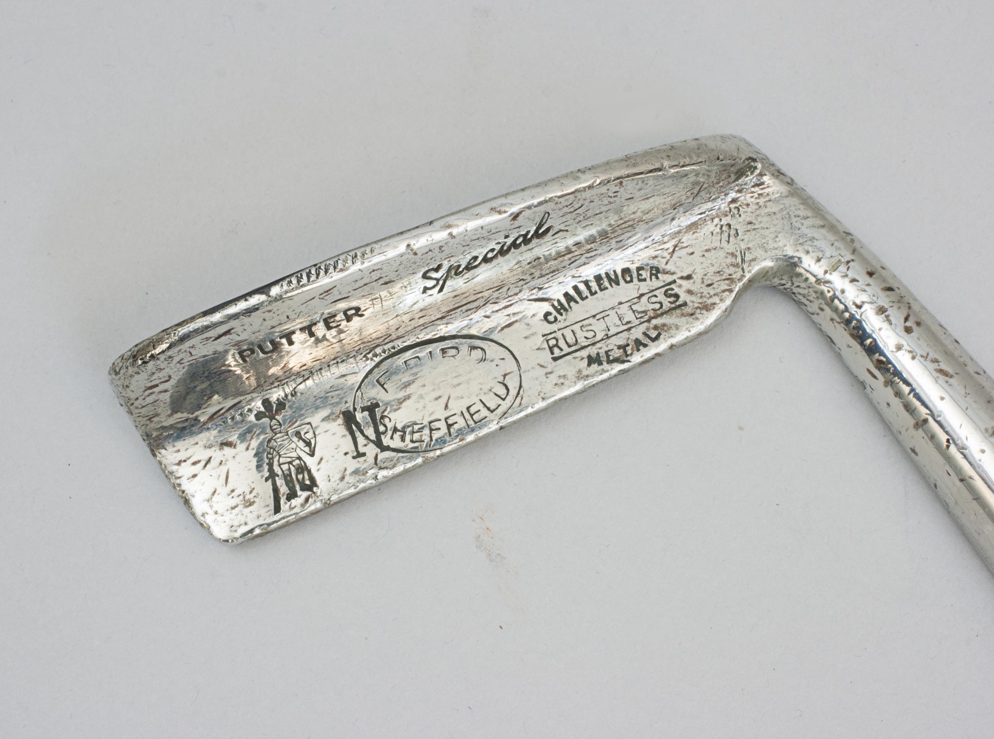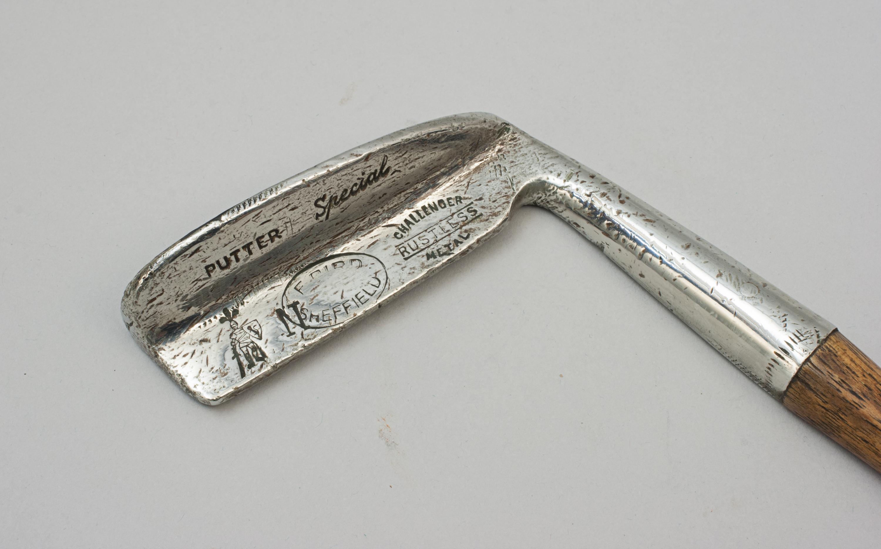 The club has the original hickory shaft with a later polished leather grip, the head with a flanged back and to help with alignment the hosel, hickory shaft and leather grip all have a flat leading edge. The club was made by Cochrane Ltd. of Edinburgh and it is stamped with their 'Knight' cleek mark. The head is also stamped 'Putter, Special, N, Challenger Rustless Metal' and within an oval 'F.Bird, Sheffield'.