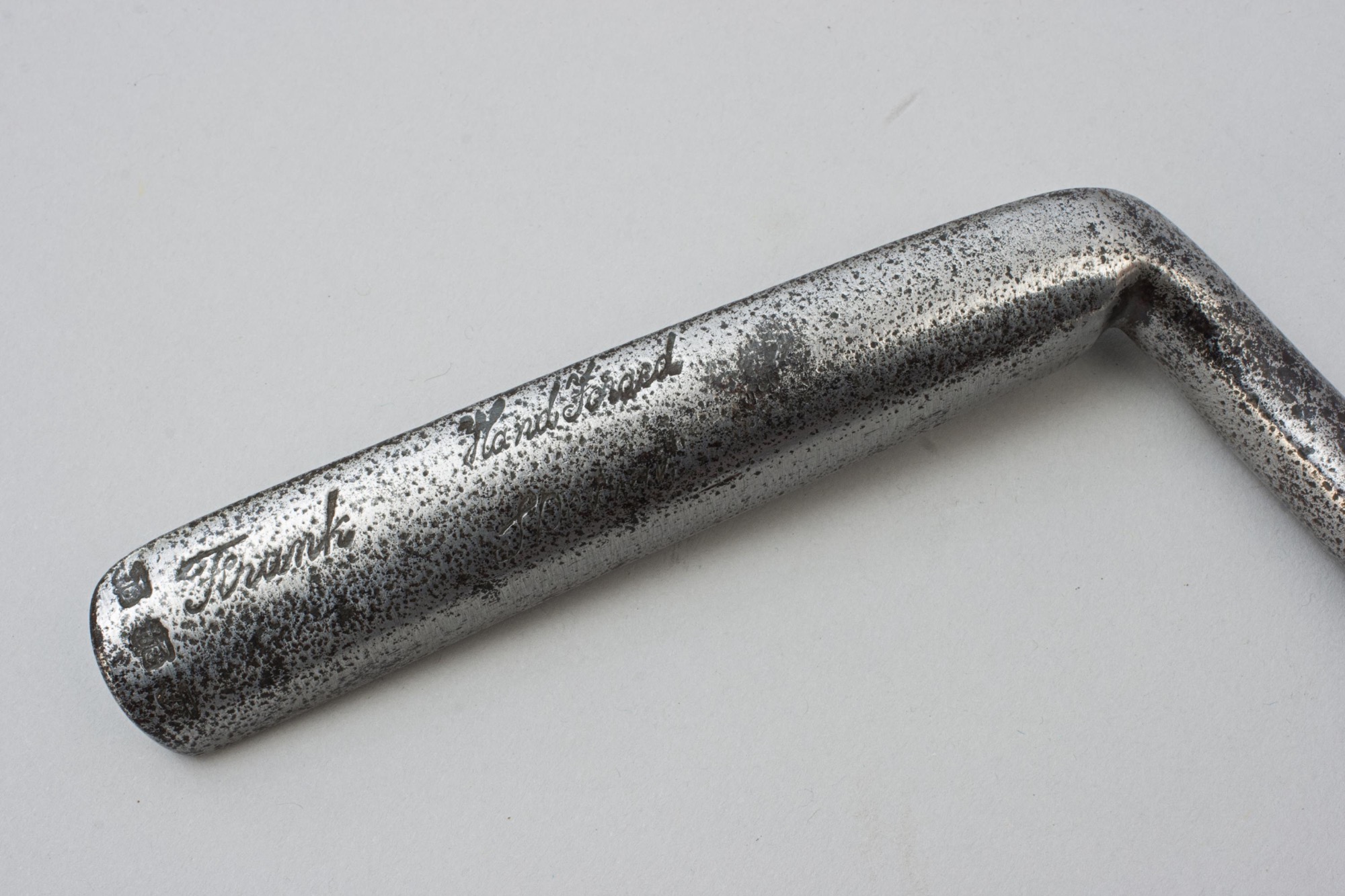 An early, slightly offset, wry neck blade putter with an unusually narrow and long club head. The back of the club head is rounded with very indistinct markings, 'Frank, Hand Forged' possibly with three initials in Old English font. The blade putter measures a full 12 cm straight across the center of the face, from toe to heel. Possibly manufactured by Frank Johnson Ltd. London.