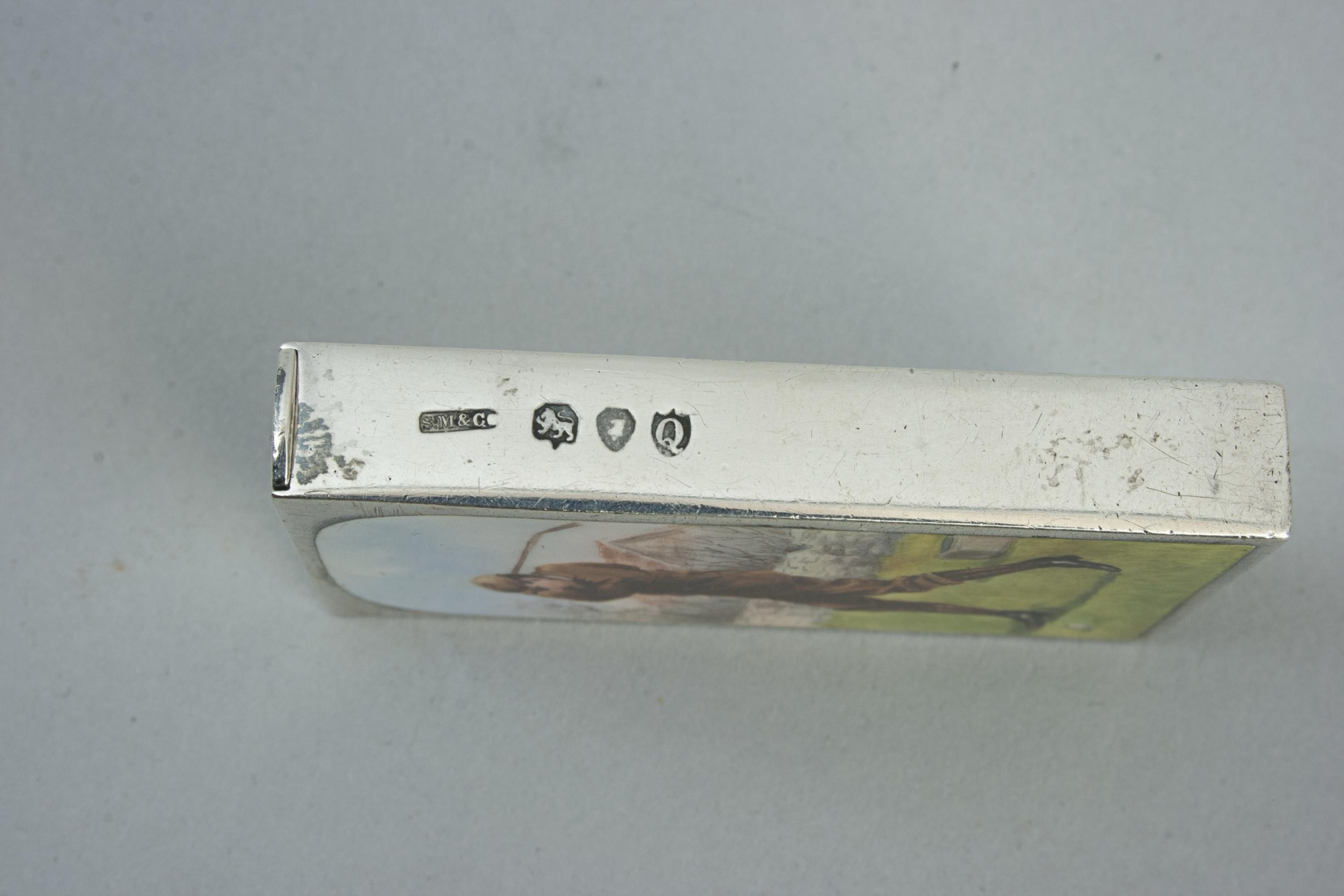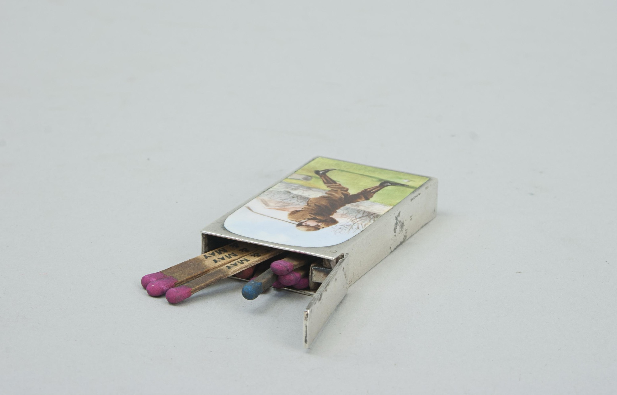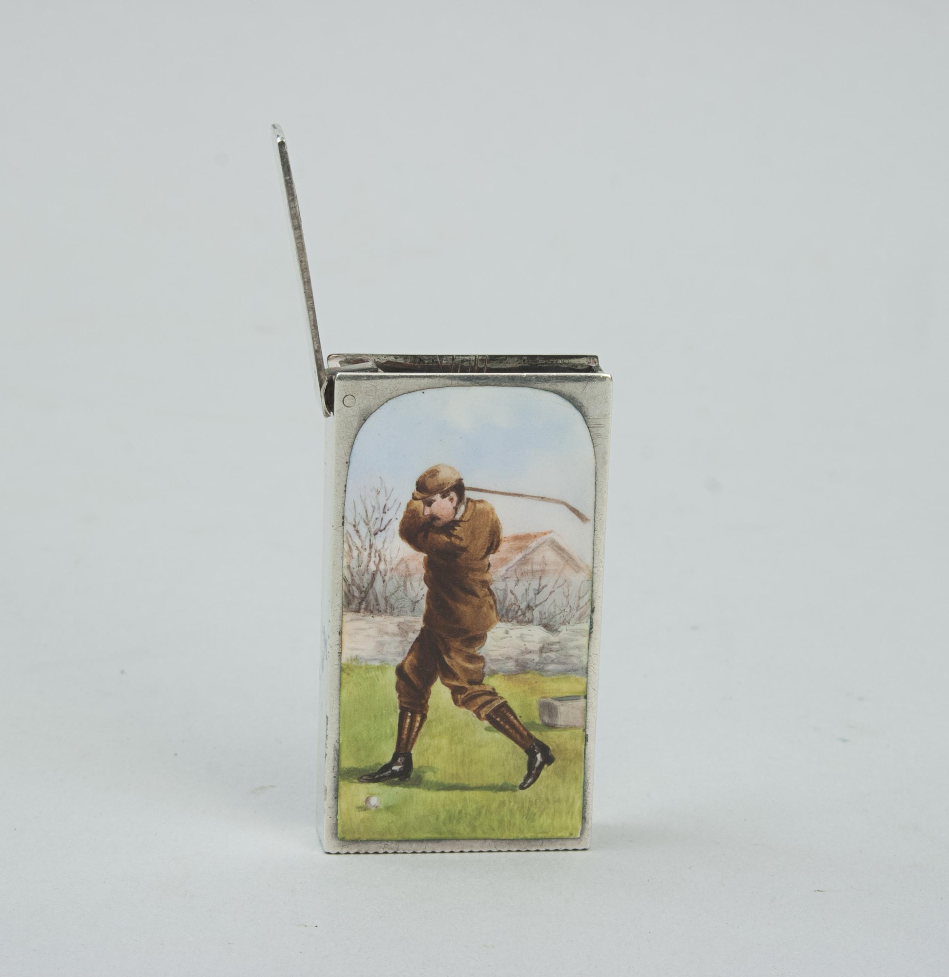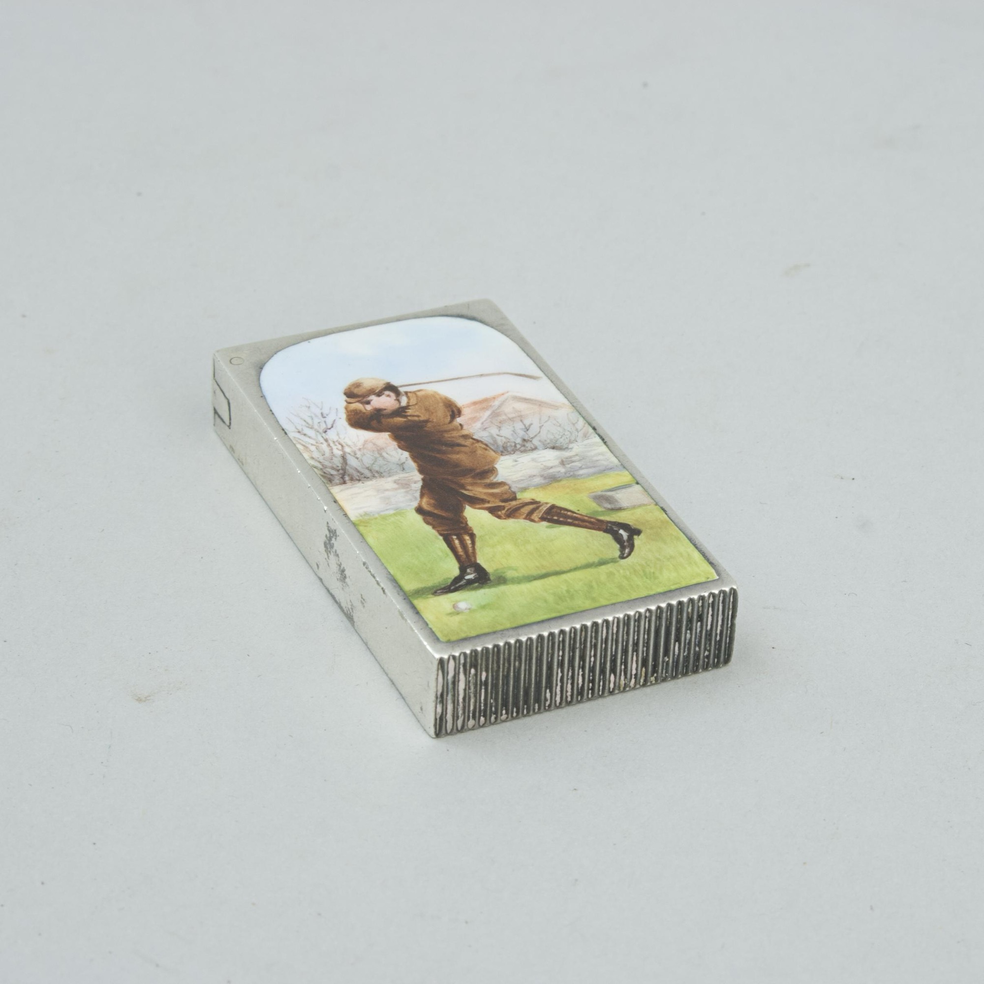 An exquisite antique silver enamelled golf vesta case by the renowned maker Sampson Mordan, hallmarked London 1891 with the registered mark 'S. M. & Co.' (registered in 1890). This charming piece features a flip-top lid and a serrated base designed for striking matches, combining practicality with refined Victorian craftsmanship. The front is beautifully decorated with an enamelled golfing scene, depicting a male golfer poised to tee off, dressed in traditional brown tweeds, flat cap, and plus-fours, capturing the spirit of late 19th century golf. The reverse is engraved "To Bob from Huwe 1902 - 1945".