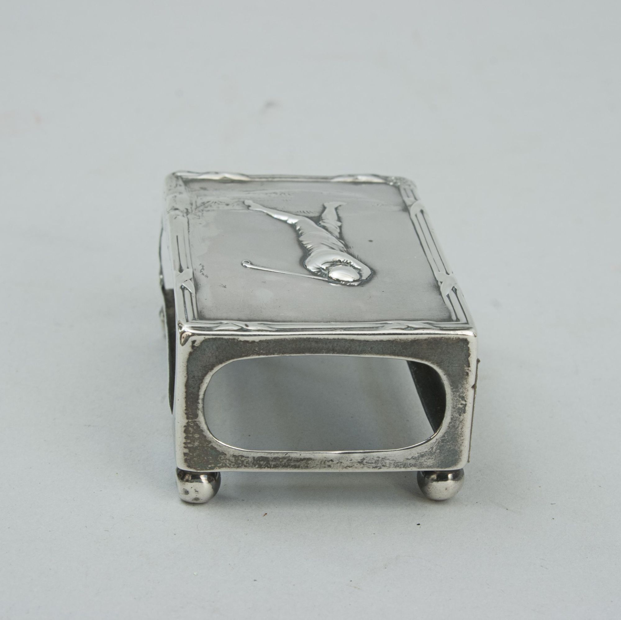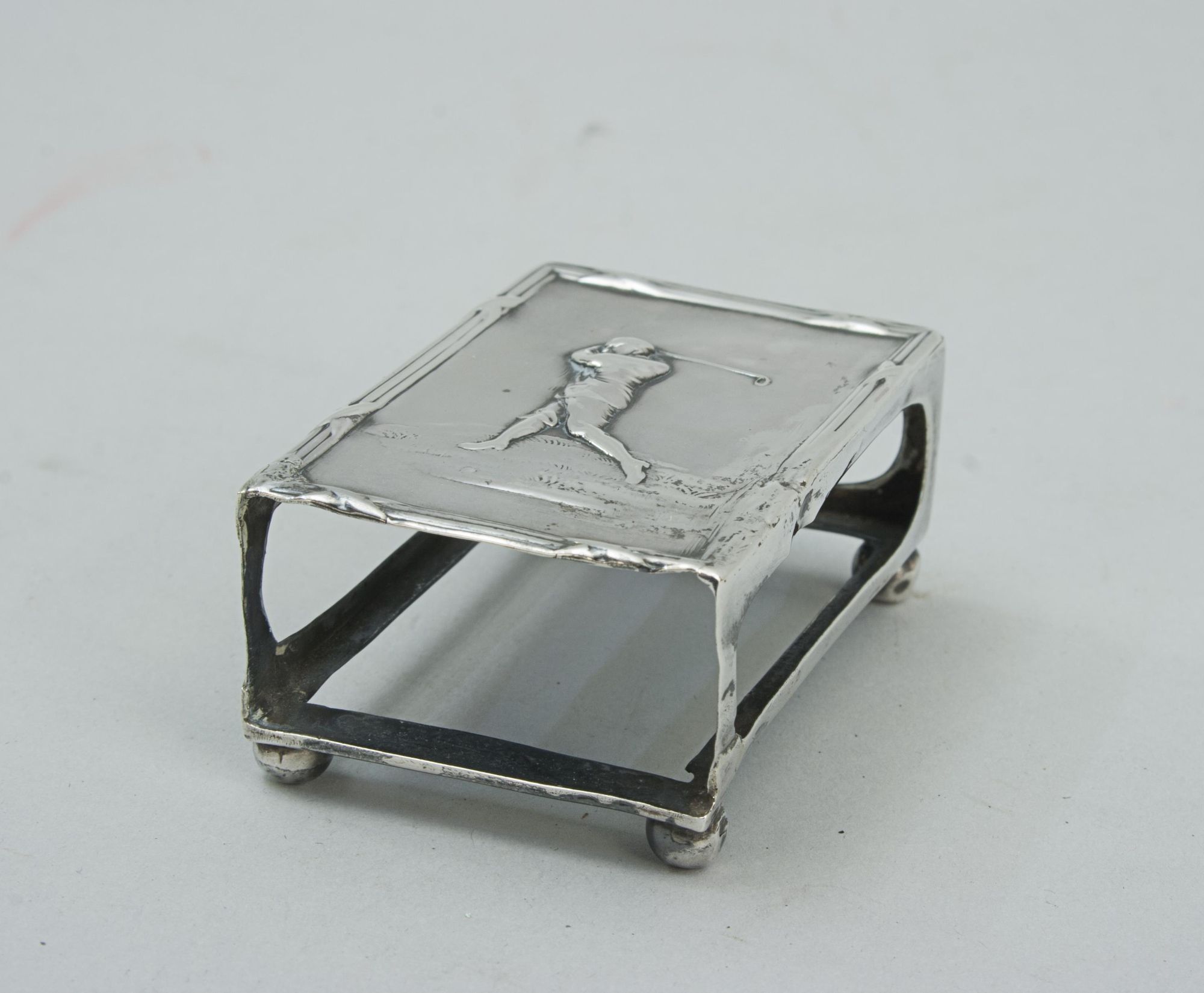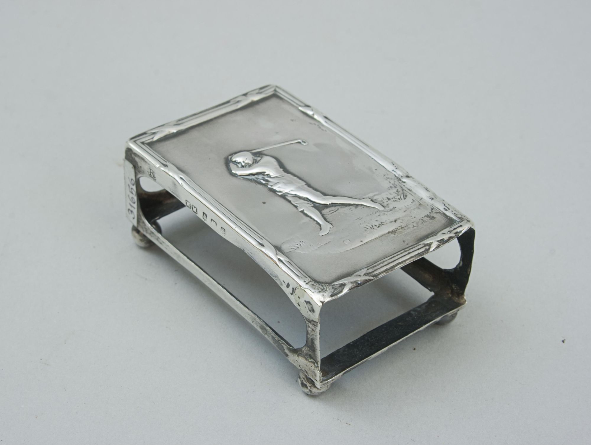 A superb and highly decorative Edwardian solid silver matchbox holder, beautifully crafted in Birmingham in 1905 by the noted silversmith Henry Matthews of Vittoria Street. The holder stands elegantly on four distinctive ball feet and features a finely detailed raised relief of a male golfer in full back swing, making it an especially appealing piece for golfing enthusiasts and collectors of sporting silver. The sides are hollowed out so that you can strike the match on the side of the box.