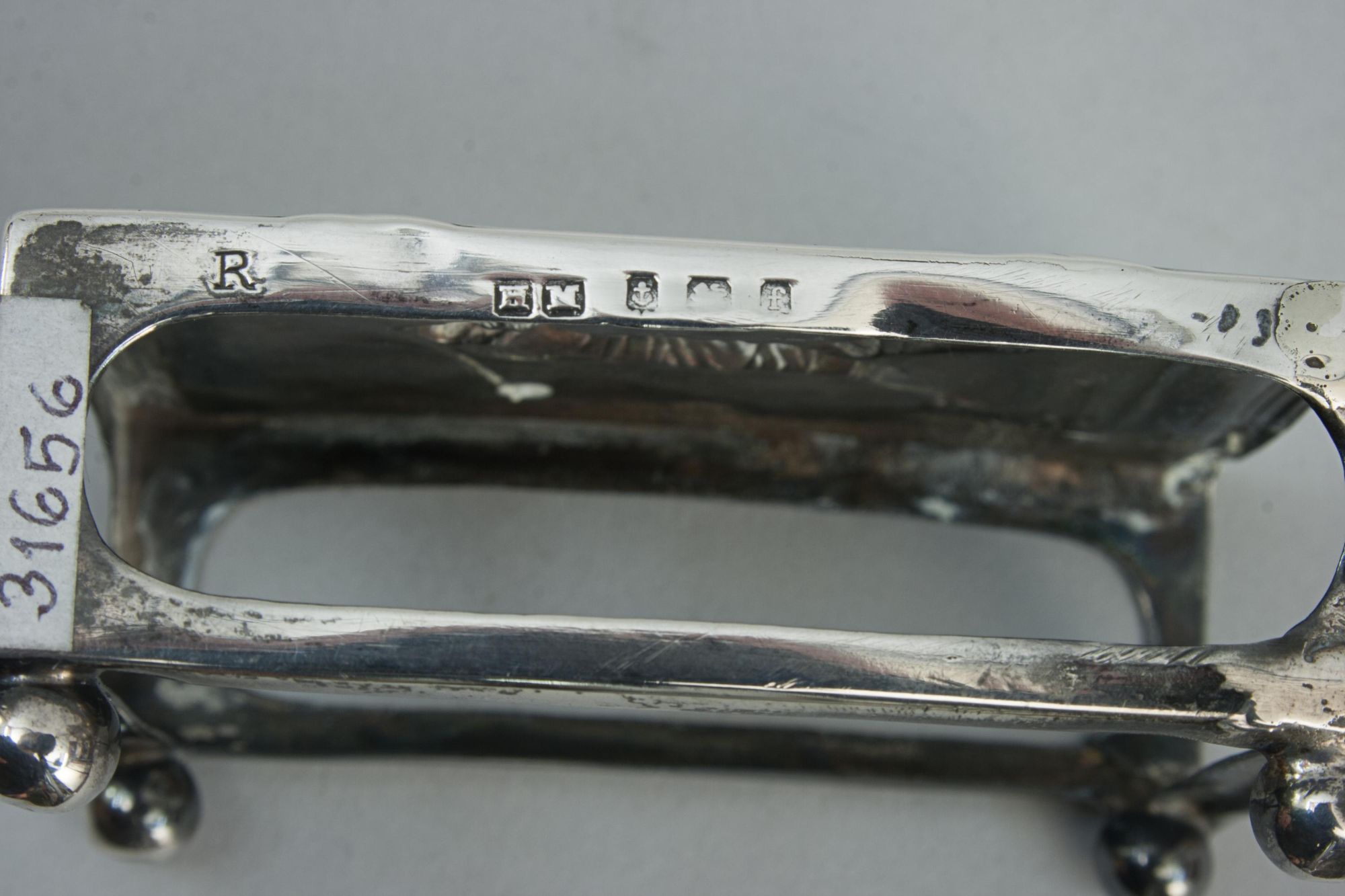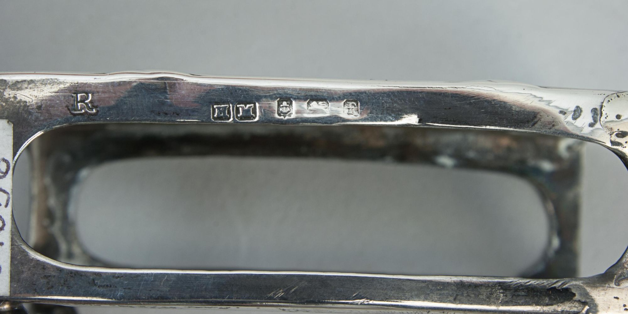 The piece is fully hallmarked on the frame and remains clearly legible, displaying the lion passant for sterling silver, the anchor assay mark for Birmingham, and the date letter "f" corresponding to 1905, along with the maker's mark "HM" for Henry Matthews.