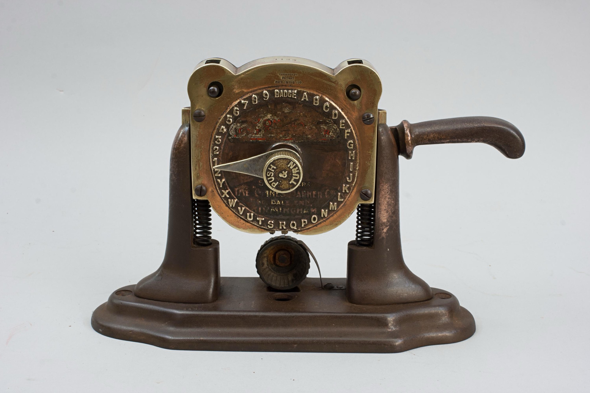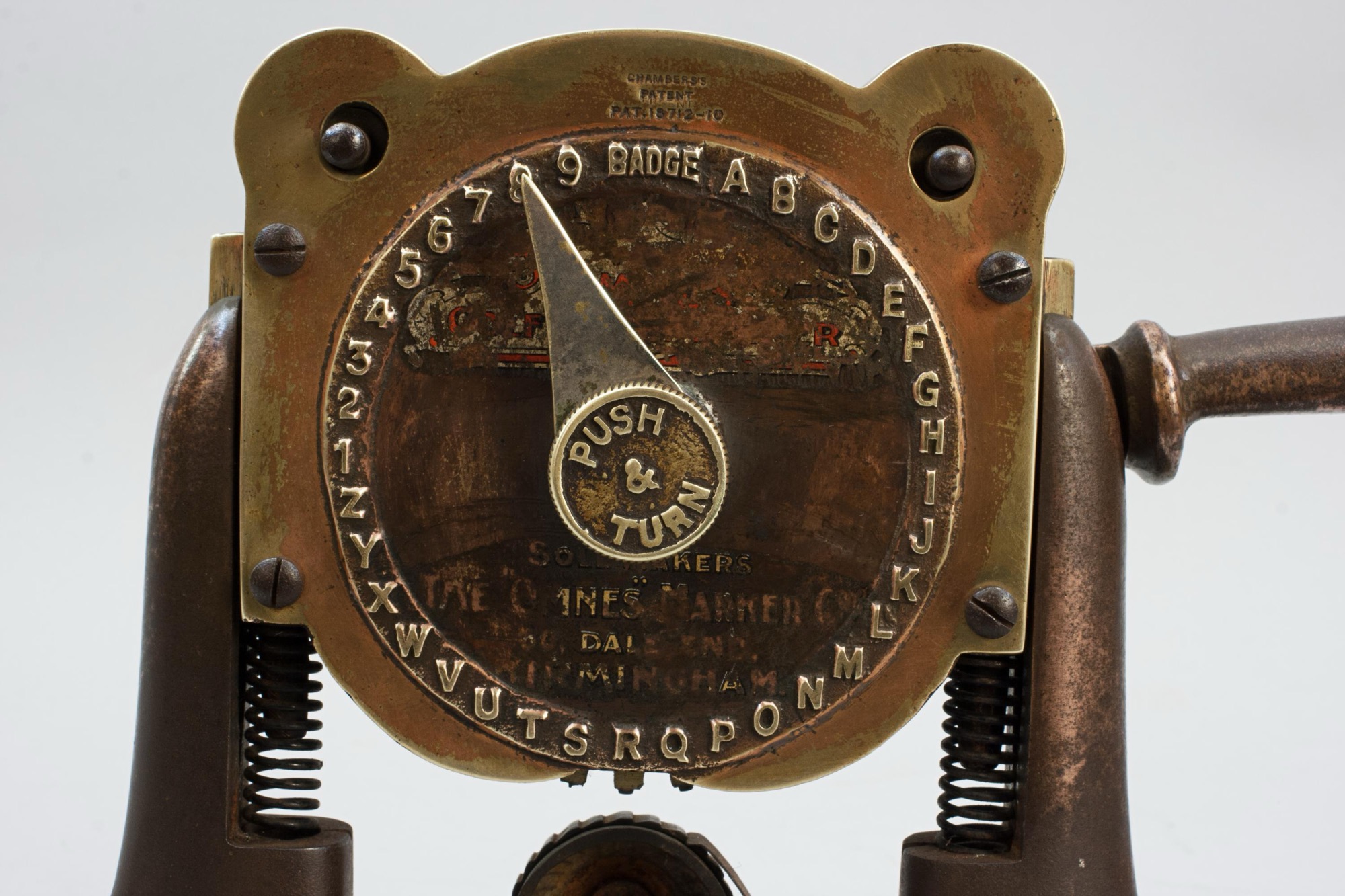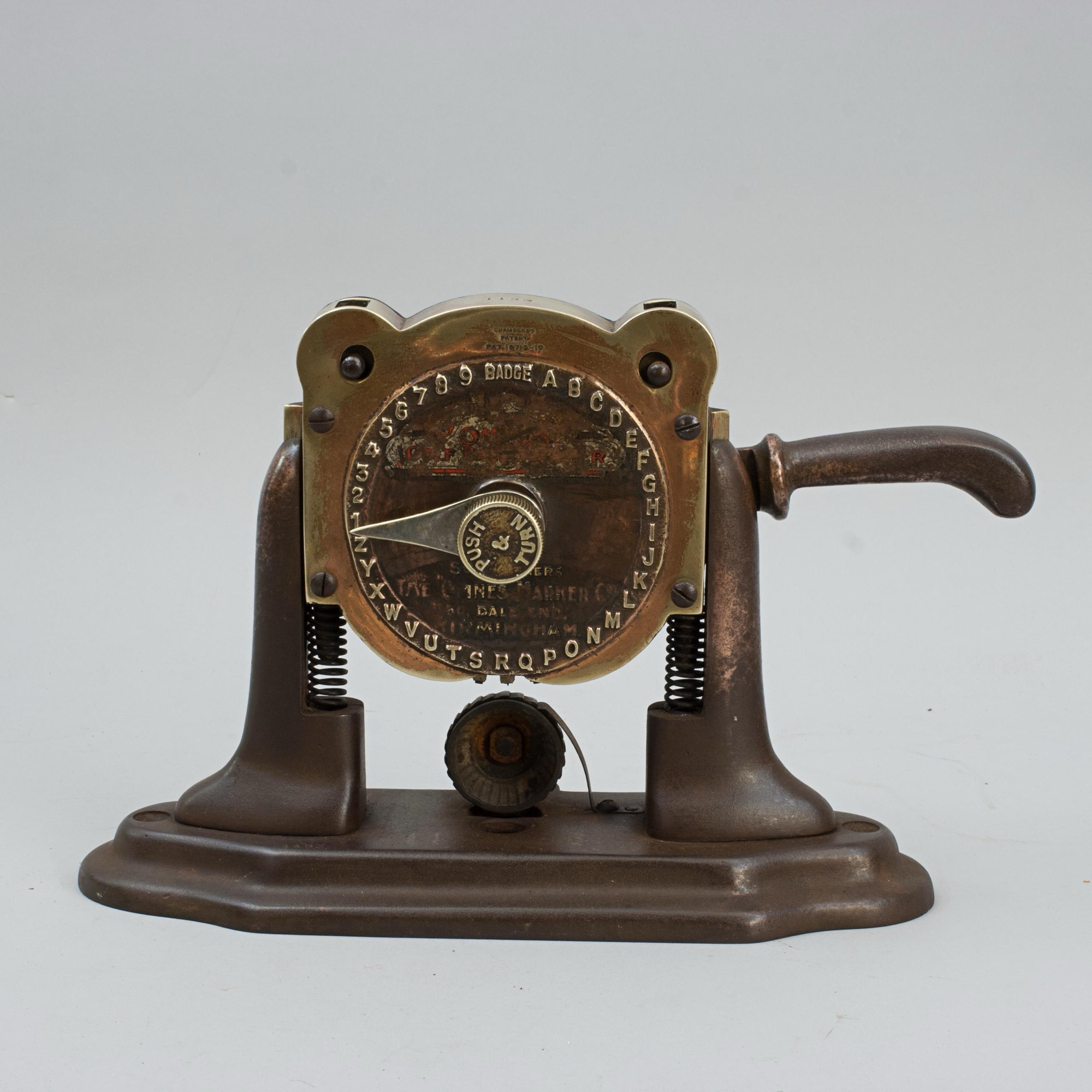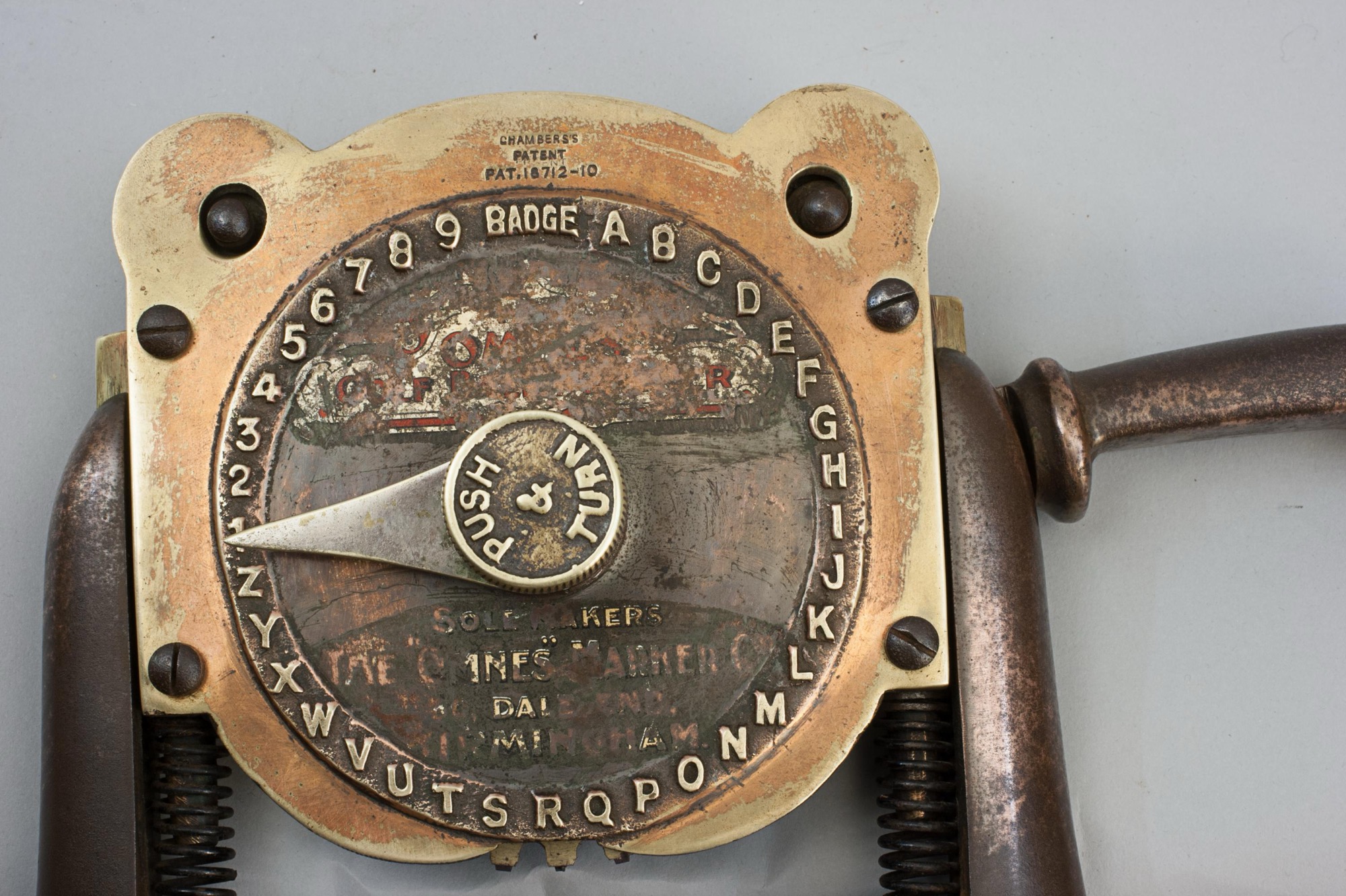 The press is stamped to the very top of the machine 'Made In England 2832', just above the clock face 'Chambers Patent no 18712-10'. The clock face shows what will be impressed into the ball - BADGE, the alphabet and 1,2,3,4,5,6,7,8,9'. There are also the remains of a decal on the bottom half of the face 'Sole Makers, The "Omnes" Marker Co., 50 Dale End, Birmingham'.