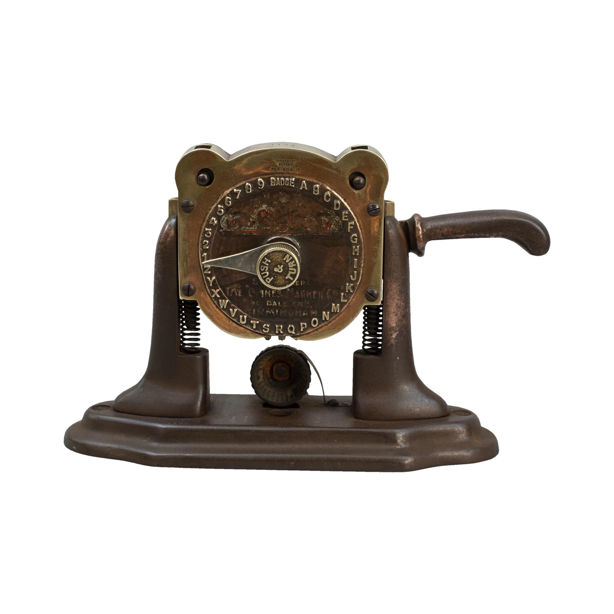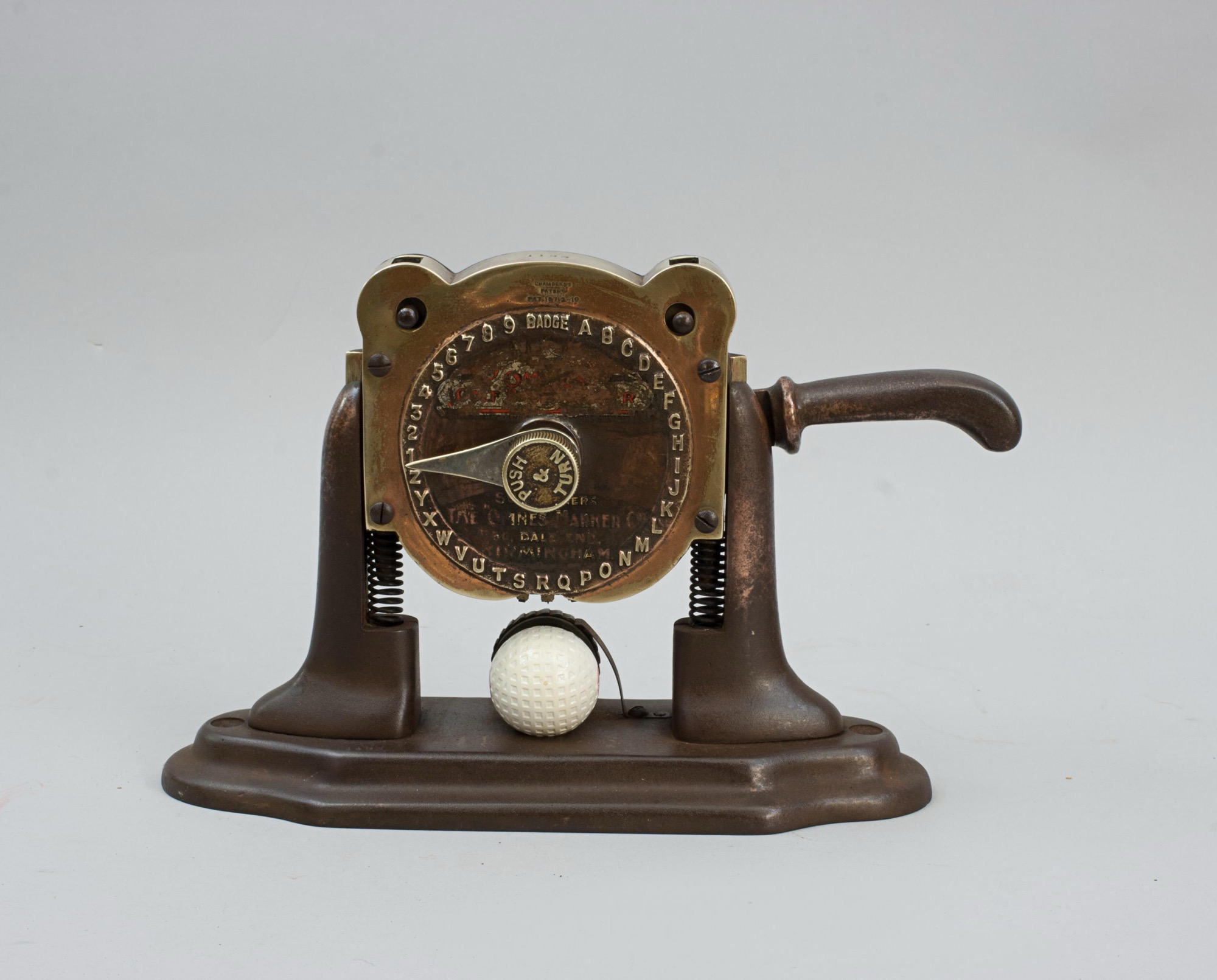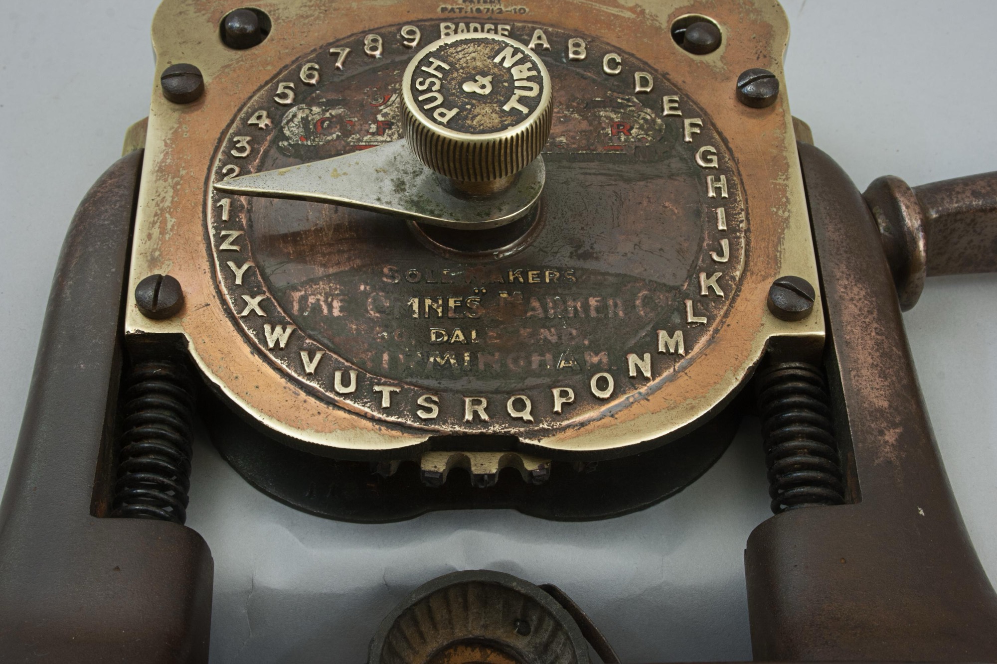The press is stamped to the very top of the machine 'Made In England 2832', just above the clock face 'Chambers Patent no 18712-10'. The clock face shows what will be impressed into the ball - BADGE, the alphabet and 1,2,3,4,5,6,7,8,9'. There are also the remains of a decal on the bottom half of the face 'Sole Makers, The "Omnes" Marker Co., 50 Dale End, Birmingham'.