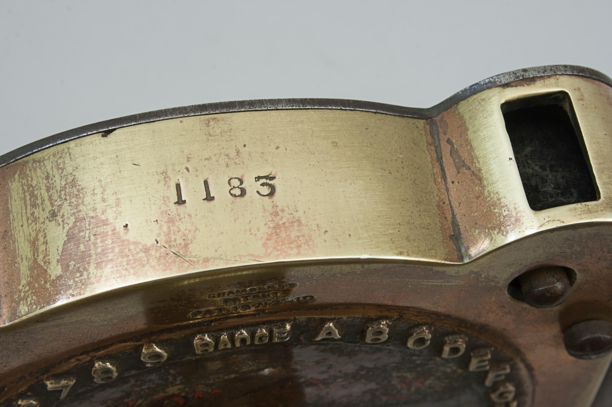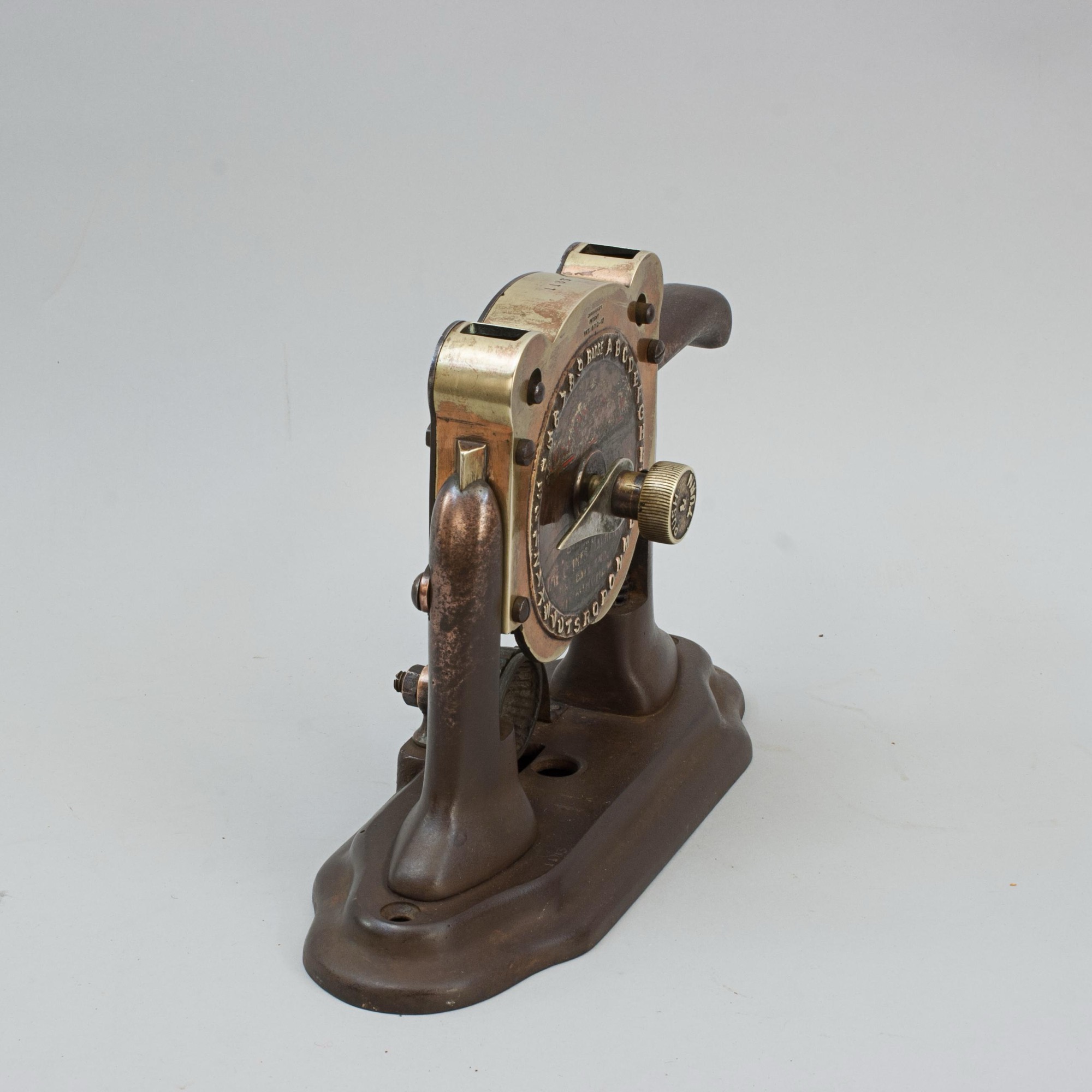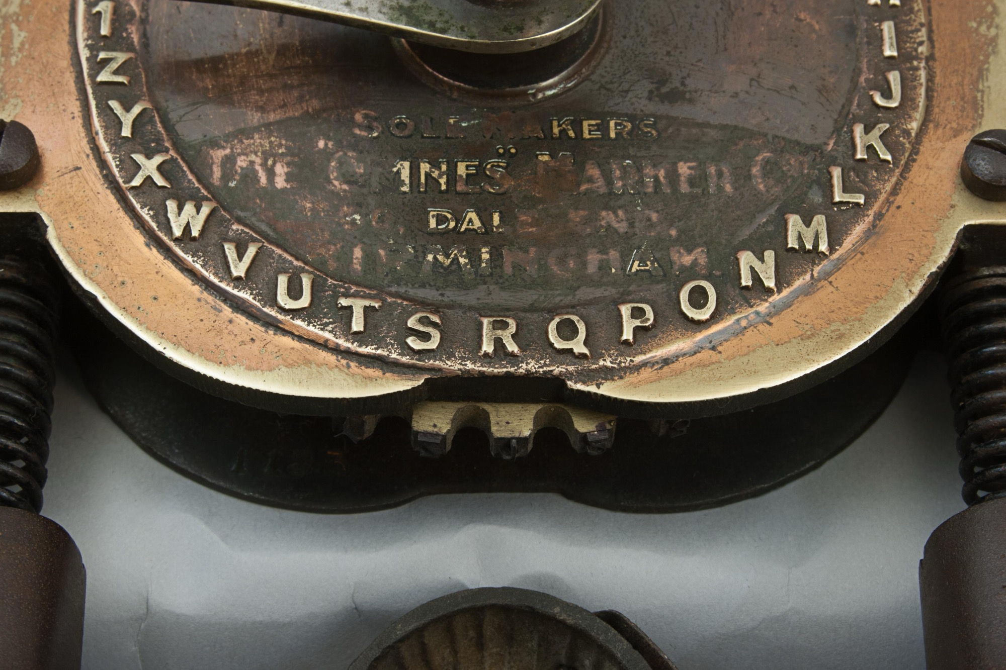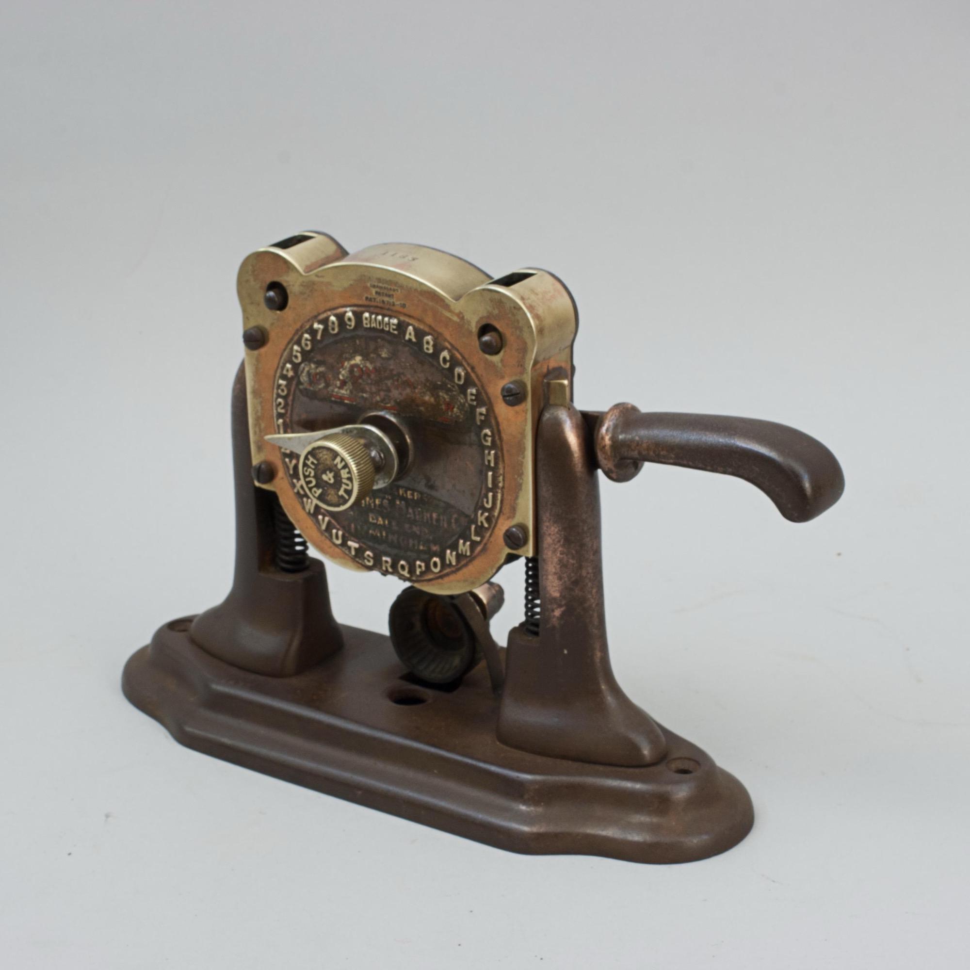 The press is stamped to the very top of the machine 'Made In England 2832', just above the clock face 'Chambers Patent no 18712-10'. The clock face shows what will be impressed into the ball - BADGE, the alphabet and 1,2,3,4,5,6,7,8,9'. There are also the remains of a decal on the bottom half of the face 'Sole Makers, The "Omnes" Marker Co., 50 Dale End, Birmingham'.