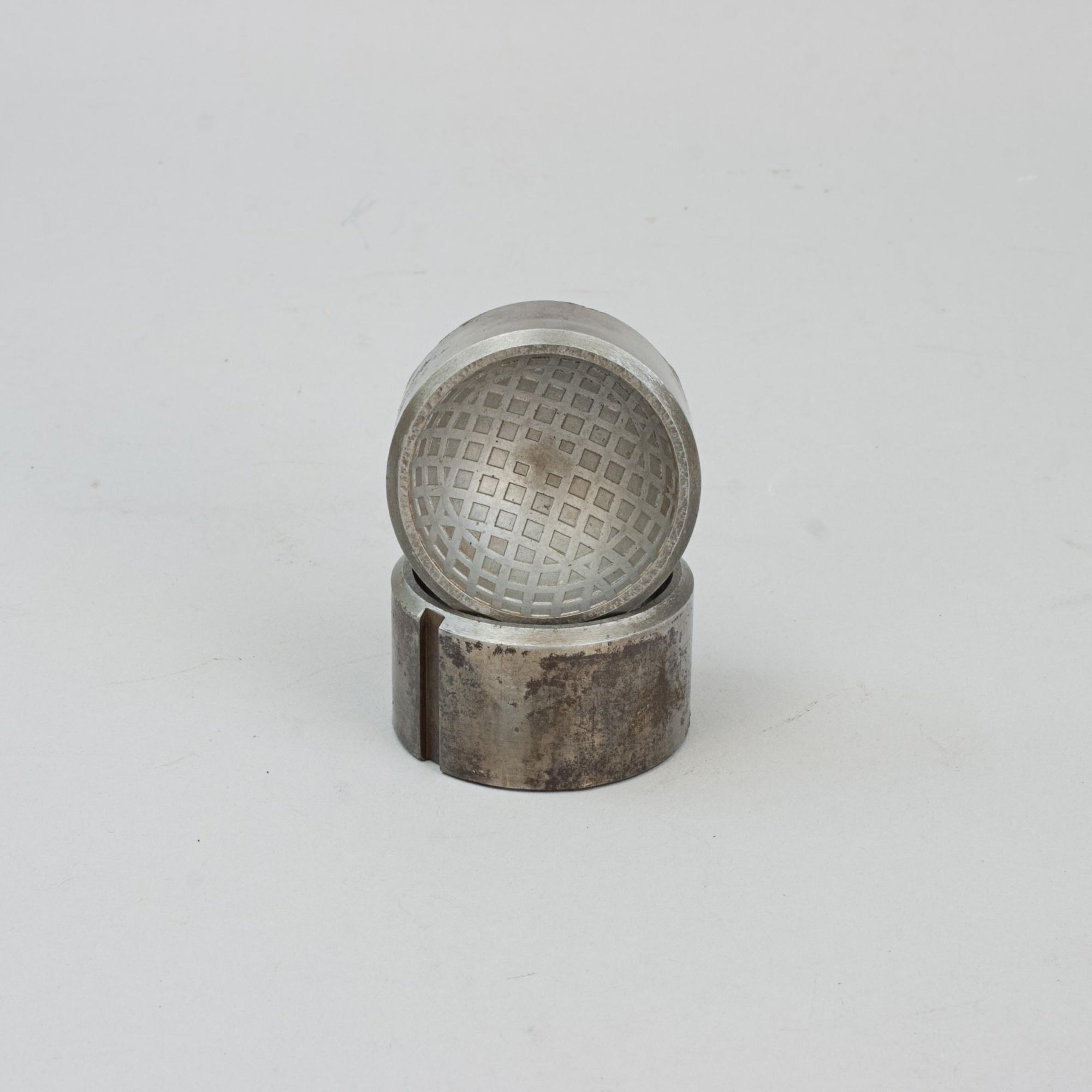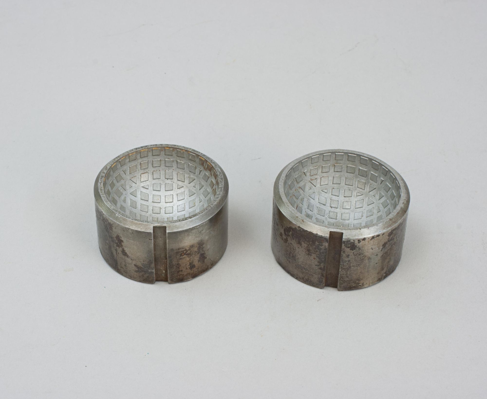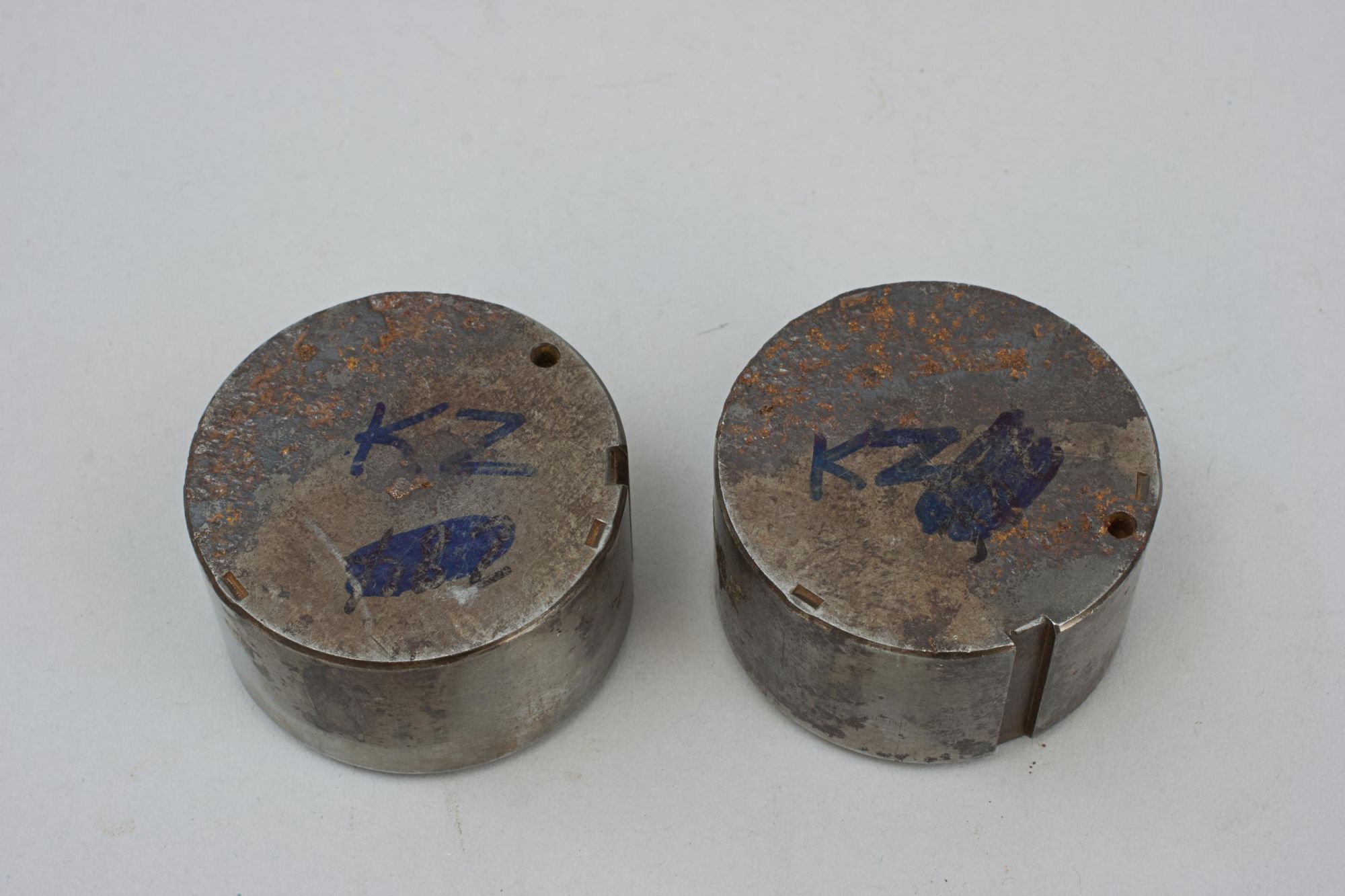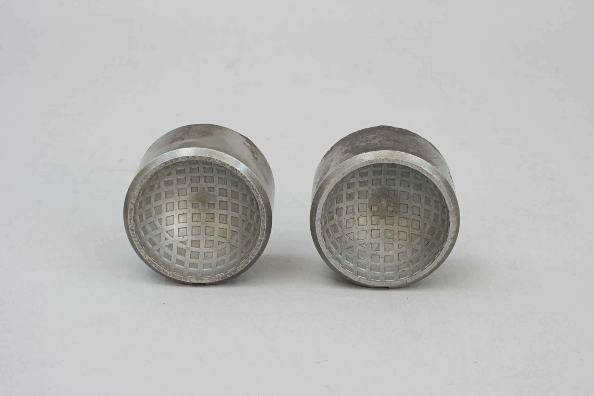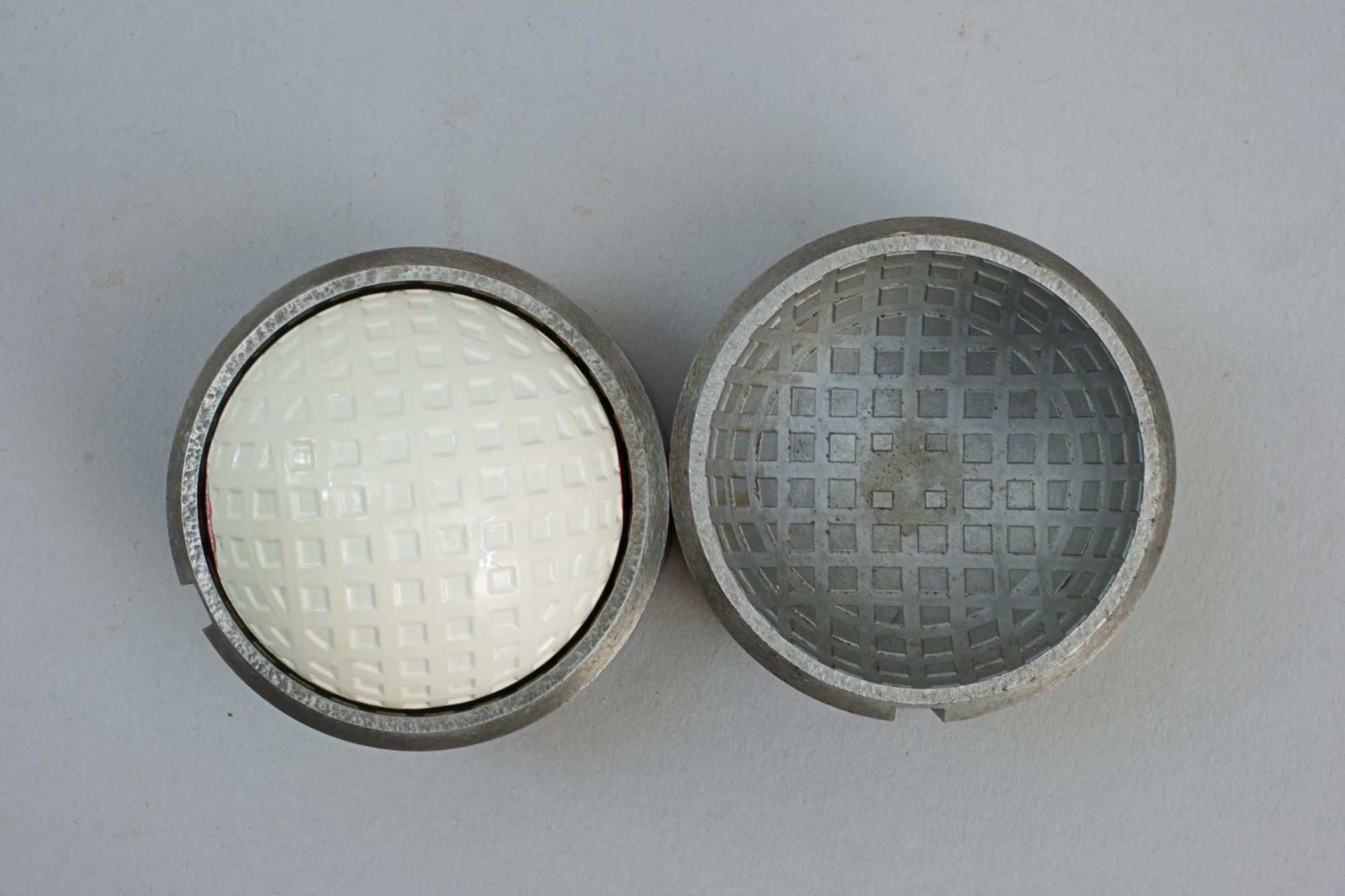 An interesting un-named square mesh (lattice) pattern golf ball mould. The steel moulds with locating slots on the side to ensure the correct alignment of the pattern, both parts marked in marker pen to the base 'KZ'. A nice collectors item.