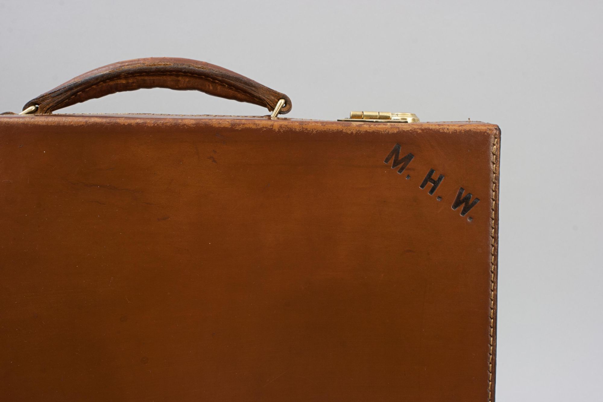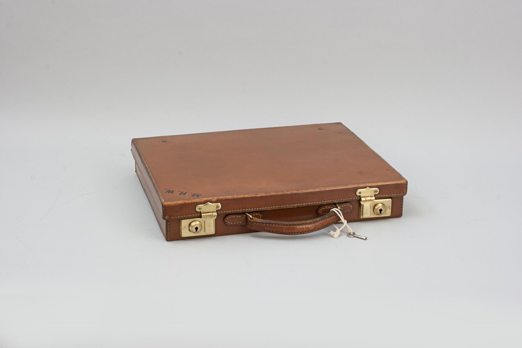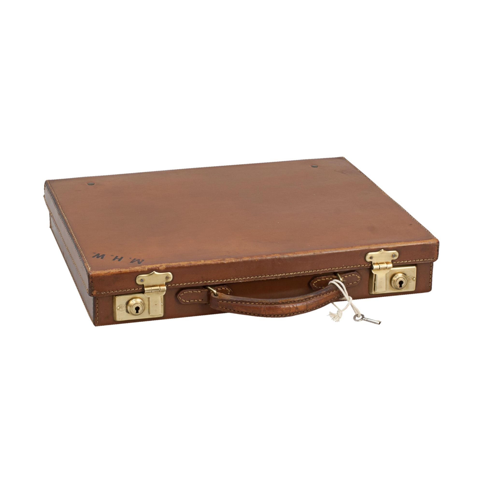 A fine tan leather briefcase, attaché case with single leather carry handle and two working locks, with key. Interior in great condition, spacious, suitable for carrying paperwork, folders, or possibly a small laptop or tablet. The case is in good original condition, initialled in topright hand corner "M.H.W."..