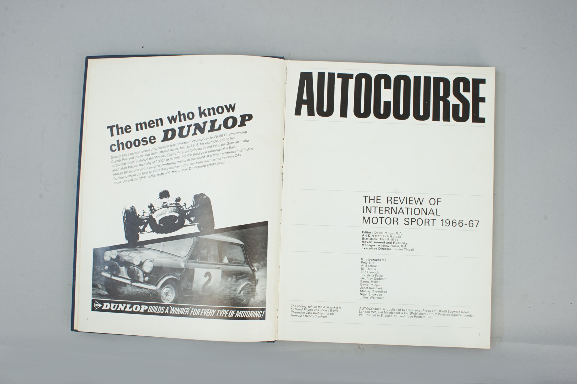 Hard back copy of the motor sport book, Autocourse 1966-67. A Review of the International Motor Sport 1966 - 67, full of photographs and motoring adverts.