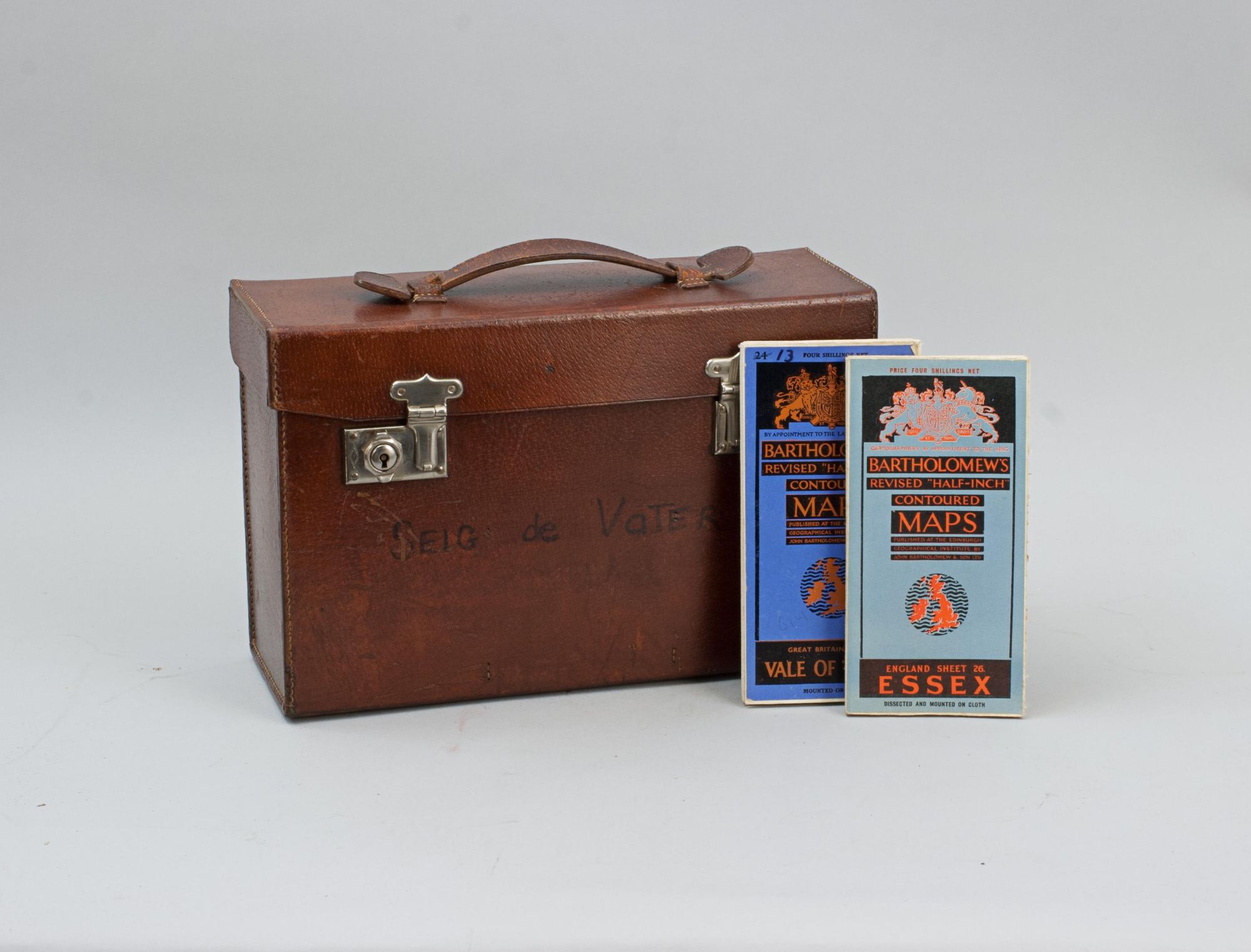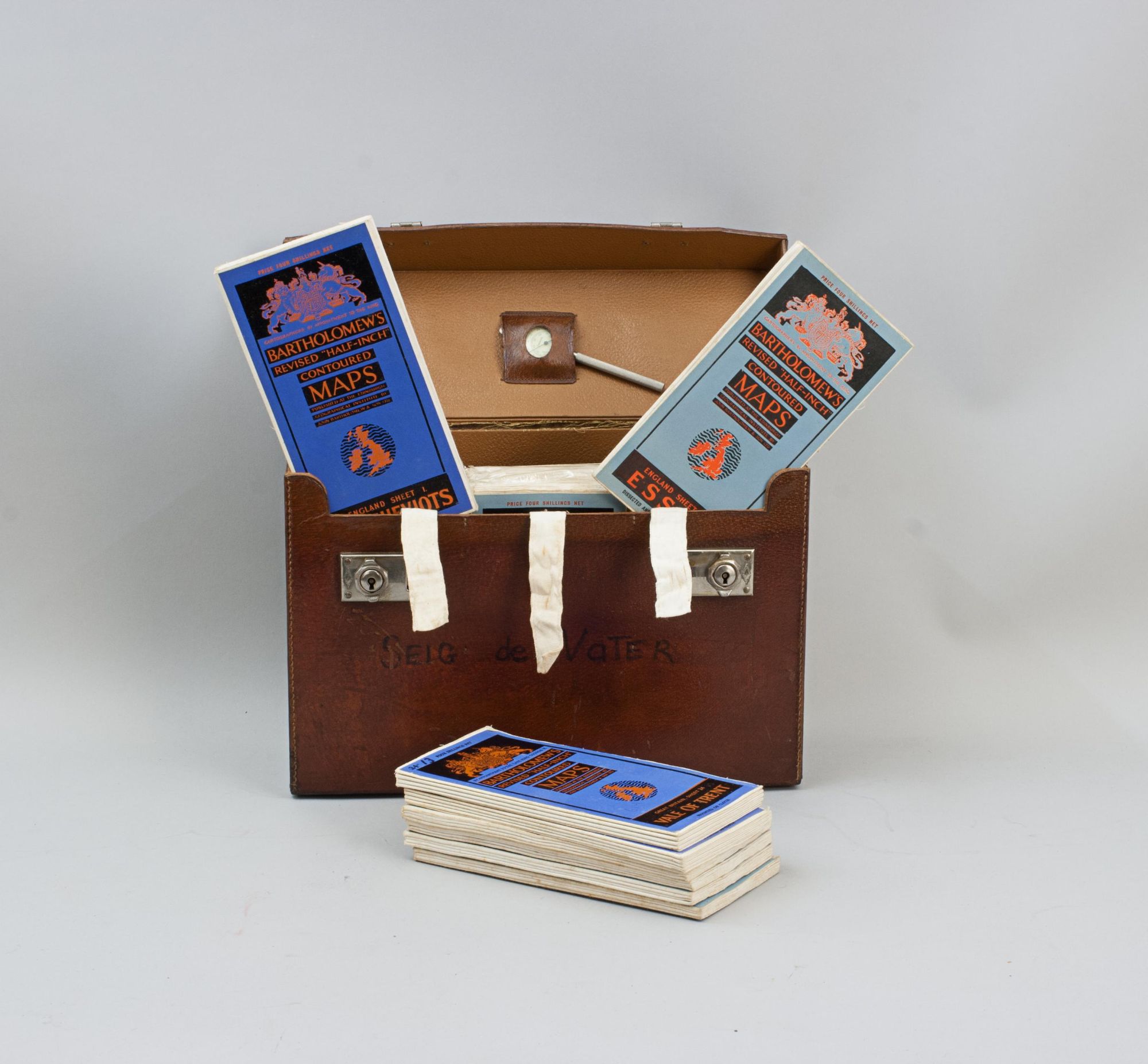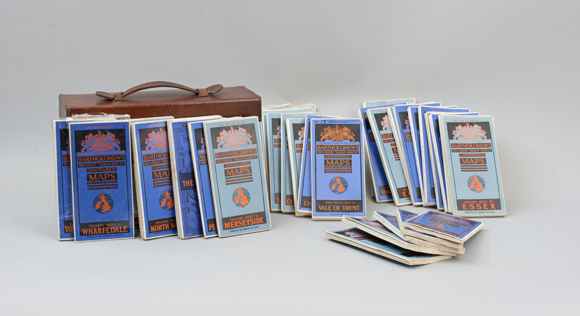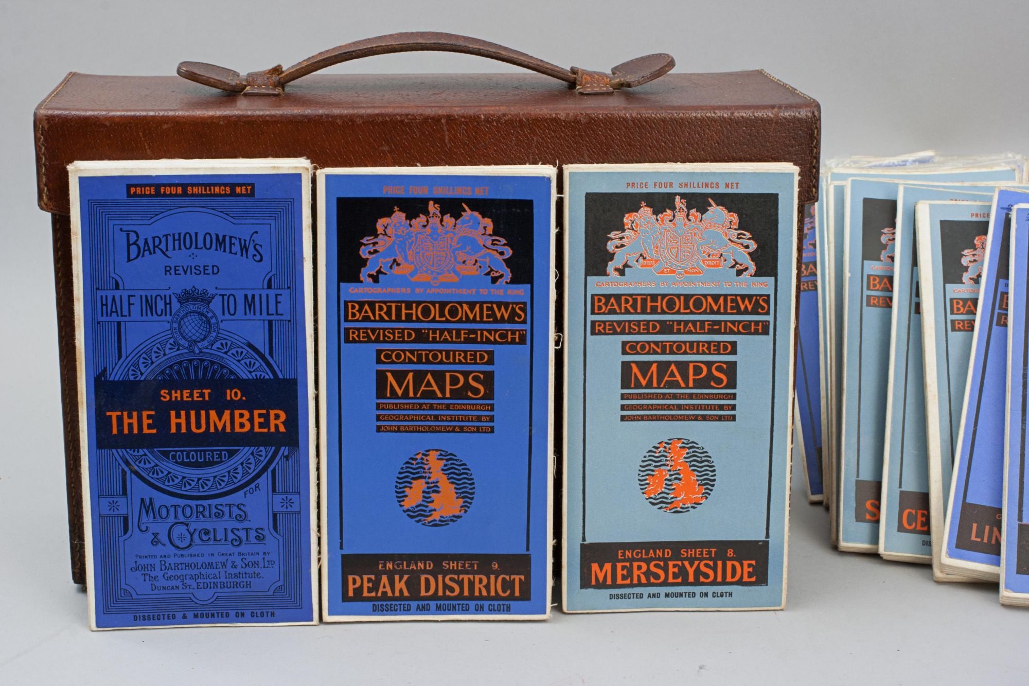 A vintage set of 37 Bartholomew's revised "Half-Inch" contoured road maps of Great Britain, housed in a hard leather travel case. Each map bears its own individual sheet number and corresponds to the full map of Great Britain printed on the reverse, which is divided into numbered sections to show how the sheets relate to one another. The maps were printed and published in Great Britain by John Bartholomew & Son Ltd., The Geographical Institute, Duncan Street, Edinburgh, reduced by permission from The Ordnance Survey, with special local revision to date of publication. The set is in good condition overall. Some maps have been replaced over the years due to regular use. The leather case remains in good order and features a central leather carry handle on the lid.