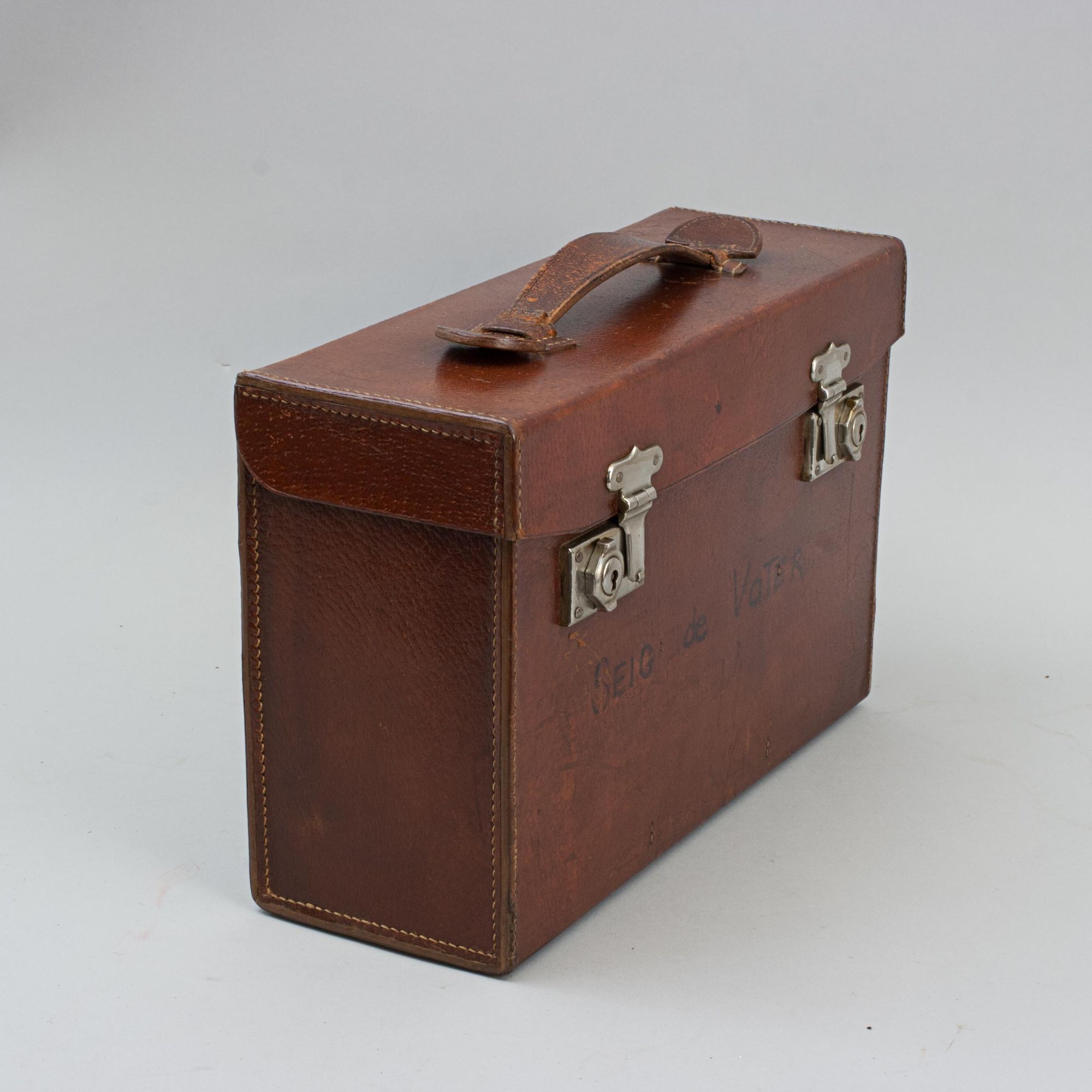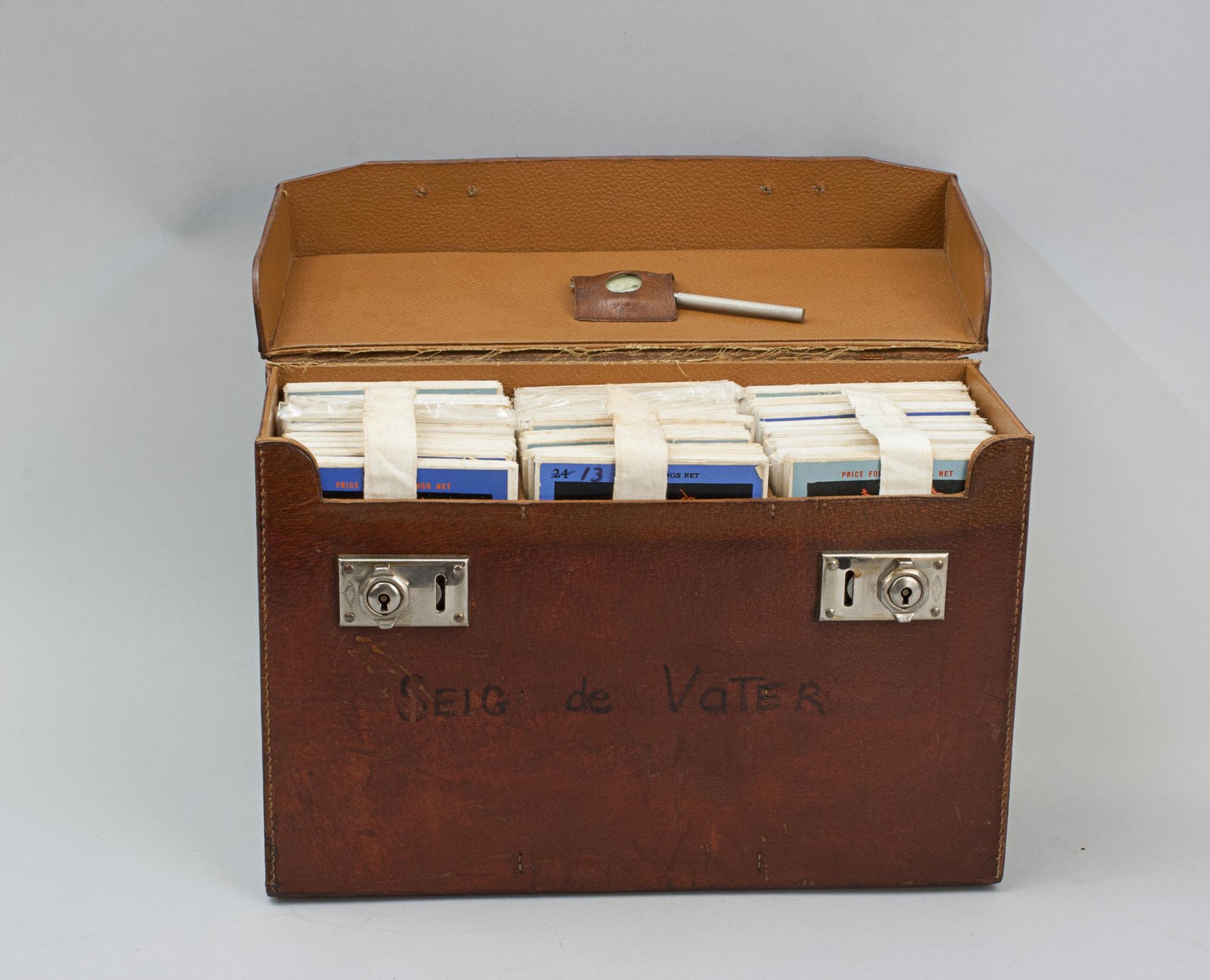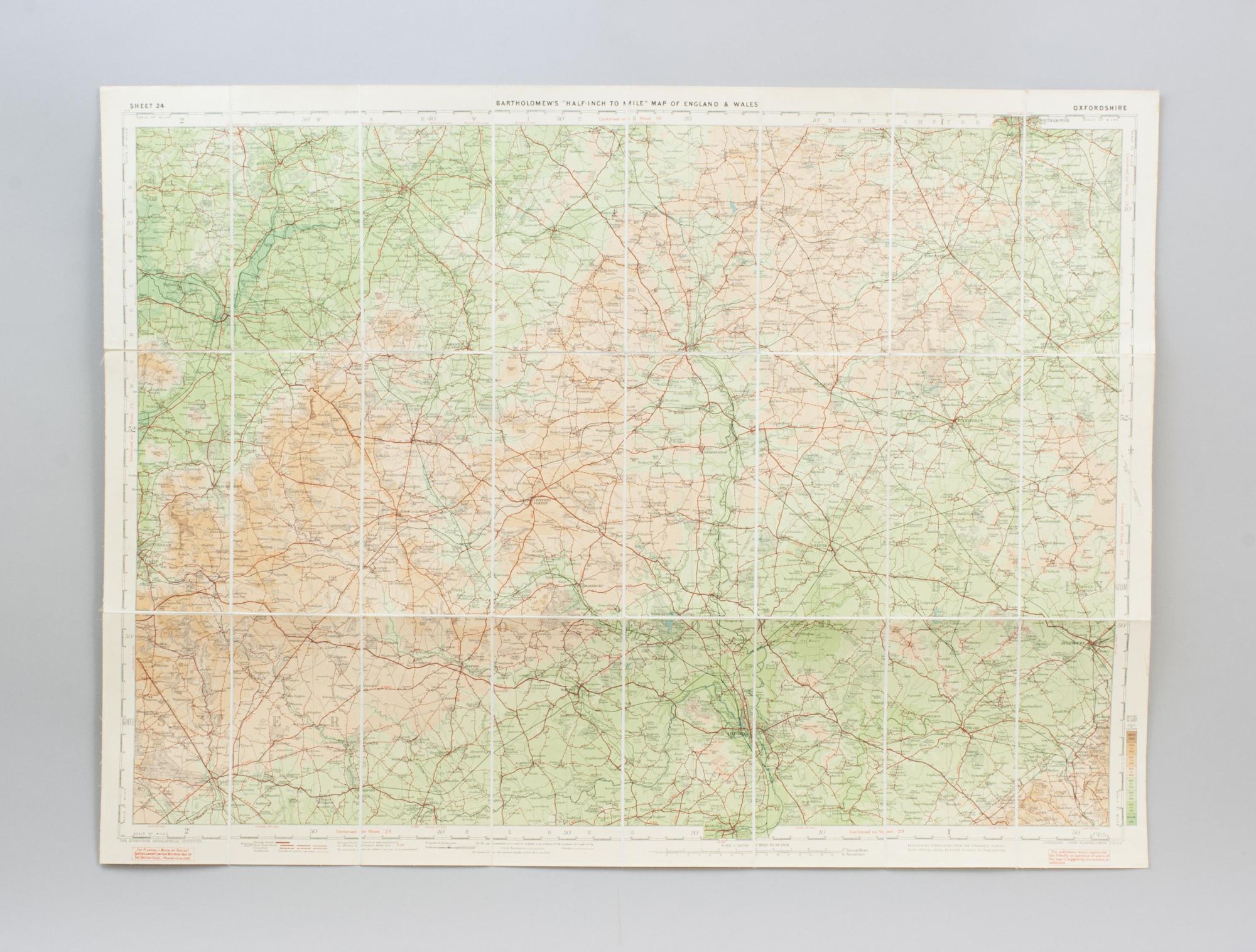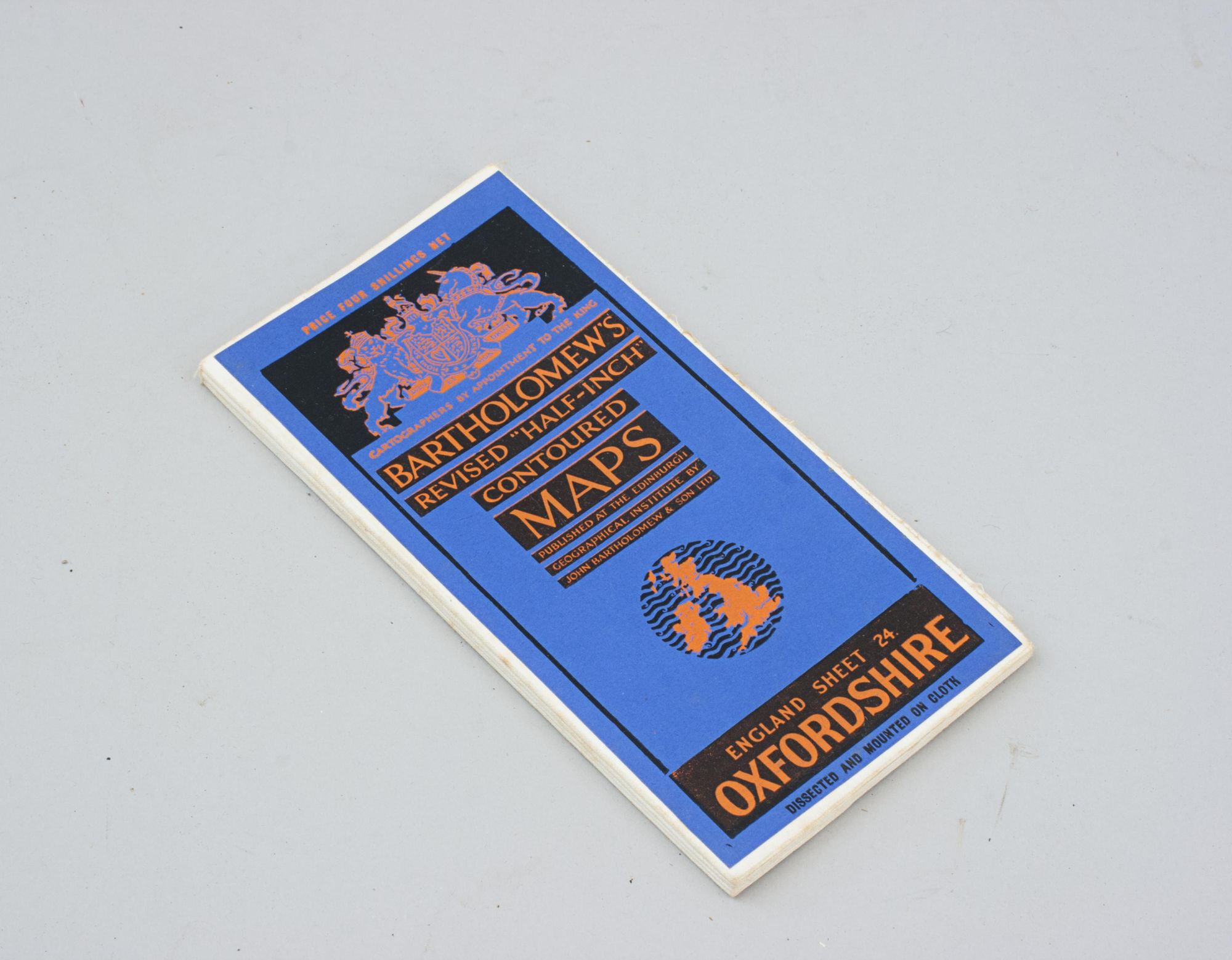 A vintage set of 37 Bartholomew's revised "Half-Inch" contoured road maps of Great Britain, housed in a hard leather travel case. Each map bears its own individual sheet number and corresponds to the full map of Great Britain printed on the reverse, which is divided into numbered sections to show how the sheets relate to one another. The maps were printed and published in Great Britain by John Bartholomew & Son Ltd., The Geographical Institute, Duncan Street, Edinburgh, reduced by permission from The Ordnance Survey, with special local revision to date of publication. The set is in good condition overall. Some maps have been replaced over the years due to regular use. The leather case remains in good order and features a central leather carry handle on the lid.