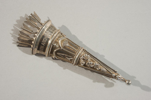 The coat of arms displayed on the helmet are for the county of Surrey. These arms were granted on the 8th August 1934, and were replaced on September 20, 1974. The sprig of oak and the colours azure and sable (blue and black) were retained and are in use on the current arms for Surrey,