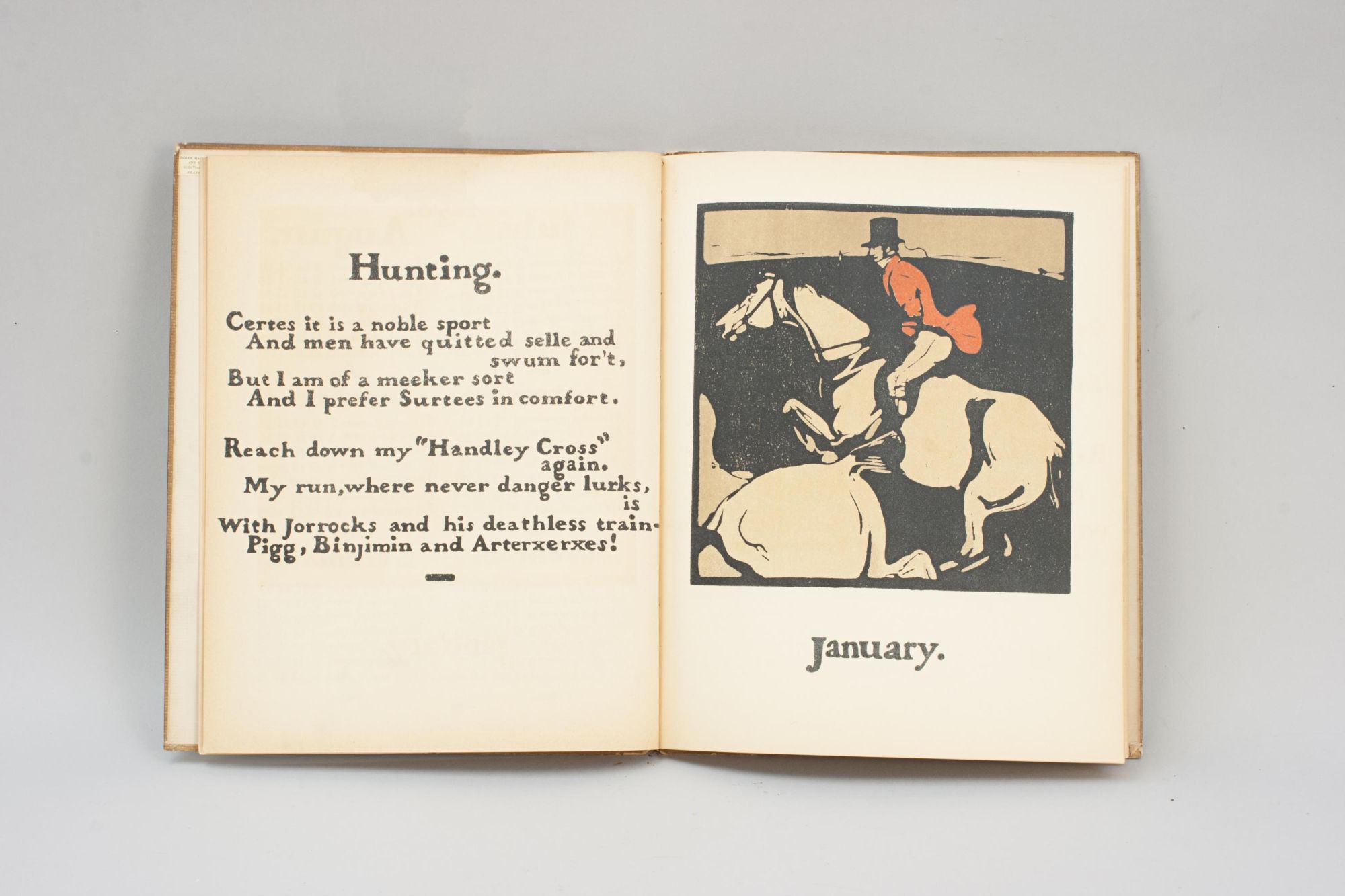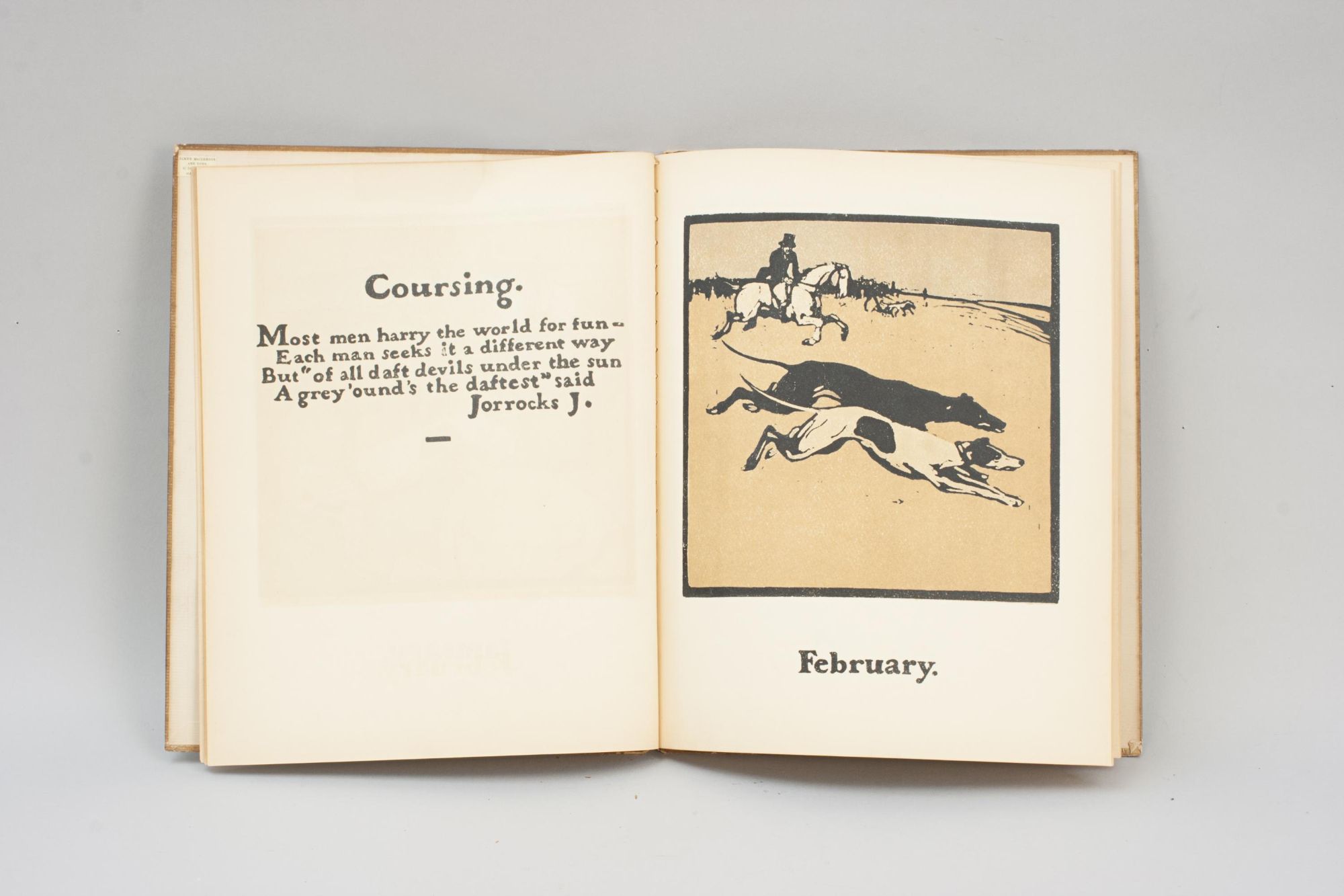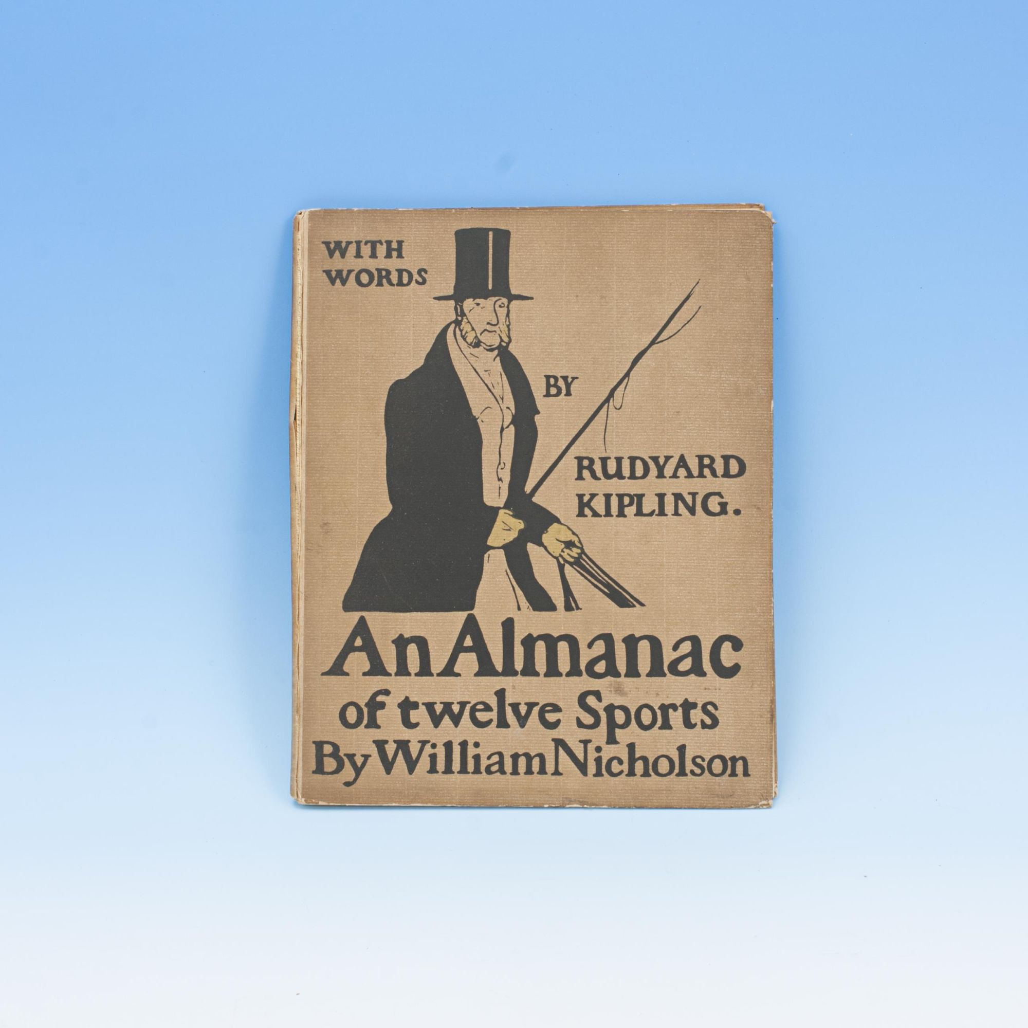 Rare 1st Edition (1897) - An Almanac of Twelve Sports by William Nicholson, with verses by Rudyard Kipling, published by William Heinemann, London, November 1897. This antique hardbound volume is a true collector's item from the Victorian era, featuring a calendar for 1898 and twelve full-page colour lithograph plates, each illustrating a classic English sport.
