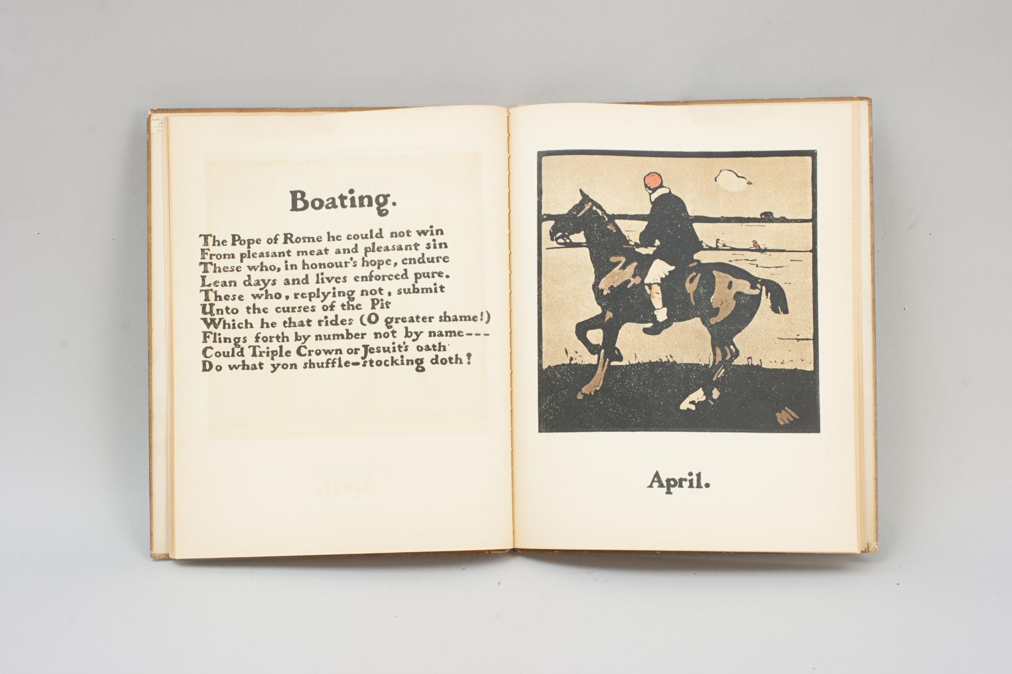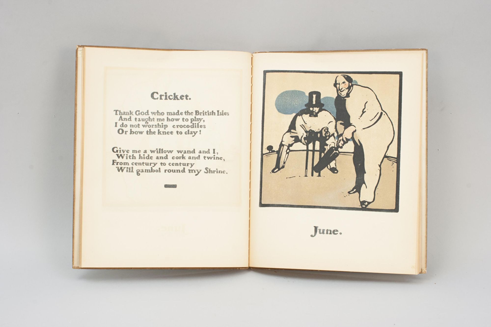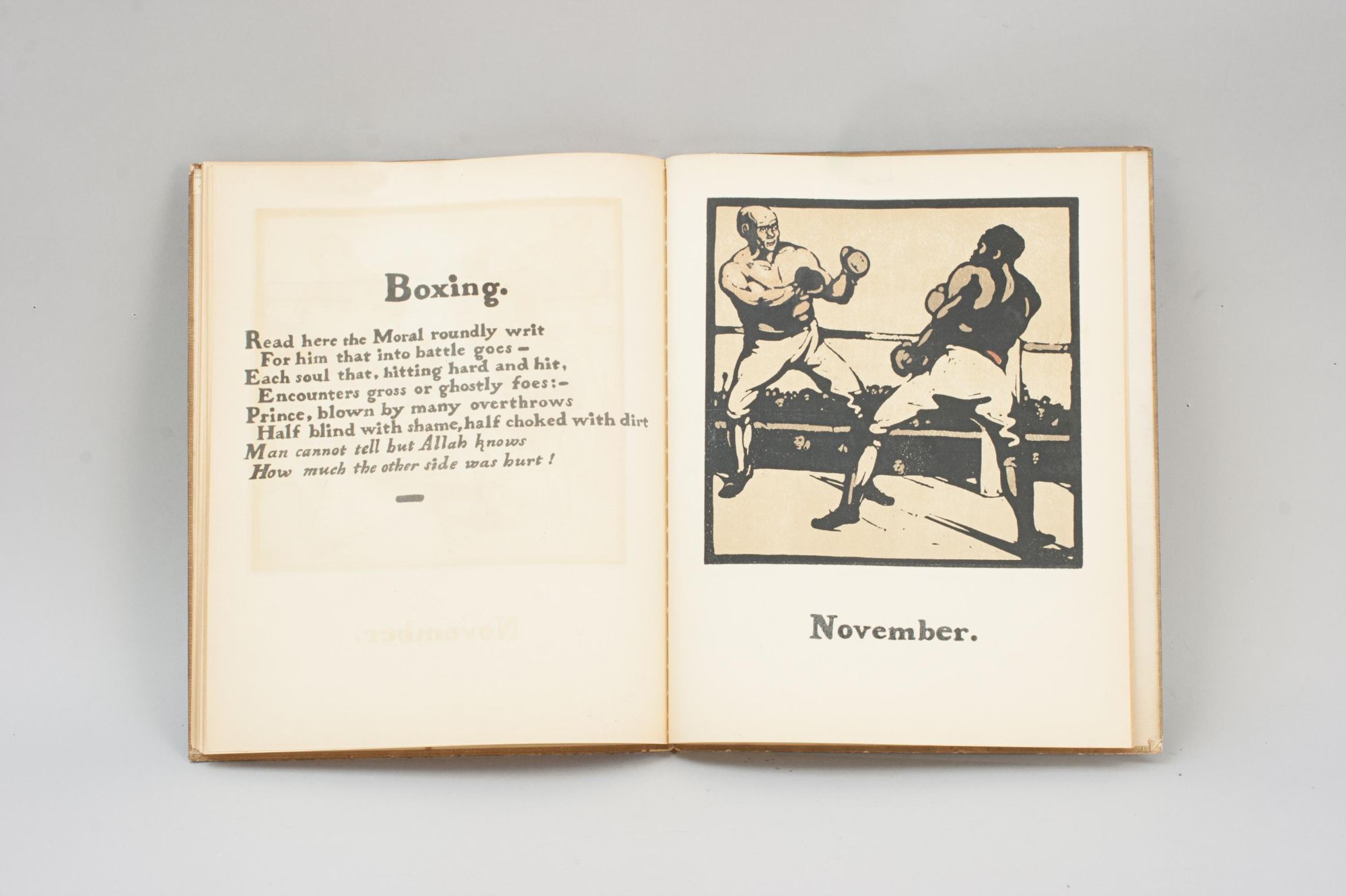 Each sport - Hunting, Coursing, Racing, Boating, Fishing, Cricket, Archery, Coaching, Shooting, Golf, Boxing, and Skating - is beautifully depicted by Nicholson's distinctive woodcut-style prints, paired with a witty and poetic verse by the celebrated author Rudyard Kipling on the facing page.