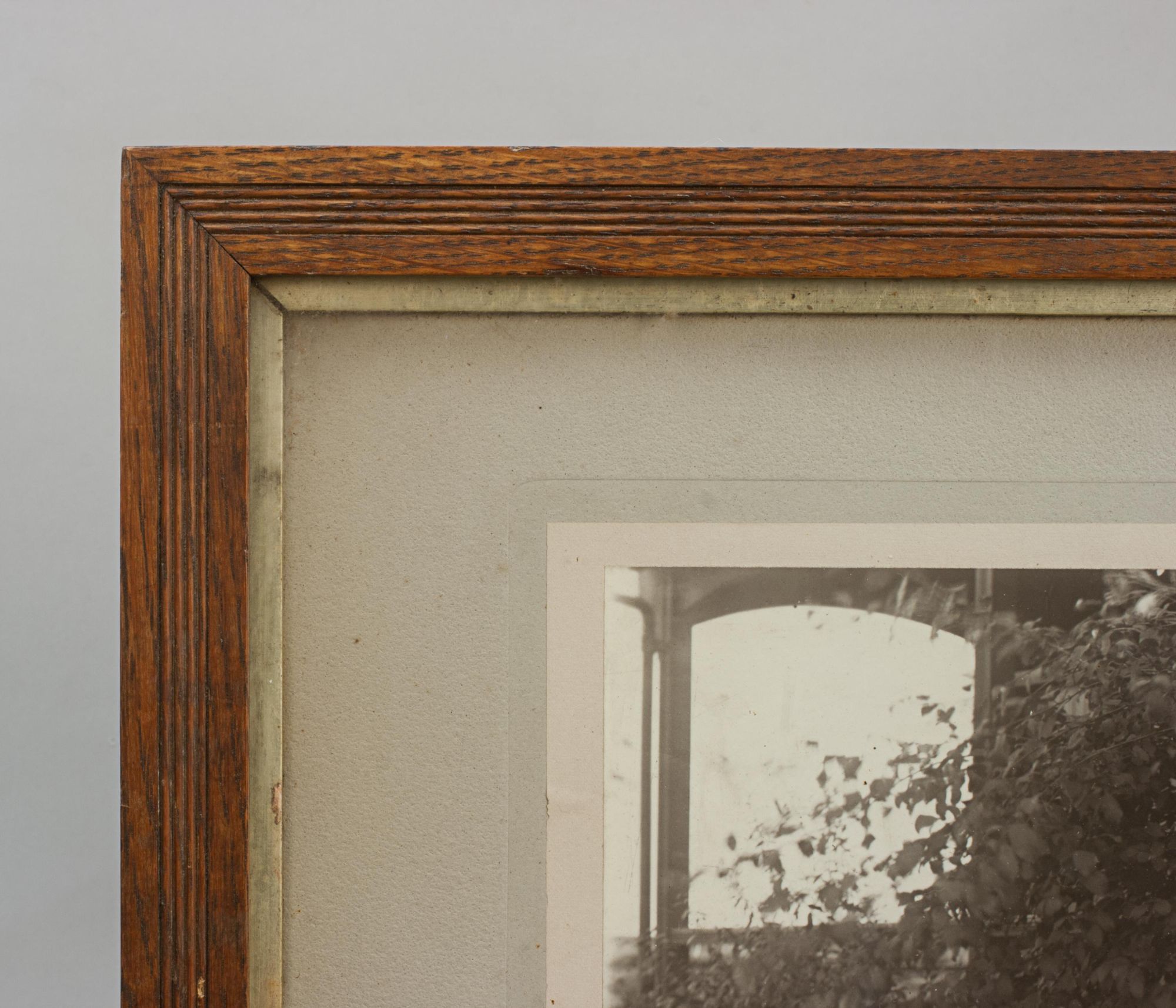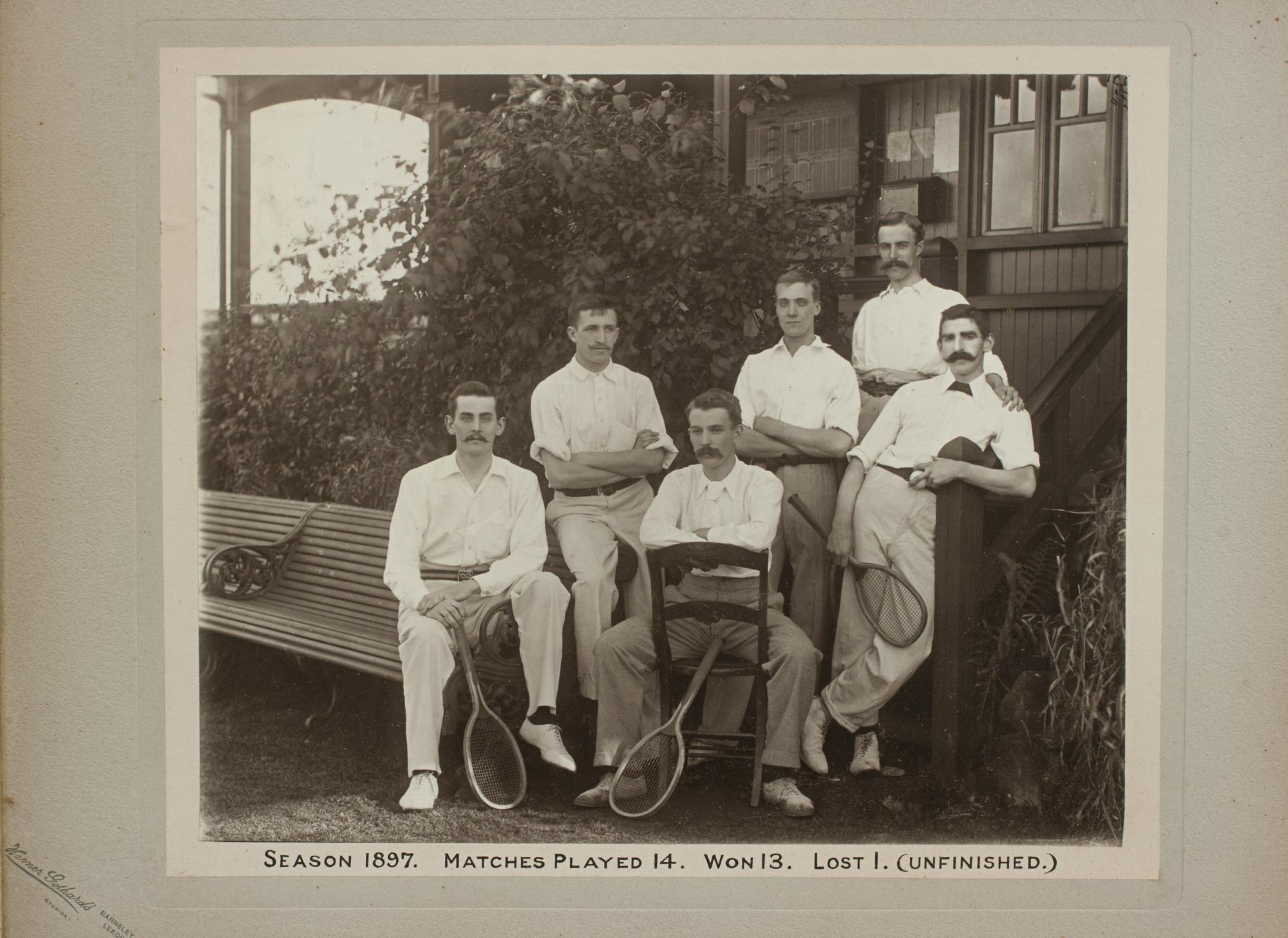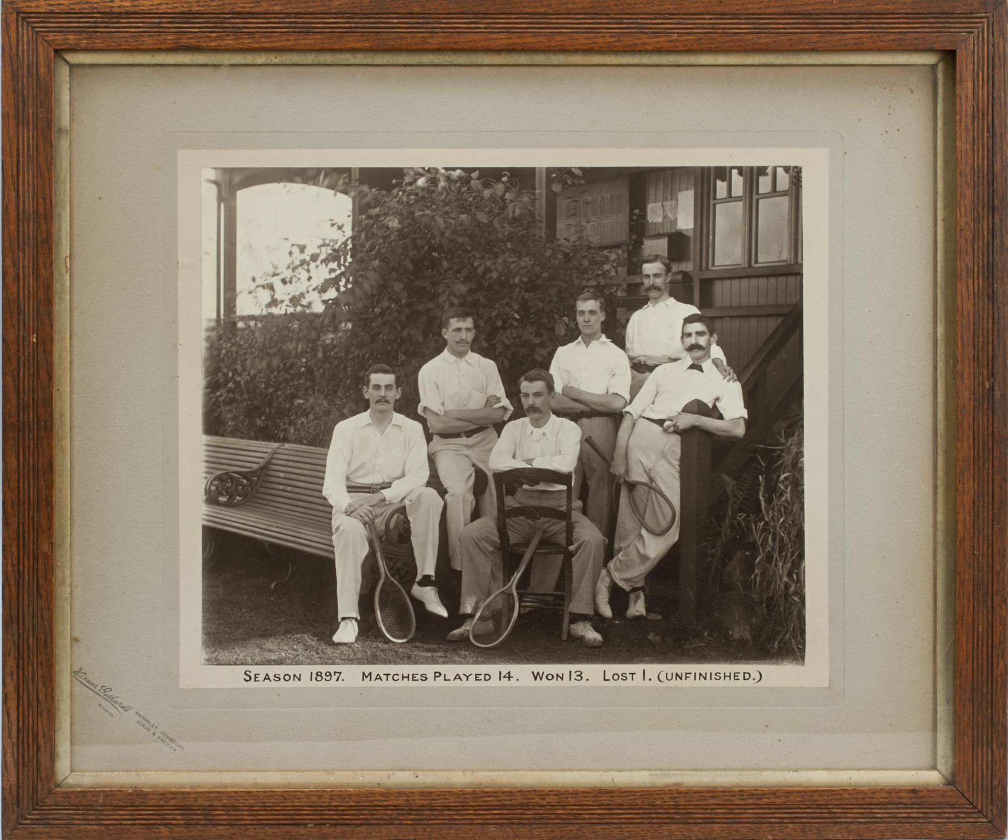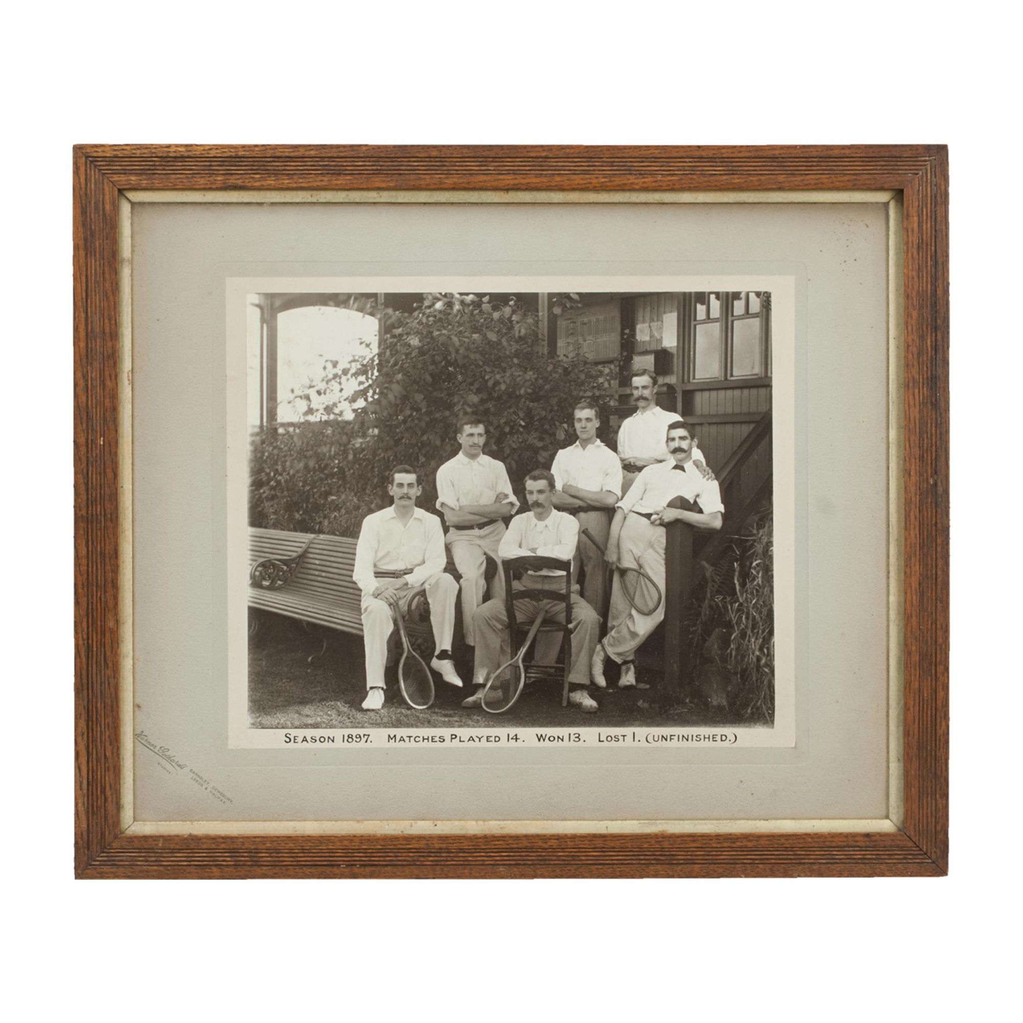 A superb early Lawn Tennis Club photograph dating from the 1897 season. Presented in its original period oak frame with glazing, the image shows six male tennis players in traditional late-Victorian tennis attire. Three players hold wooden rackets typical of the era - one possibly a flat-top model, and the others appearing to be a matching pair. Each features plain wooden handles with leather butt caps and no added wrappings (leather or cloth) on the handles.
