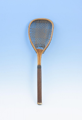 An Edwardian silver sprung-loaded paper clip in the form of a flat top tennis racket with open stringing. The well made racket is mounted onto an oak back board, made by Adie & Lovkin Ltd of Birmingham, hallmarked 1905.