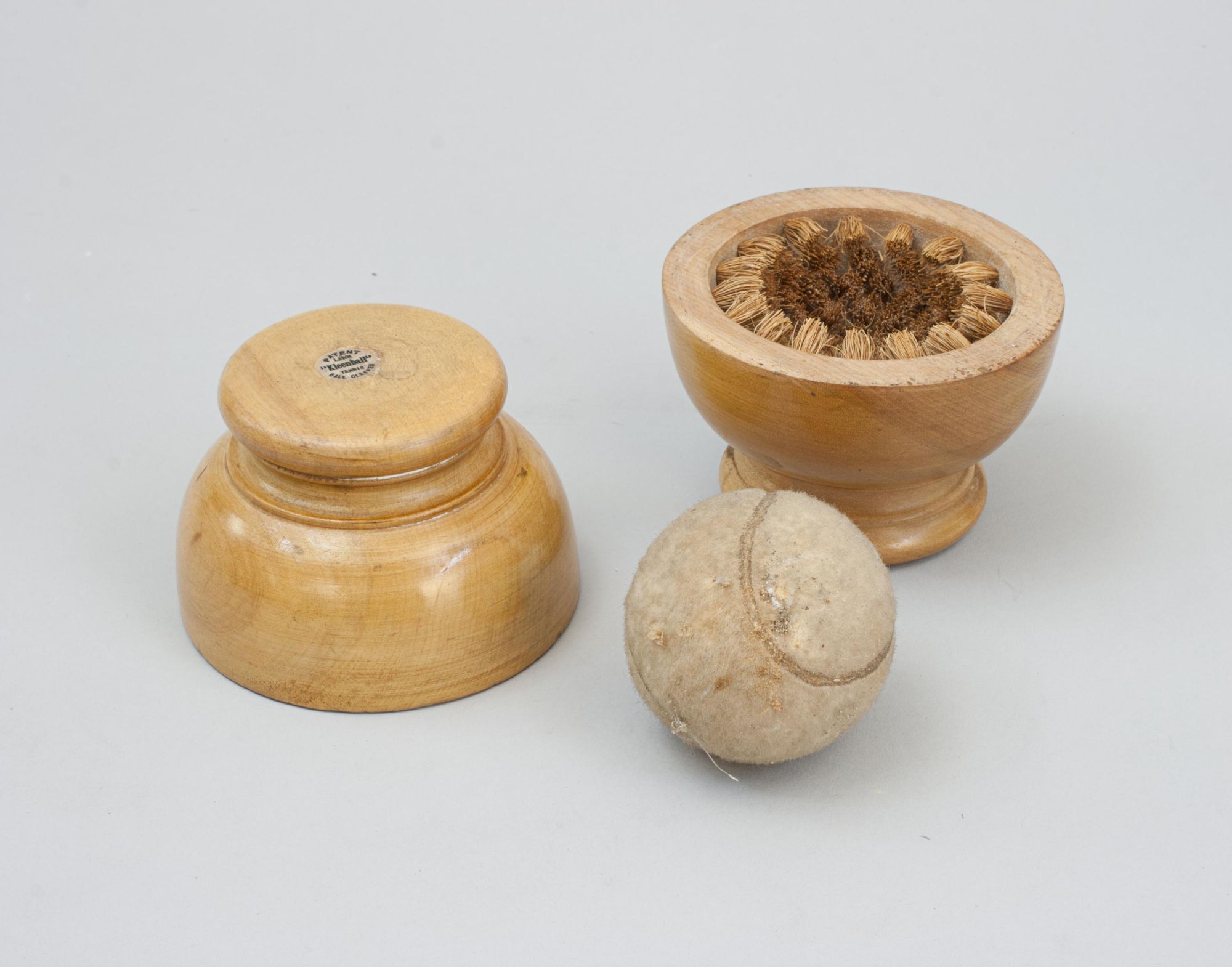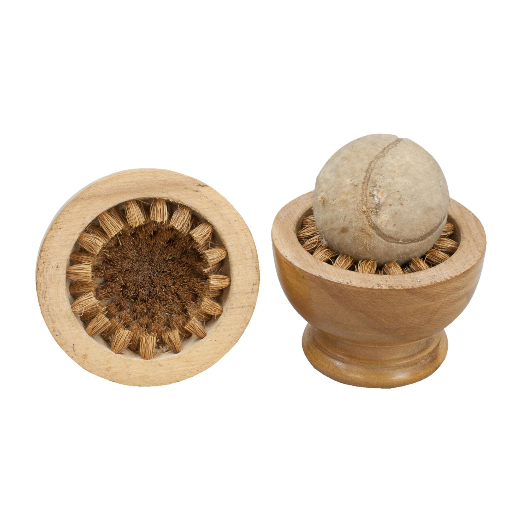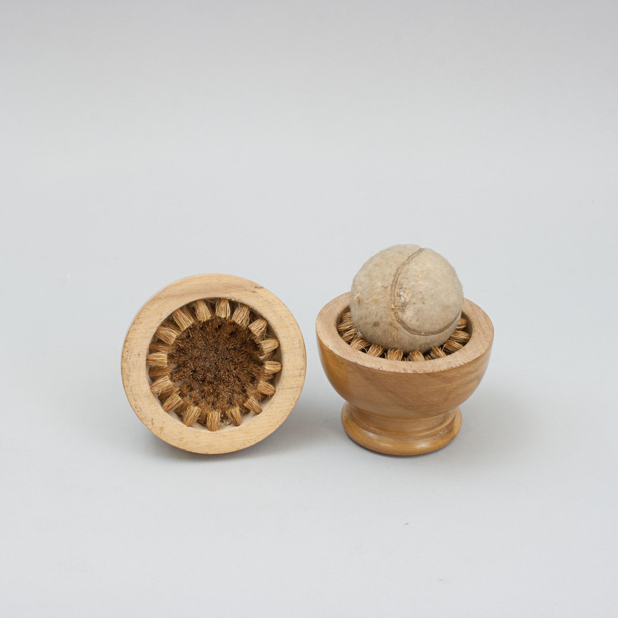 A very good example of a hand held lawn tennis ball cleaner called the "Kleenball", which appears to had very minimal use. The cleaner is made up of two cylindrical wooden cups with a series of short concentrically arranged bristles inside each half. A tennis ball is placed inside one half with the other half being placed on top. The two cups are then rotated against each other, effectively brushing the ball clean. One half of the cleaner has an inset circular ivorine plaque which reads 'PATENT lawn "Kleenball" Tennis Ball Cleaner'.