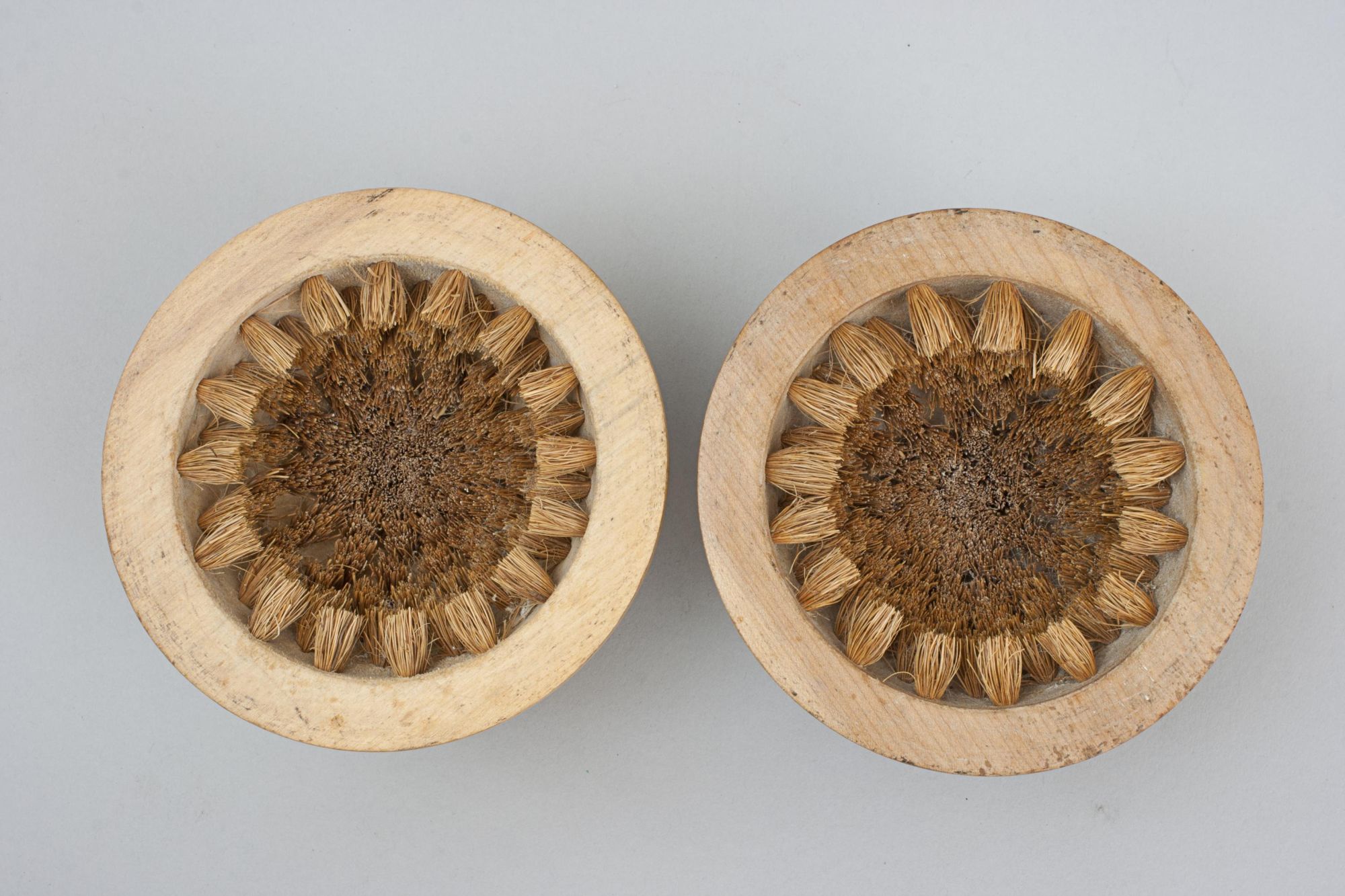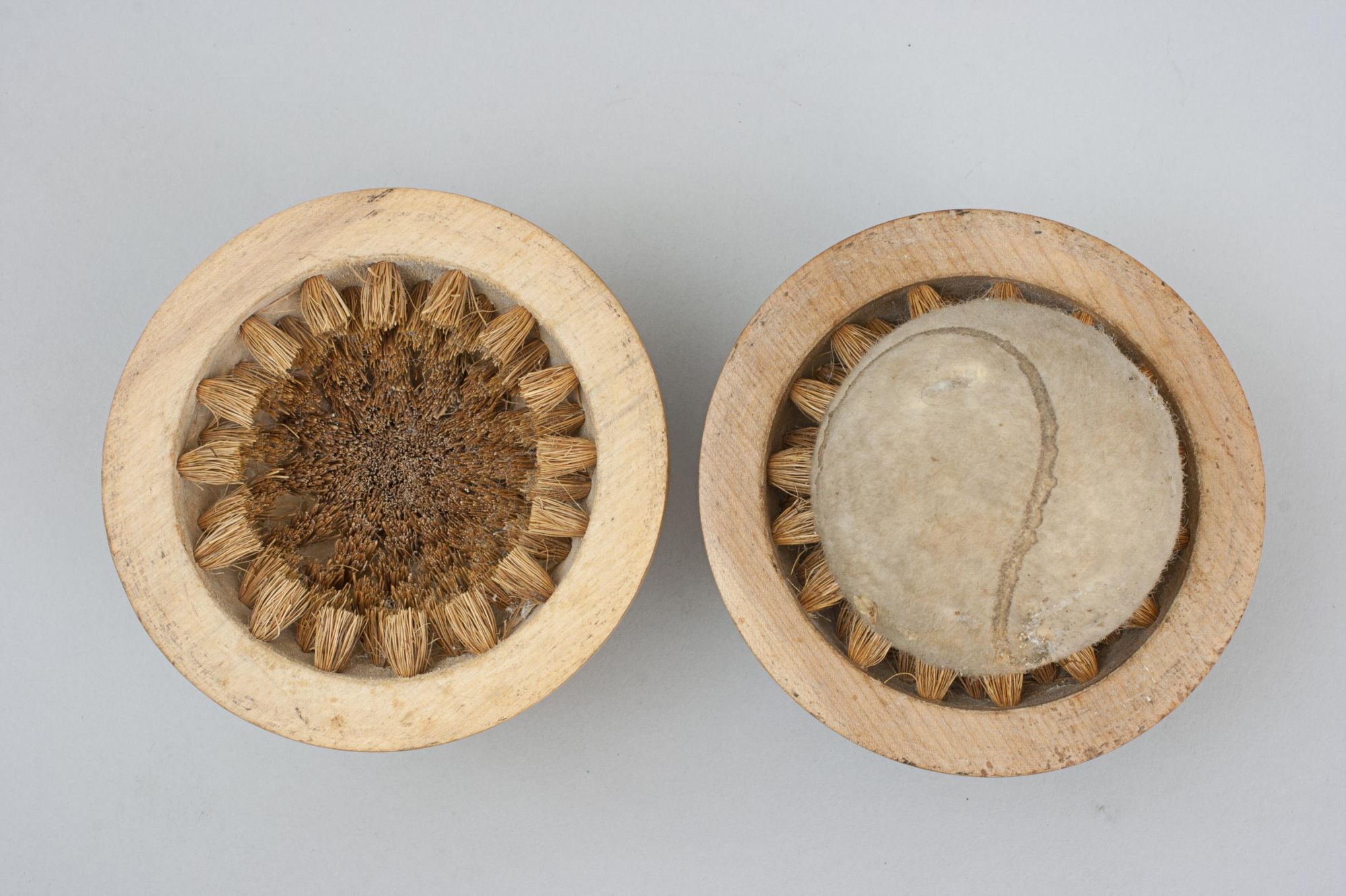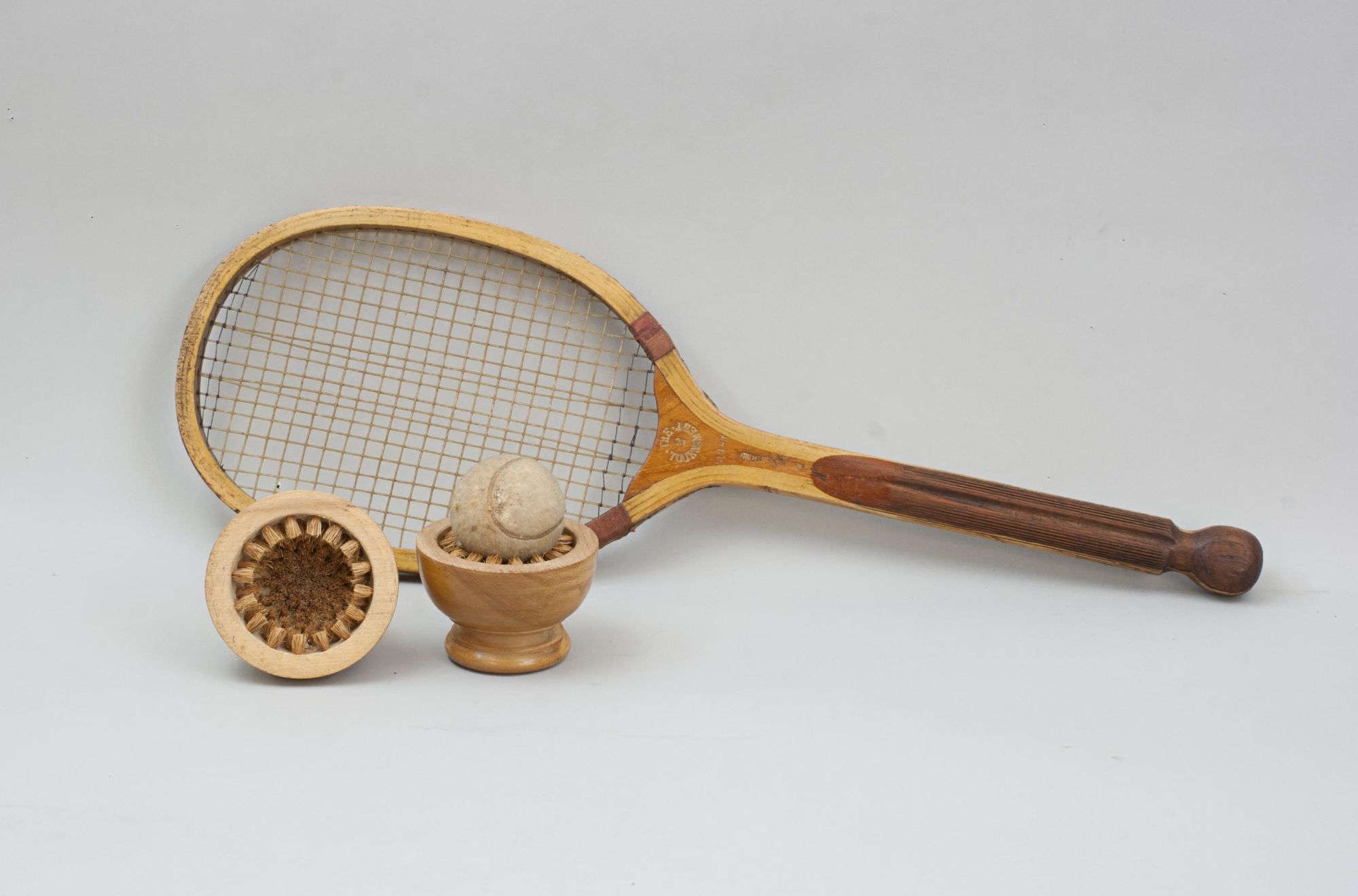 A very good example of a hand held lawn tennis ball cleaner called the "Kleenball", which appears to had very minimal use. The cleaner is made up of two cylindrical wooden cups with a series of short concentrically arranged bristles inside each half. A tennis ball is placed inside one half with the other half being placed on top. The two cups are then rotated against each other, effectively brushing the ball clean. One half of the cleaner has an inset circular ivorine plaque which reads 'PATENT lawn "Kleenball" Tennis Ball Cleaner'.