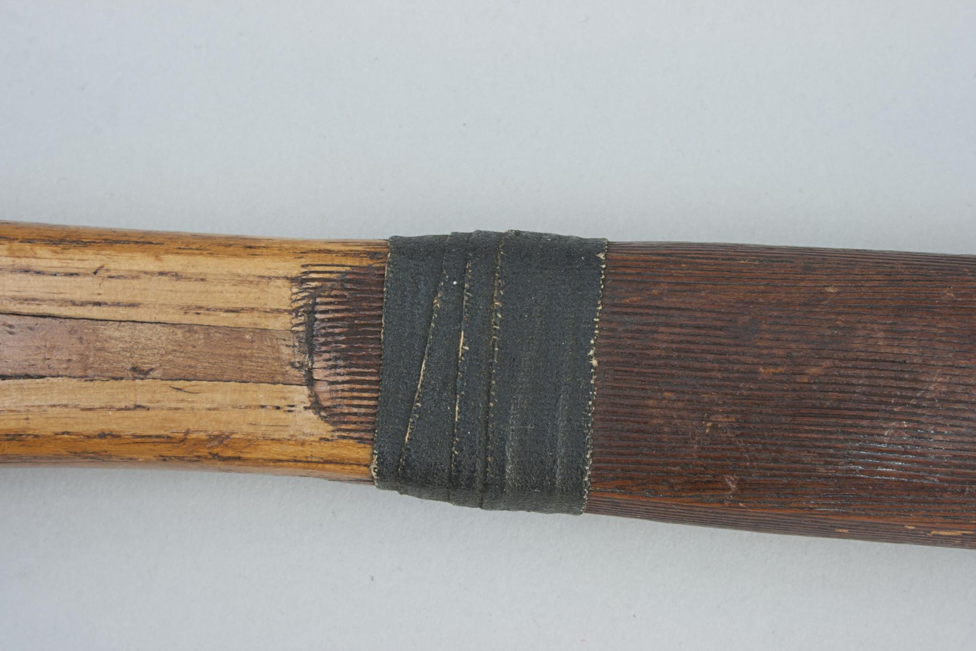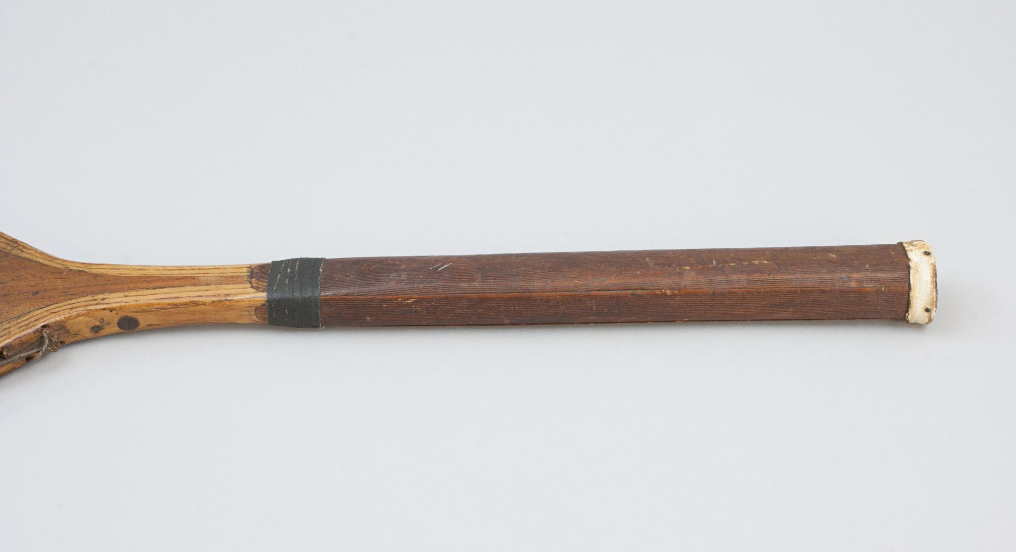 The handle grip is formed from the ash frame incorporating part of the walnut wedge, with applied cedar handle pieces. These are finely grooved for improved grip, and the handle is finished with a leather butt strip. The original leather collar is no longer present and has been replaced with black tape; however, the remainder of the racket retains a strong level of originality.