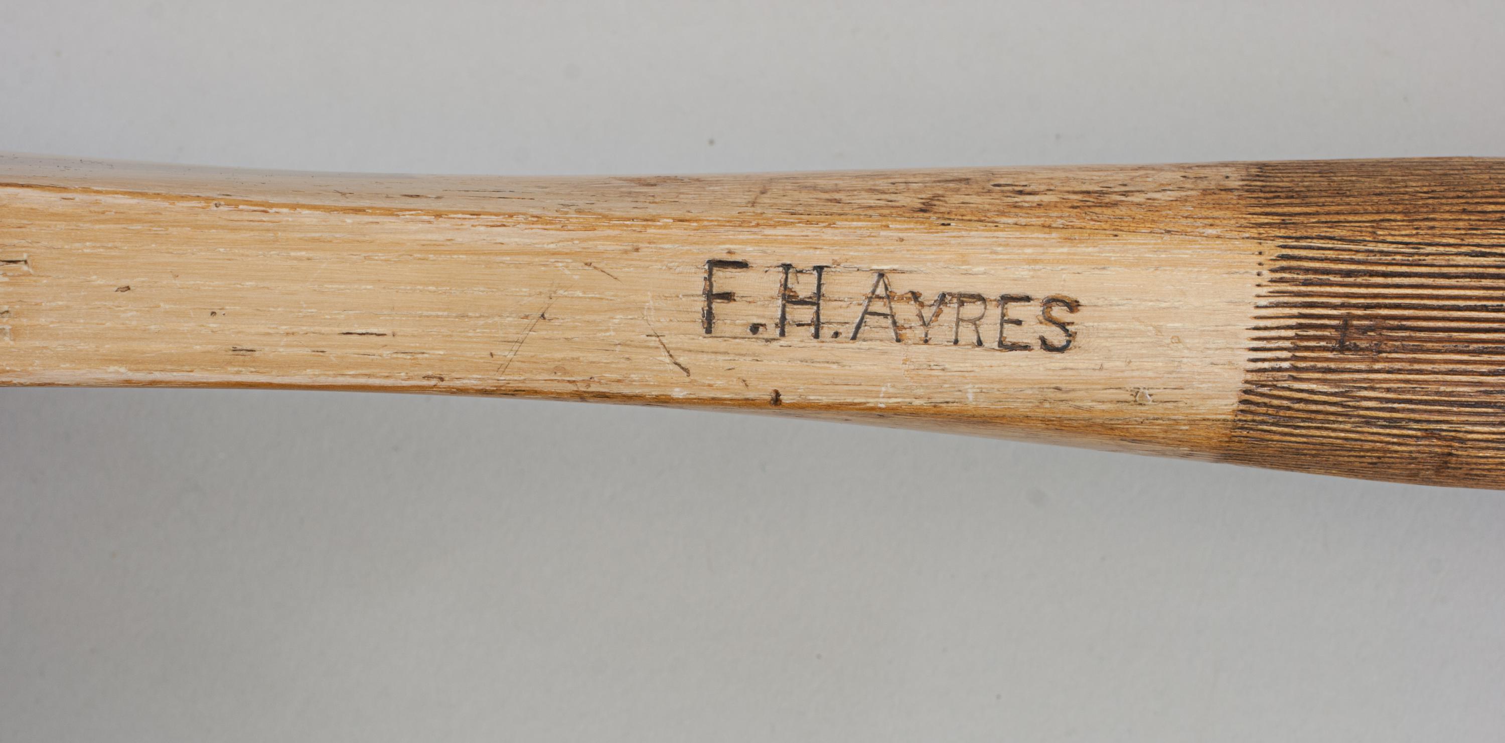 A lawn tennis racket by F.H. Ayres with a very nice unusual ash frame with concave walnut wedge. The frame is chamfered on both edges, wedge is stamped in gilt 'Tournament'. Handle with a very attractive shaped fishtail, stamped 'F.H. AYRES' on one side and ' 44 RS' on the other. The handle also with a deep central groove and with thin lined grooves for extra grip. Stringing is original but in poor condition, it has three double central strings, red horizontal stringing, white vertical strings and three rows of black trebling to the top and bottom. A good fine example of a fishtail racket even if the strings aren't perfect.
