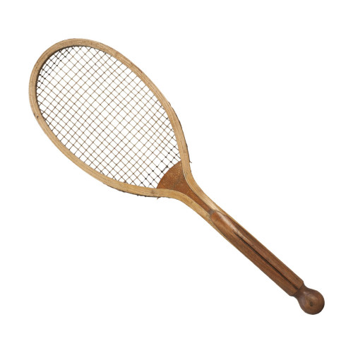 A good real tennis racket with original black stringing (one broken string) made by T.A.J. Harris, London. The ash frame in good condition with the characteristic offset or tilt-top shape. There is the remains of a label on the side of the square handle "T.A.J. Harris", the butt of the handle stamped 'Harris'.