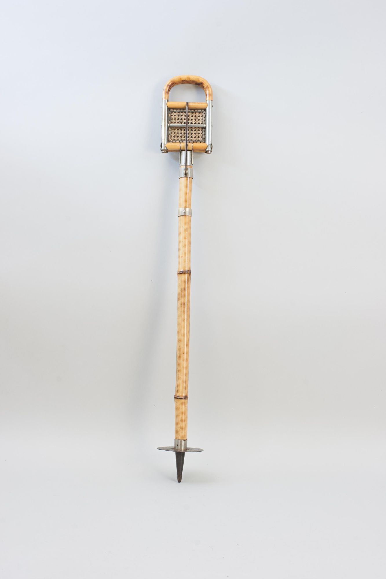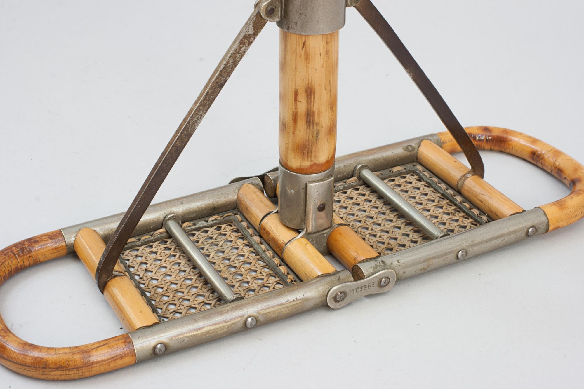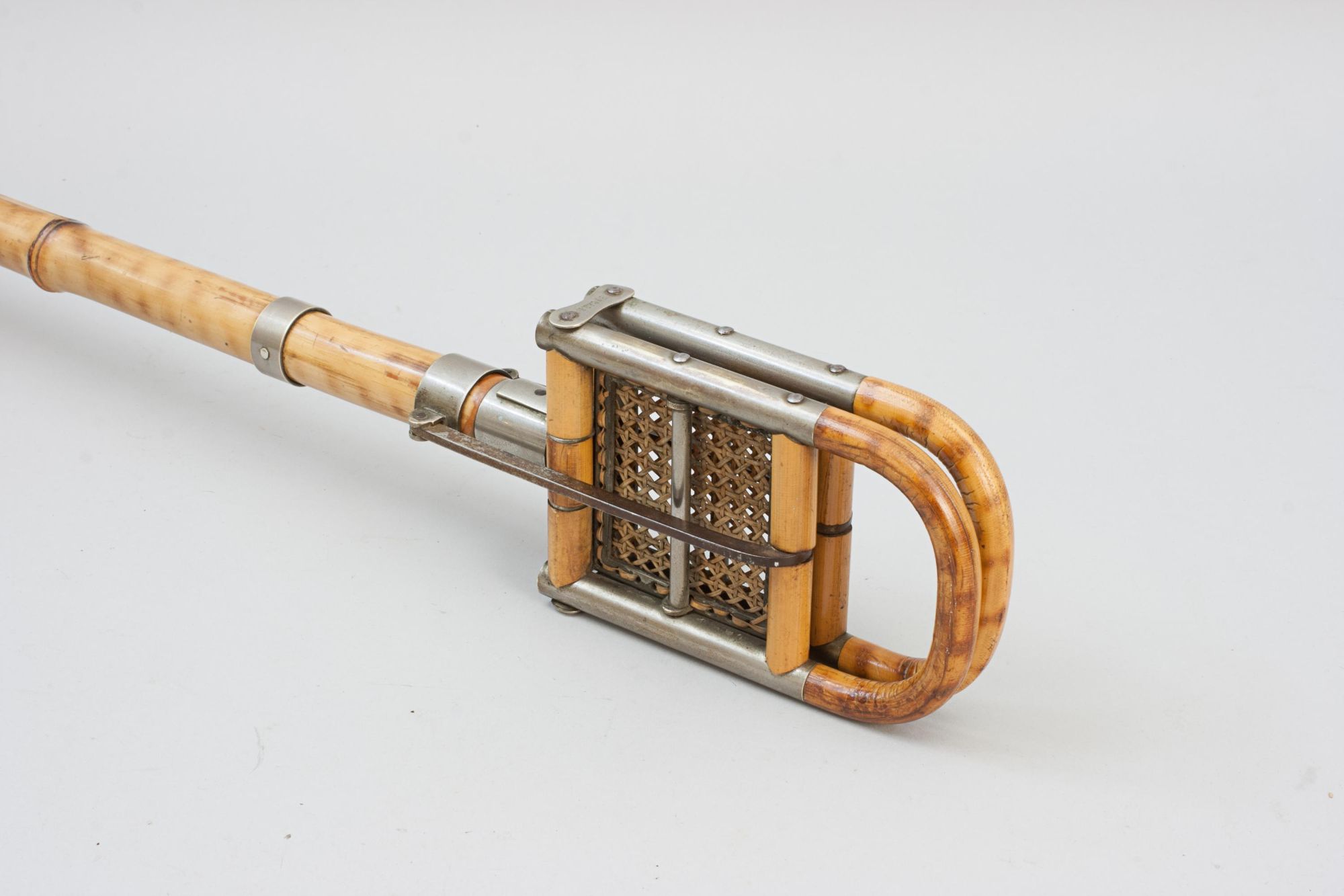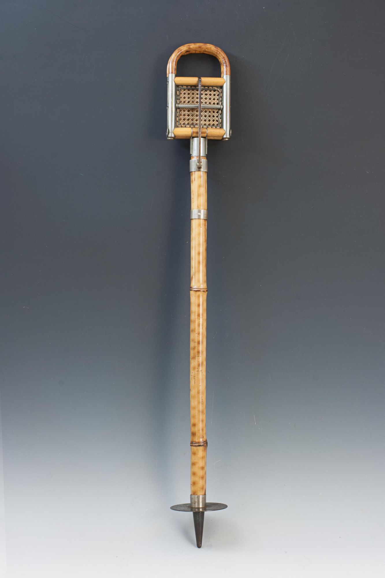 A good quality and attractive late Victorian folding bamboo sports seat, shooting stick with finely woven cane seat. Designed to serve both as a practical walking stick and a convenient portable seat, it features nickel plated fittings and a decorative bamboo shaft with a metal point and disc at the base to provide stability on softer ground. The seat is stamped BTE. S.G.D.G. an abbreviation of the French term "Breveté Sans Garantie Du Gouvernement", meaning: "Patent without guarantee of the government", this was used in France for patented items until 1968.