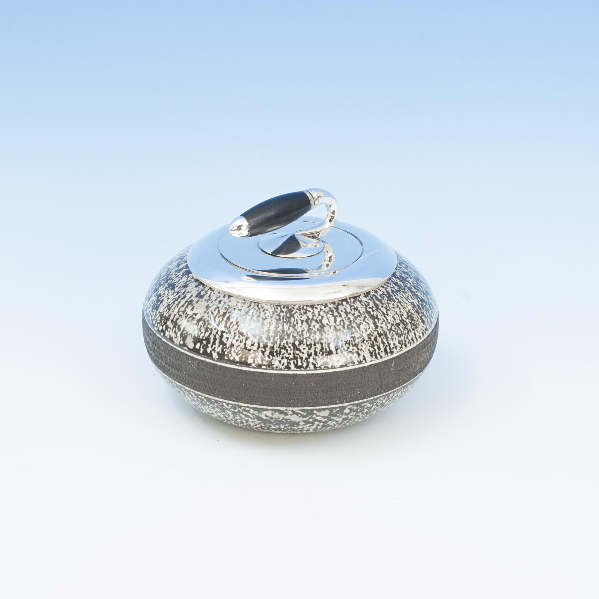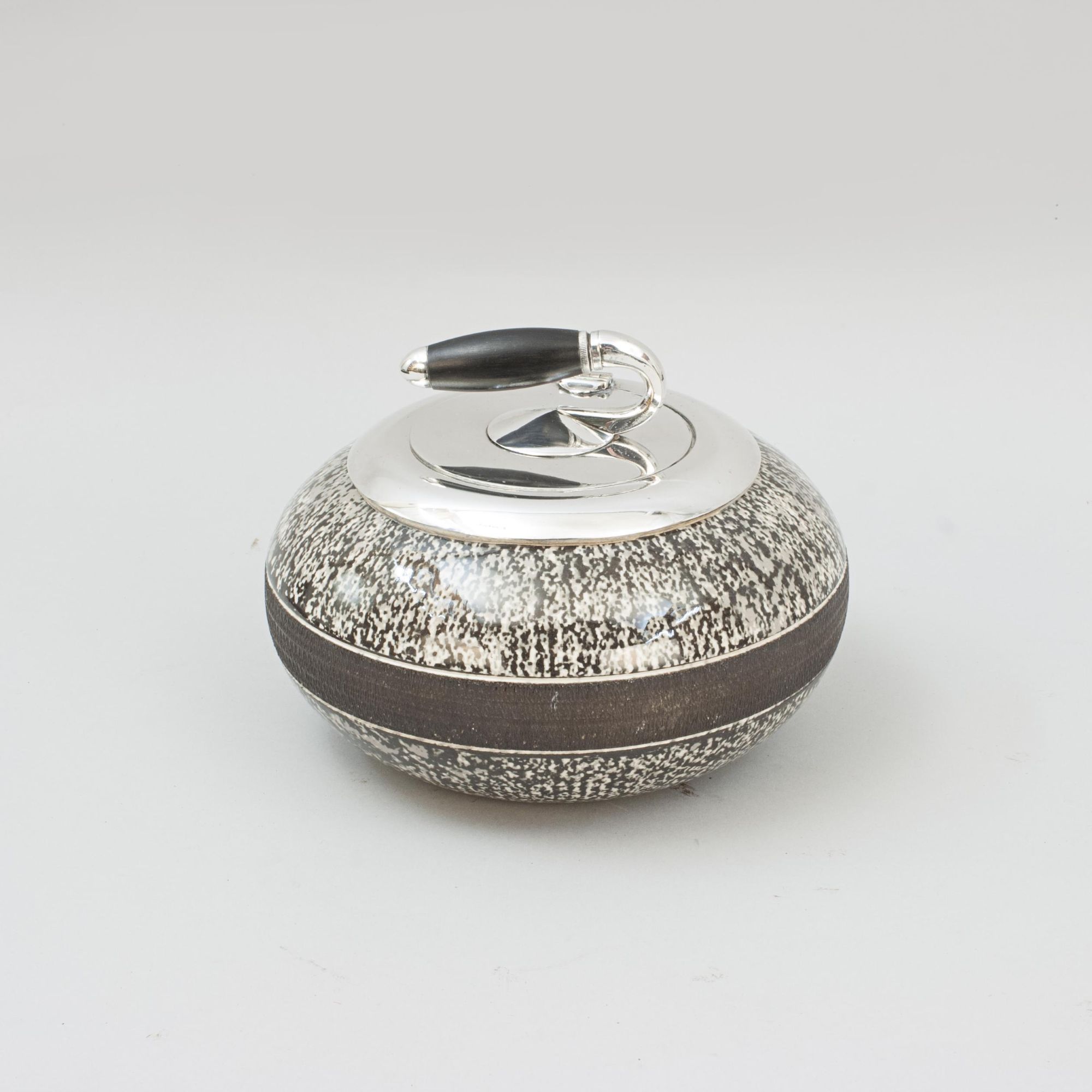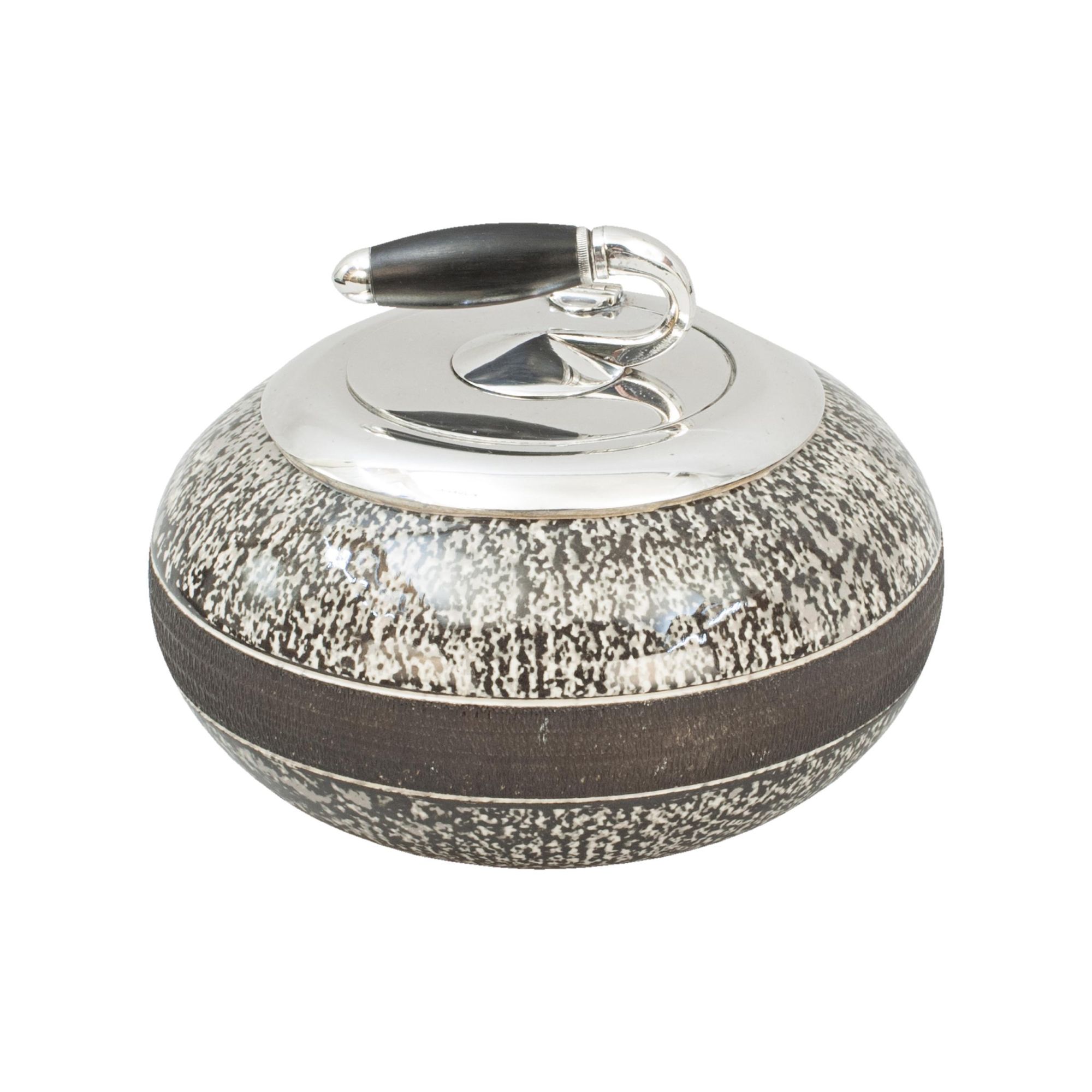 A rare and highly collectible Carlton Ware ceramic curling stone jar, produced by Wiltshaw & Robinson of Stoke-on-Trent. This charming novelty piece was originally intended as a tobacco or biscuit jar. The main body is modelled in the form of a granite curling stone, complete with a plated hinged lid stamped with Design Registration No. 246614, dating the design to 1895. The lid is topped with a traditional curling stone handle which, when turned, opens the jar. The piece displays excellent attention to detail and exemplifies Carlton Ware's late Victorian novelty production. The base is clearly stamped "Carlton Ware" along with "W & R" (Wiltshaw & Robinson), the W & R crown mark, Stoke-on-Trent.