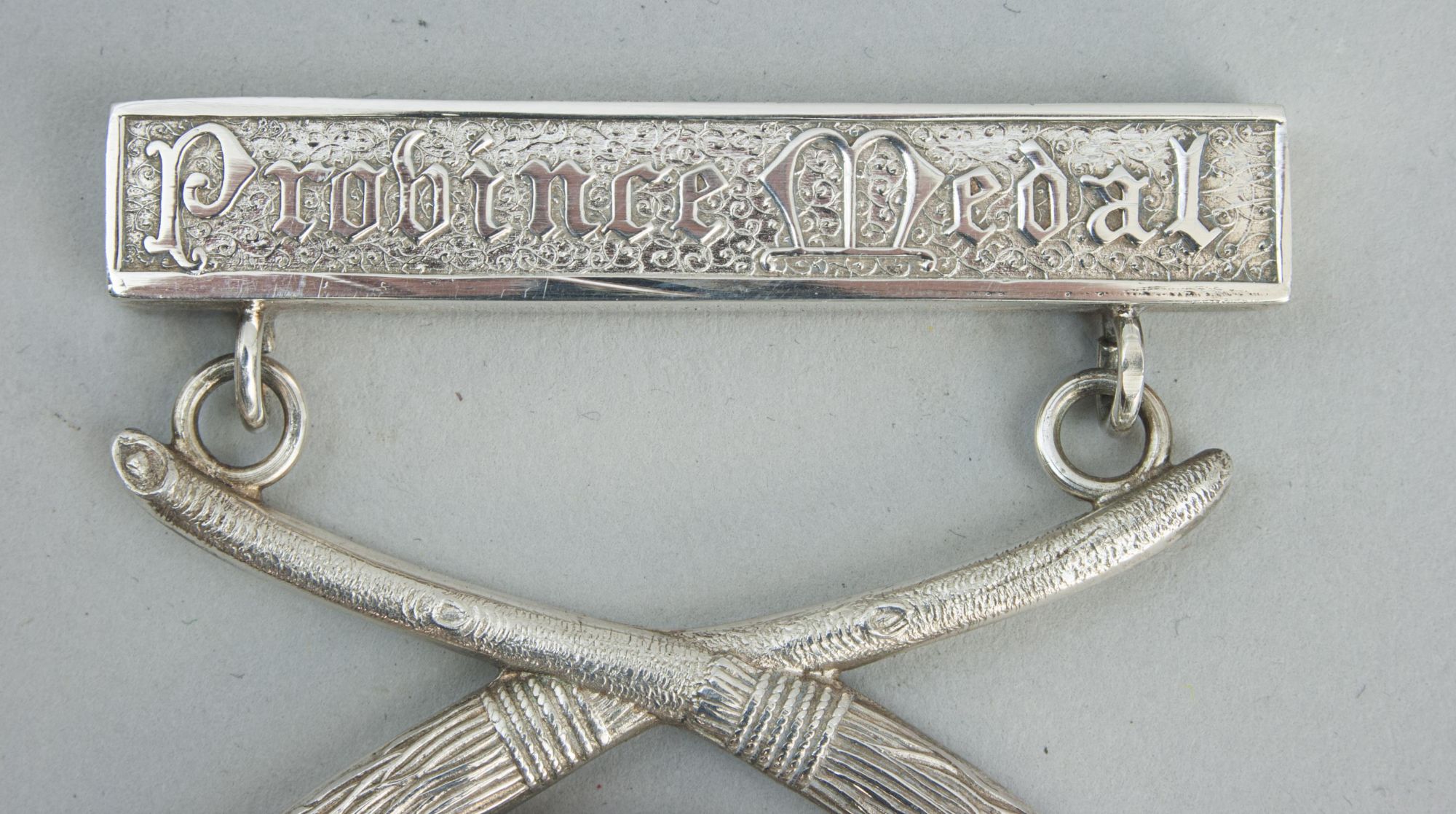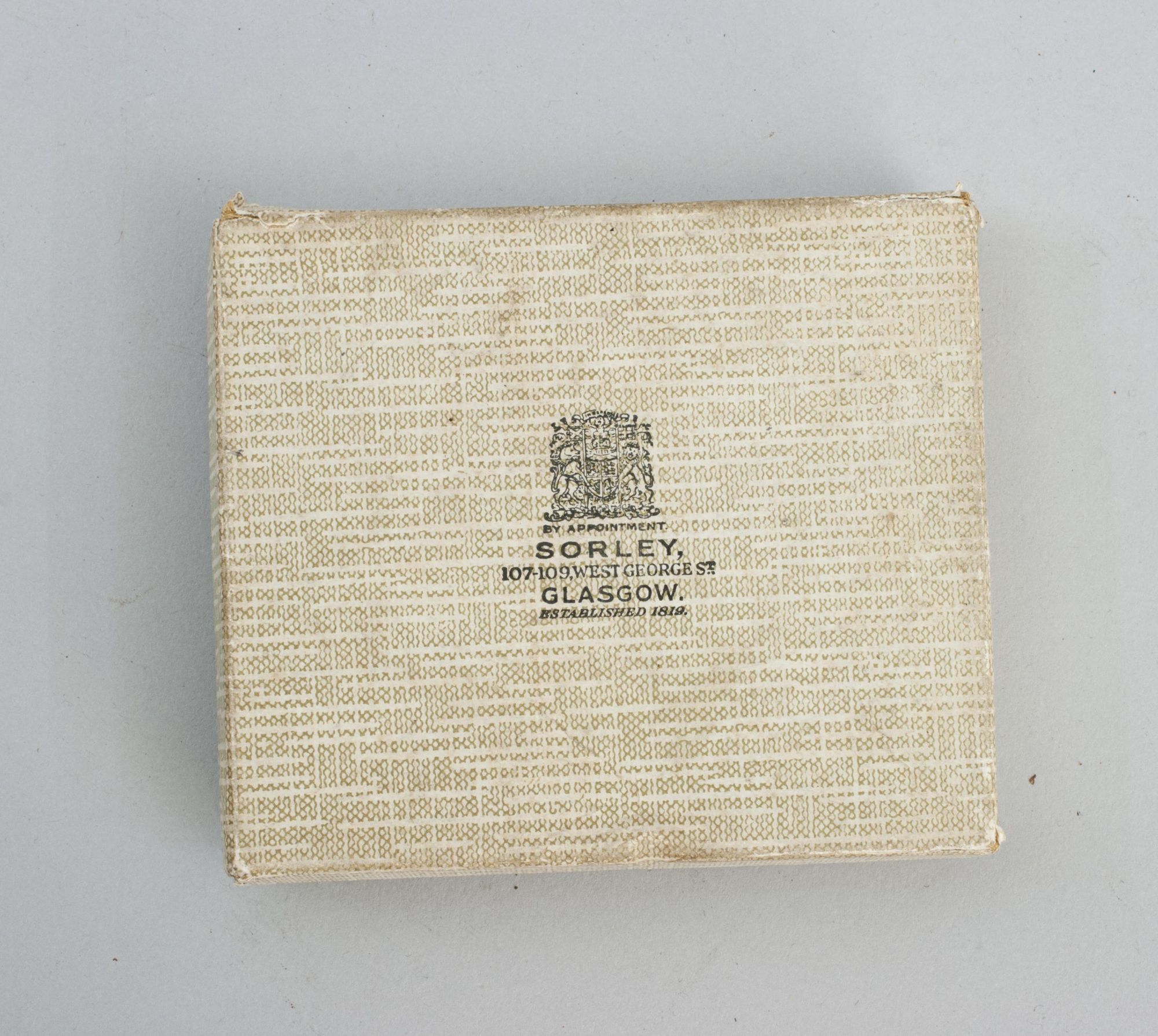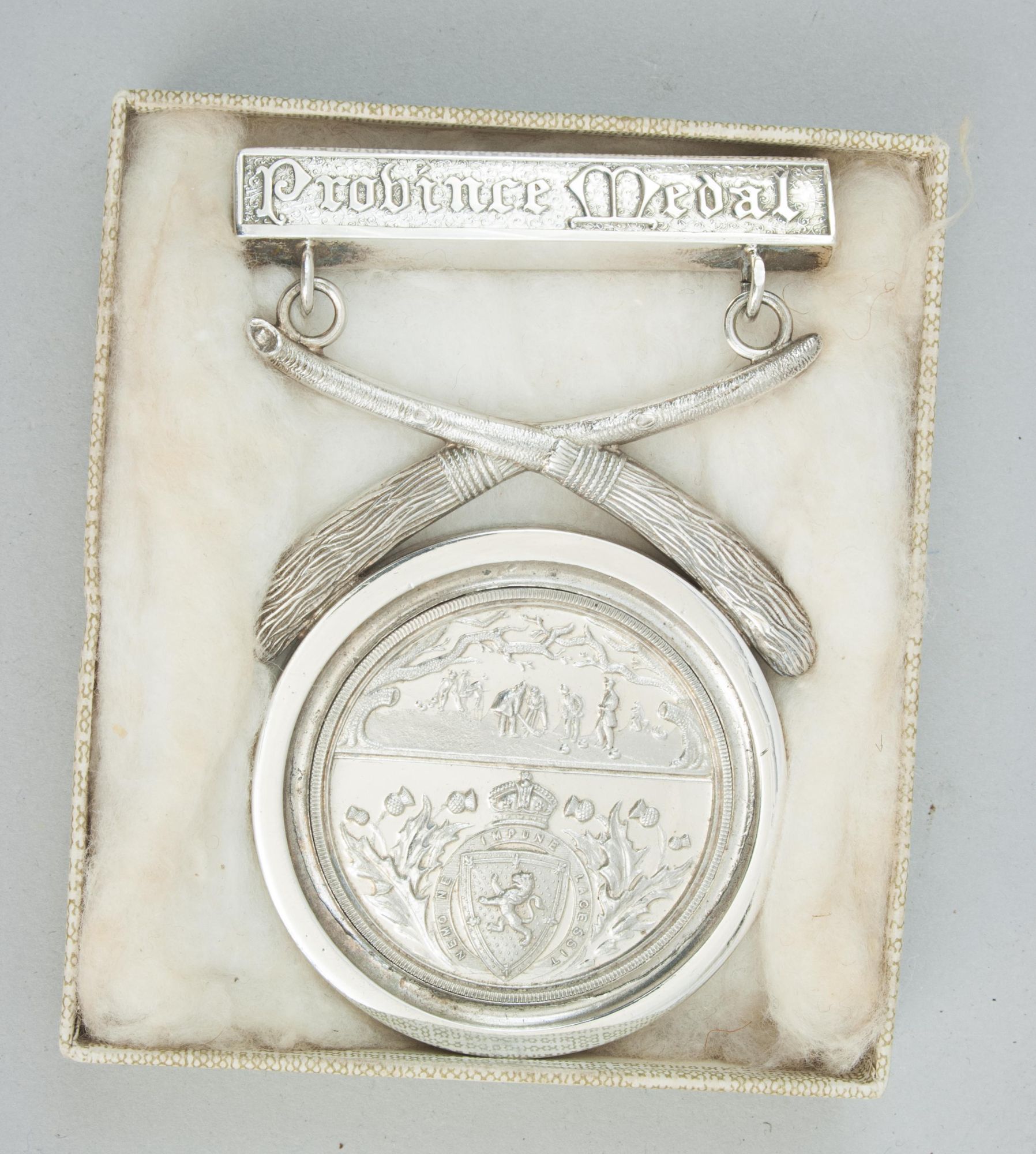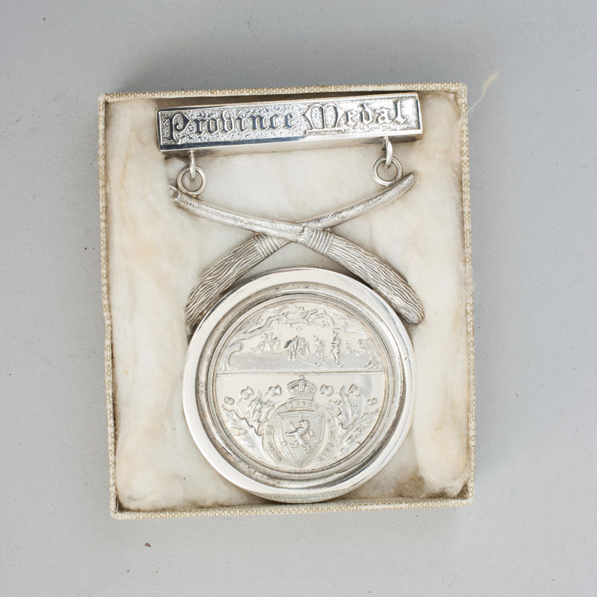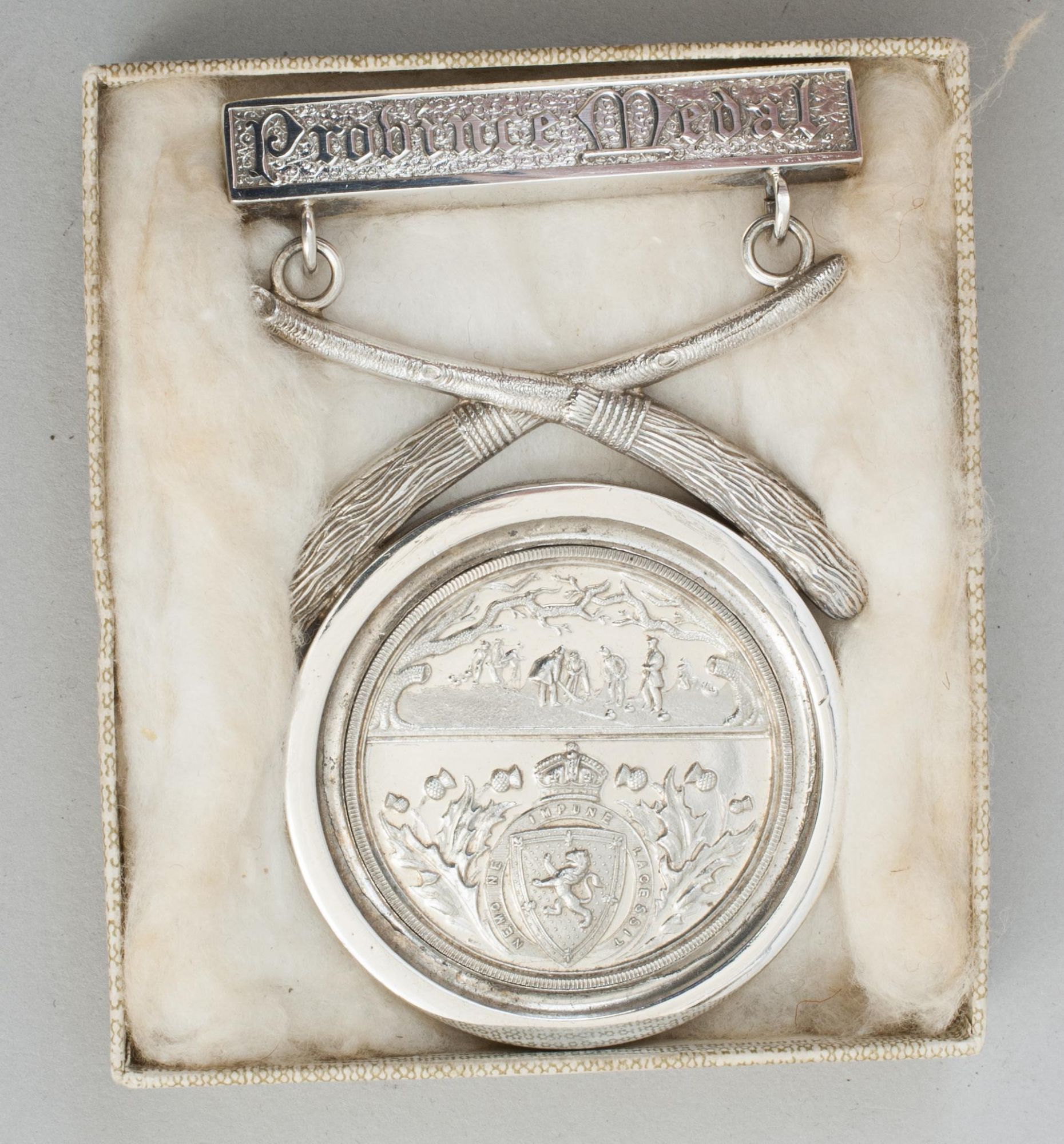 An unused, silver, curling 'Province Medal' with ribbon bar from the Royal Caledonian Curling Club. The curling medallion is fully hallmarked, displaying the lion passant for sterling silver, the anchor assay mark for Birmingham, and the date letter "M" corresponding to 1936, along with the maker's mark "J.A.R. ltd" (J A Restall Ltd). and comes in a SORLEY 107 - 109 West Georges Street, Glasgow cardboard box. The reverse embossed 'Royal Caledonian Curling Club, Instituted 25 July 1838, the front depicts a curling match in play with the Scotland Coat of arms surrounded by thistles. The coat of arms with national motto of the Kingdom of Scotland 'Nemo Ne Impune Lacessit' - 'No One Provokes Me With Impunity'. The ribbon bar is connected to the medal with two crossed curling brushes (also known as besom, brush, corn broom or besum). A wonderful piece of curling history.