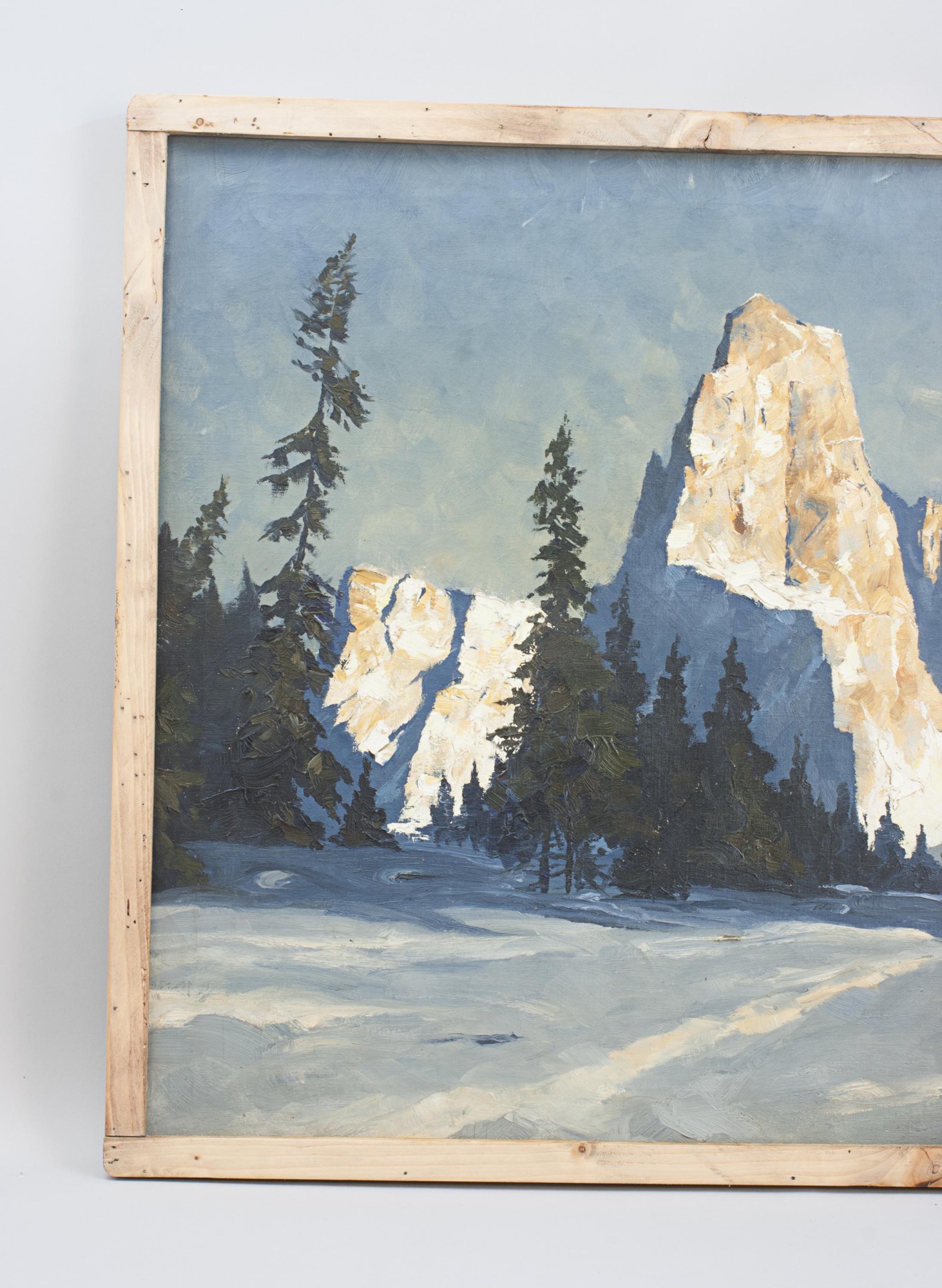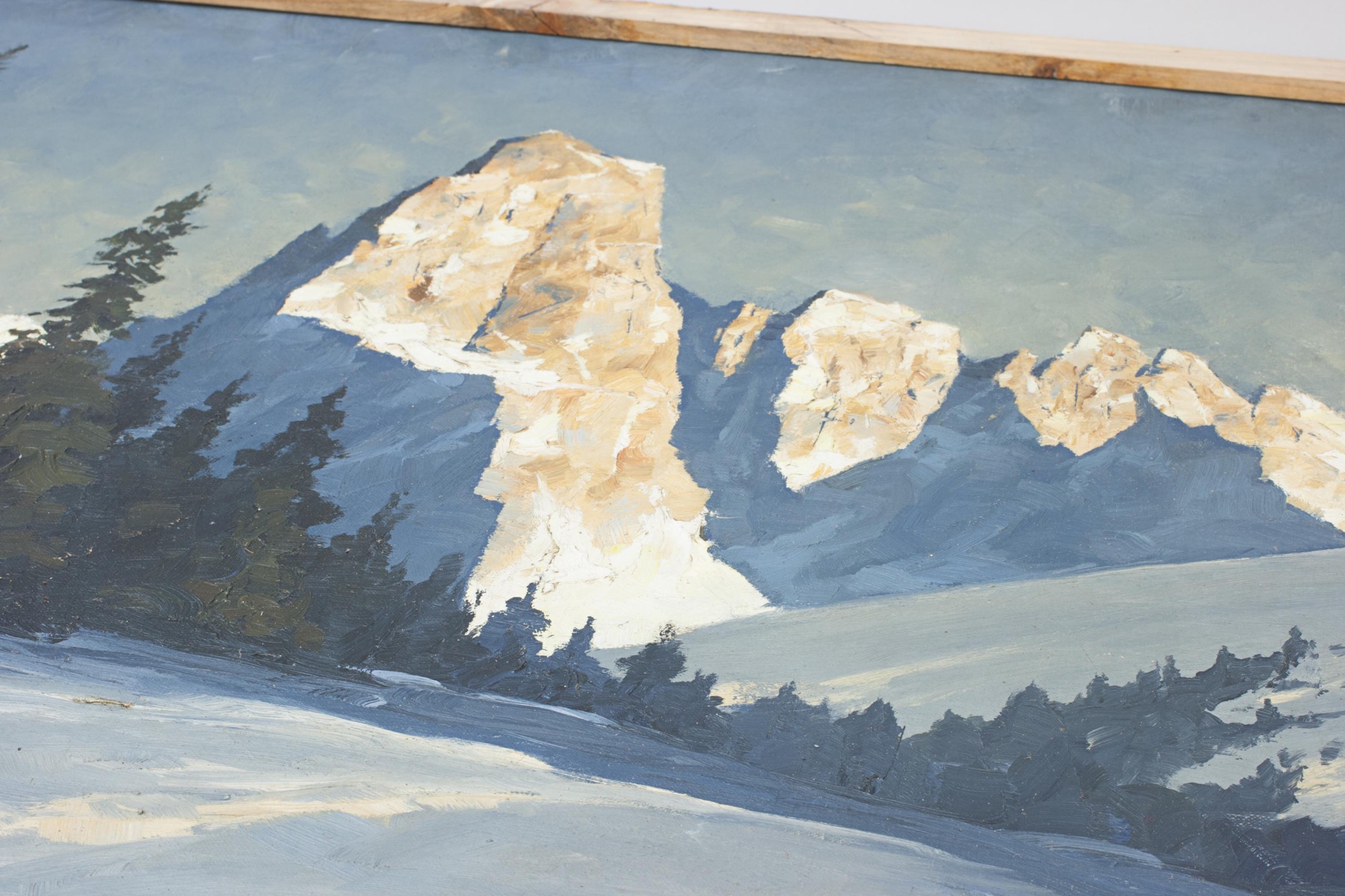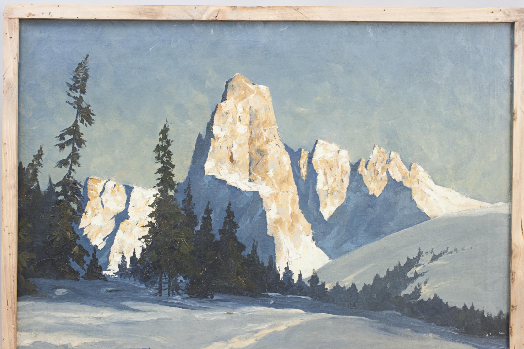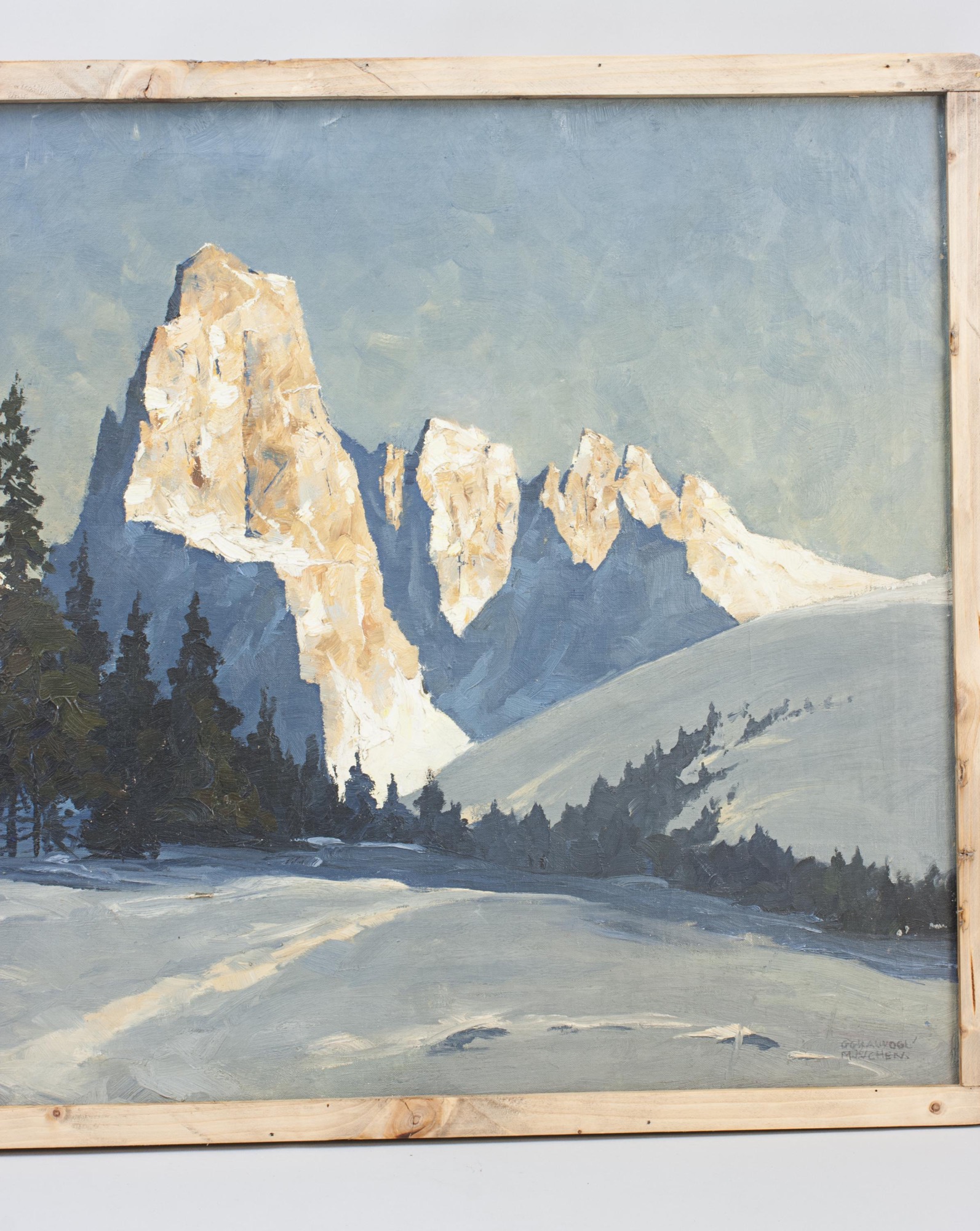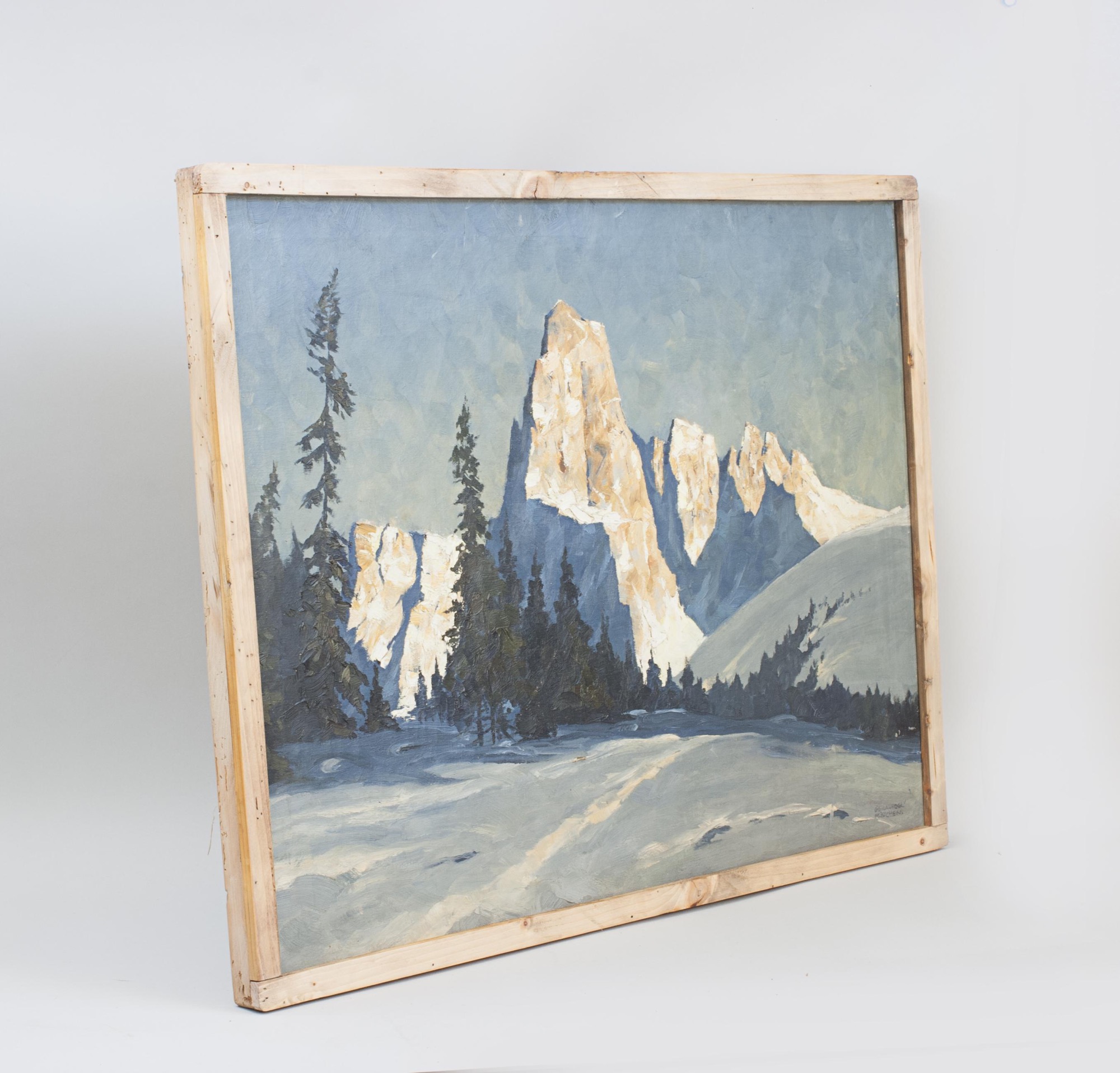 An outstandingly fine work of a winter alpine landscape, the oil on canvas of the Sciliar, a mountain of the Dolomites in South Tyrol, Italy. The striking oil perfectly capturing the characteristic silhouette of the Sciliar with its two mighty peaks, Punta Santner and Punta Euringer. Quite spellbinding the golden rays of the sun falling on the mountain range leaving atmospheric shadows behind. Signed bottom right-hand corner, Georg Grauvogl.
