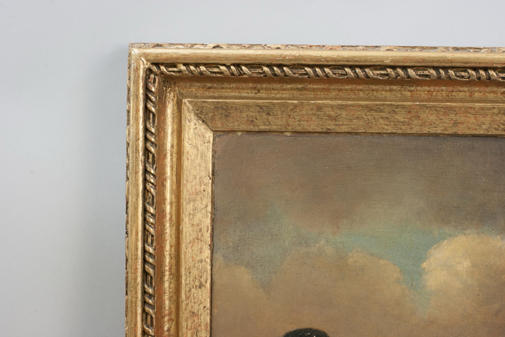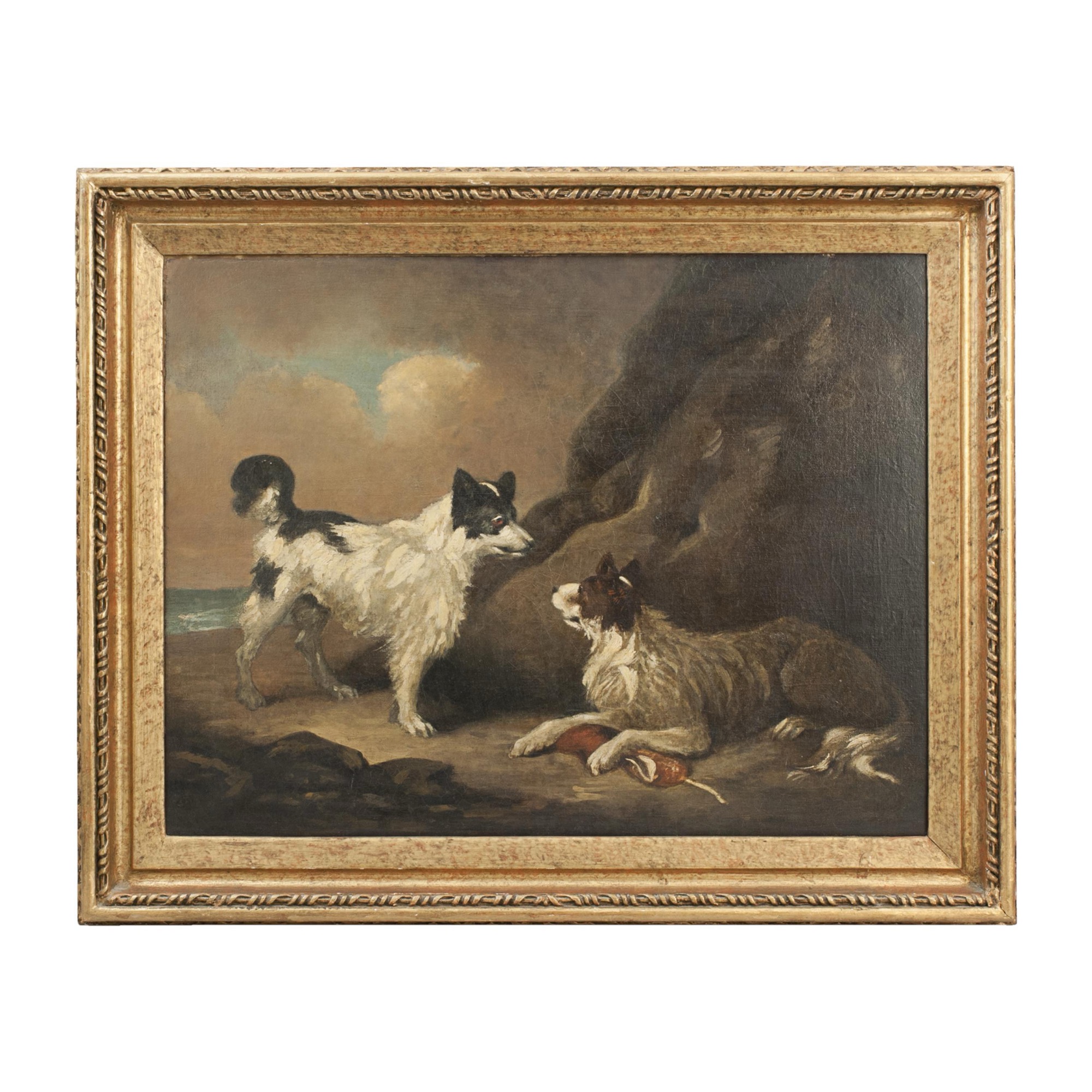 A charming antique oil painting after the British artist, George Morland (1763-1804), depicting two dogs, one with a pile of offal offal ("the pluck," meaning heart, liver and lungs), a subject both humorous and characteristic of Morland's genre scenes. "Dogs Hesitating About the Pluck" is rendered in warm, earthy tones, the painting captures a moment of hesitation and curiosity, with the animals' expressive postures bringing life and narrative to the composition. Faithful to Morland's original style, this work reflects his signature focus on rural life and animal subjects, appealing to collectors of 18th- and 19th century British genre painting. Presented in a decorative gilt frame, the painting makes a striking and atmospheric addition to a traditional or period interior.