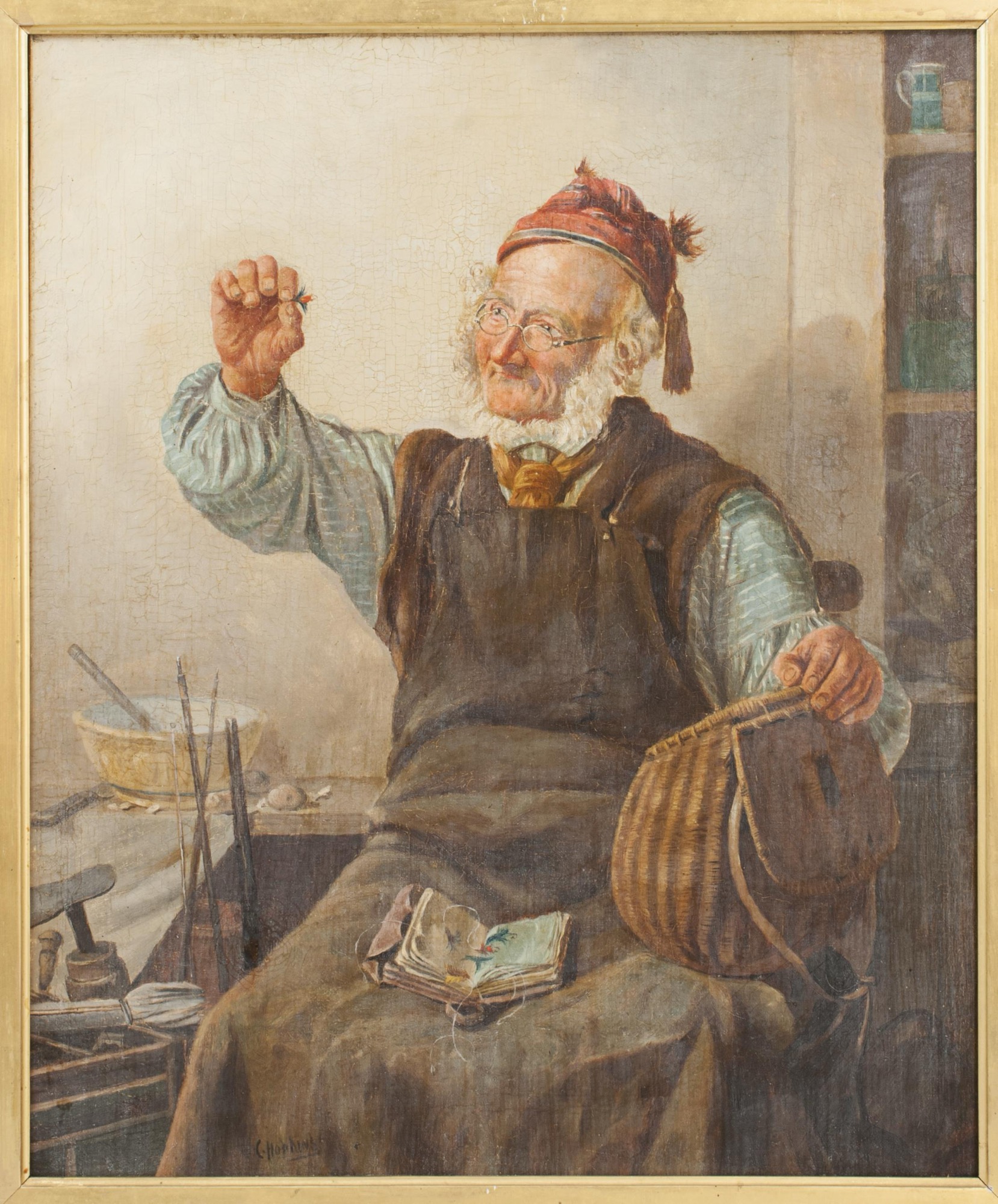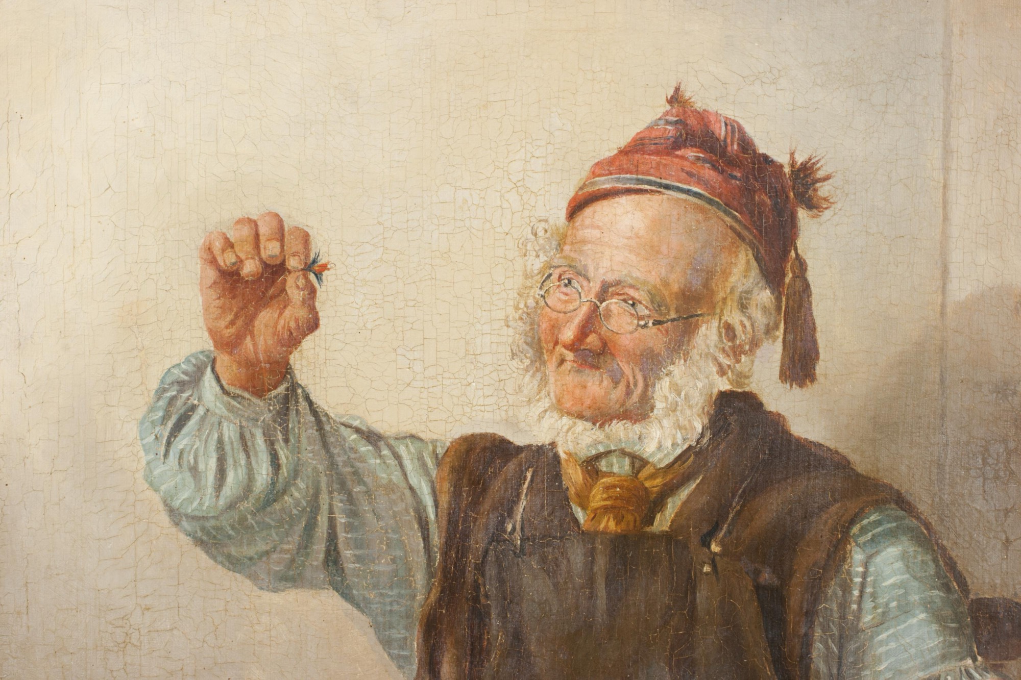 The first painting depicts the old gentleman examining his fishing flies. His fly wallet lies open on his lap, a wicker creel rests on his knee, and his attention is focused on the fishing fly he holds delicately between his fingers.