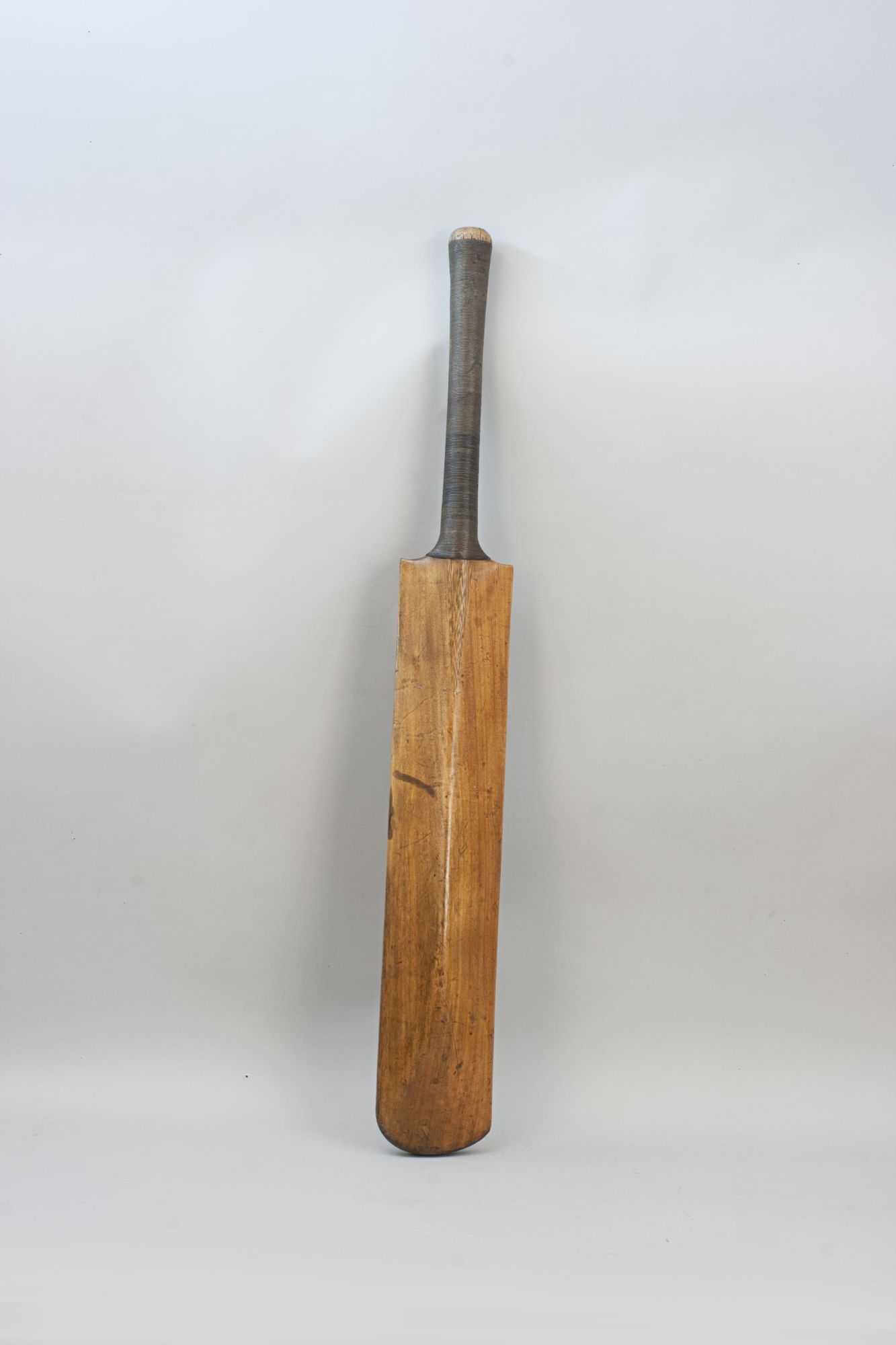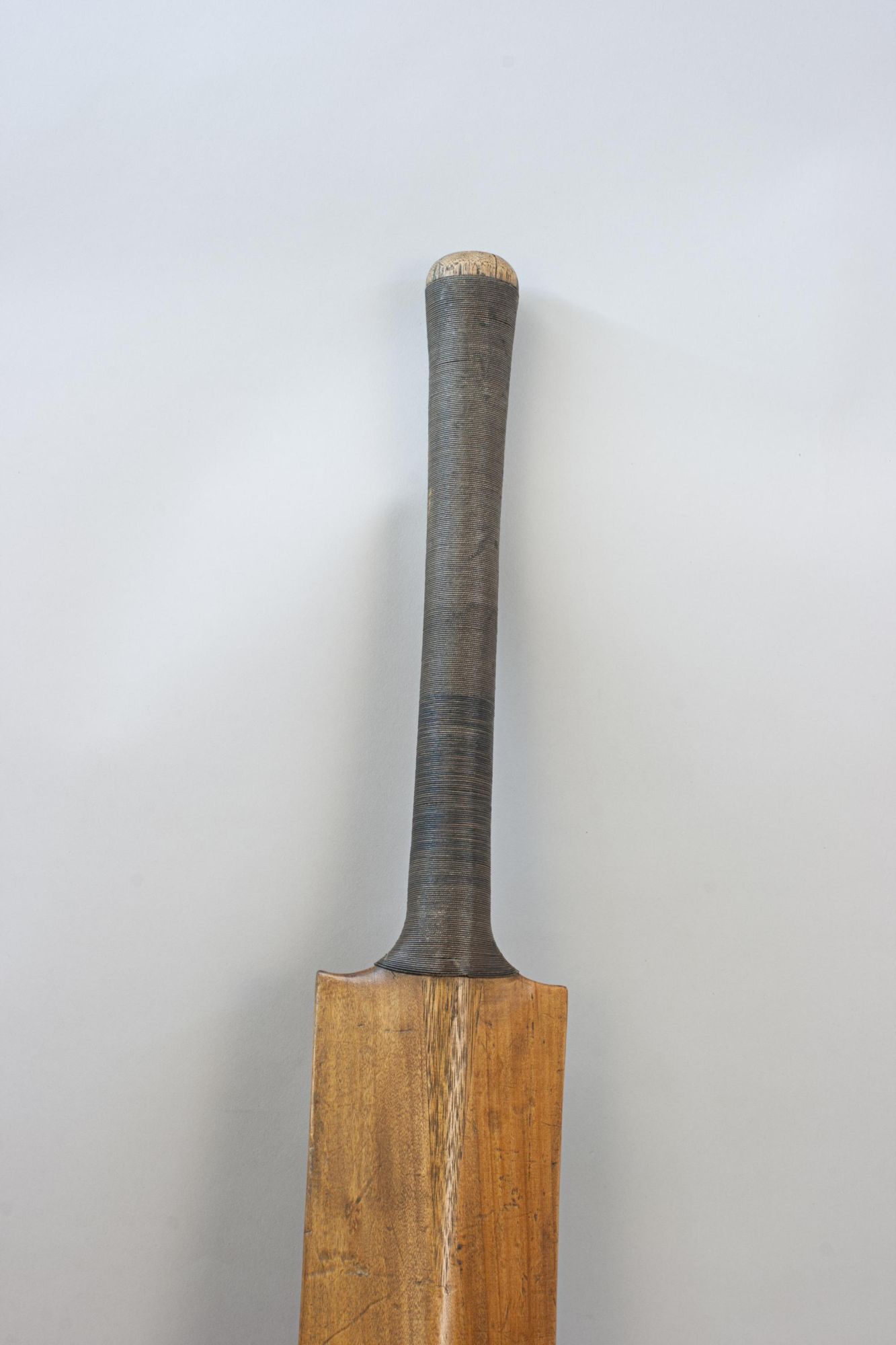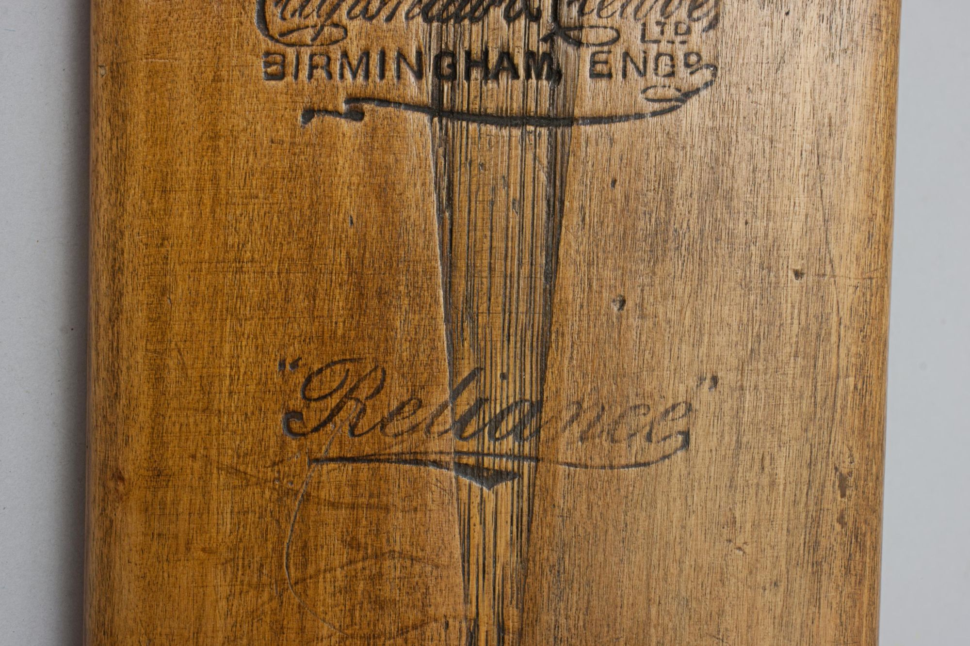 Vintage Clapshaw & Cleaves Ltd. willow cricket bat in great condition. The handle with a corded grip, blade embossed "Clapshaw & Cleaves Ltd. Birmingham, England, "Reliance", Treble Rubber". A good decorative piece with nice patina.