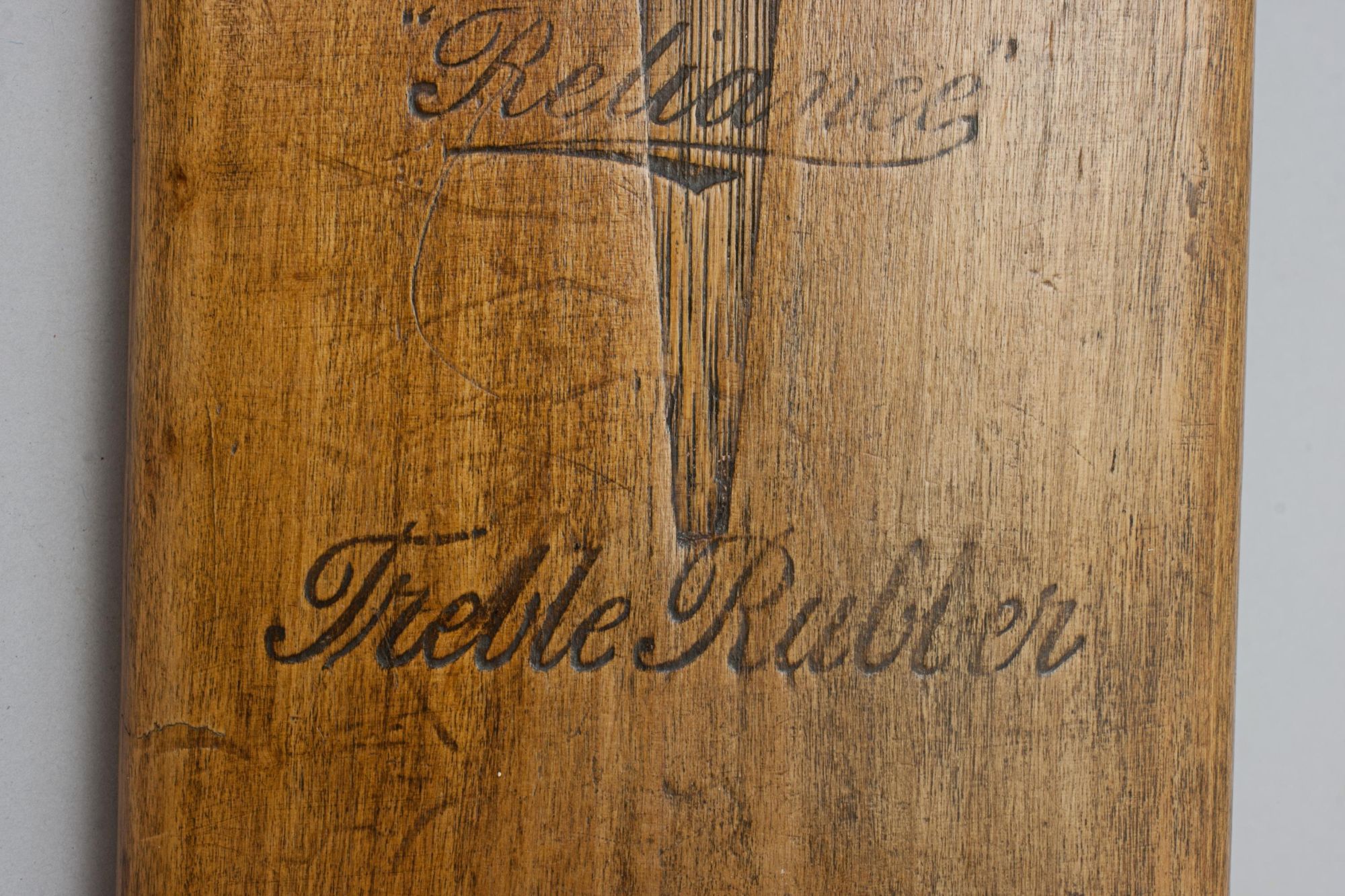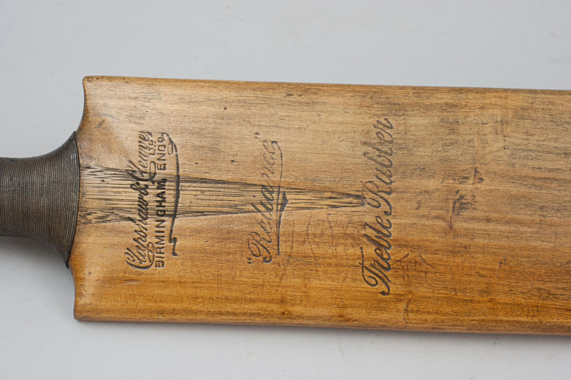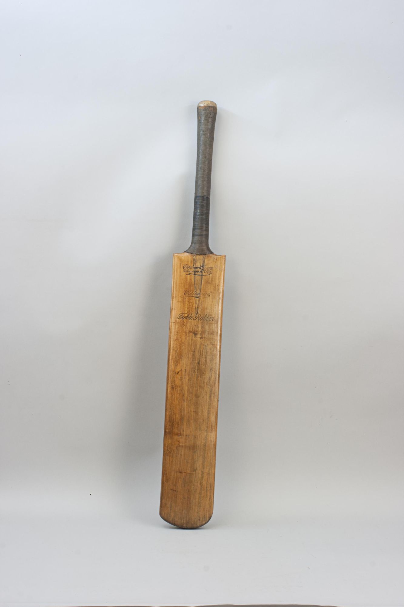 Vintage Clapshaw & Cleaves Ltd. willow cricket bat in great condition. The handle with a corded grip, blade embossed "Clapshaw & Cleaves Ltd. Birmingham, England, "Reliance", Treble Rubber". A good decorative piece with nice patina.