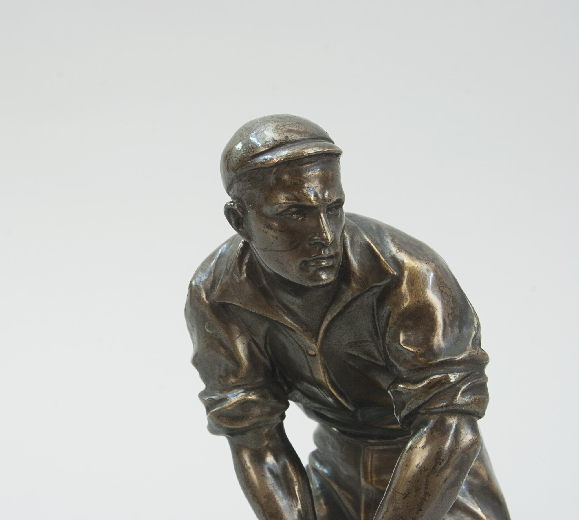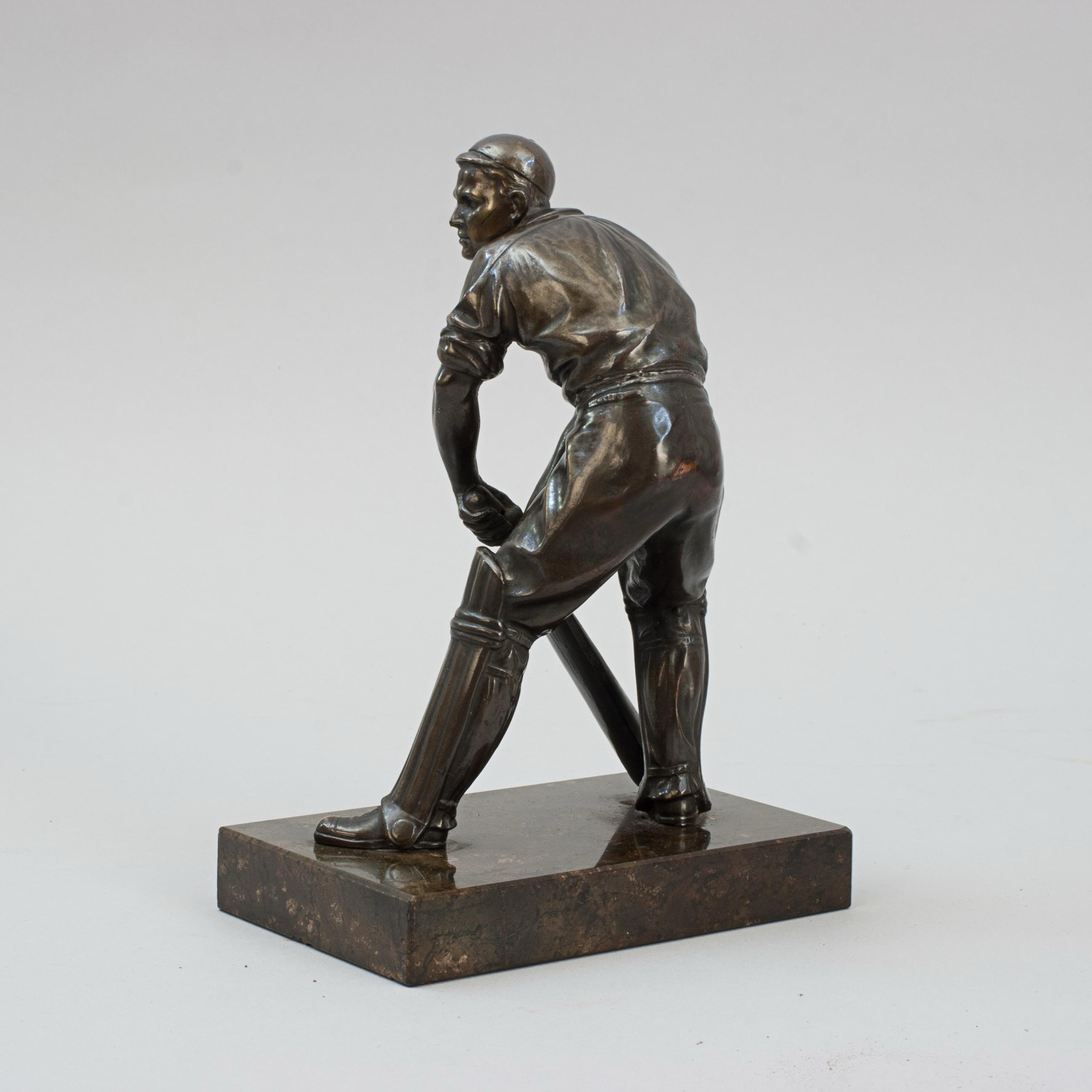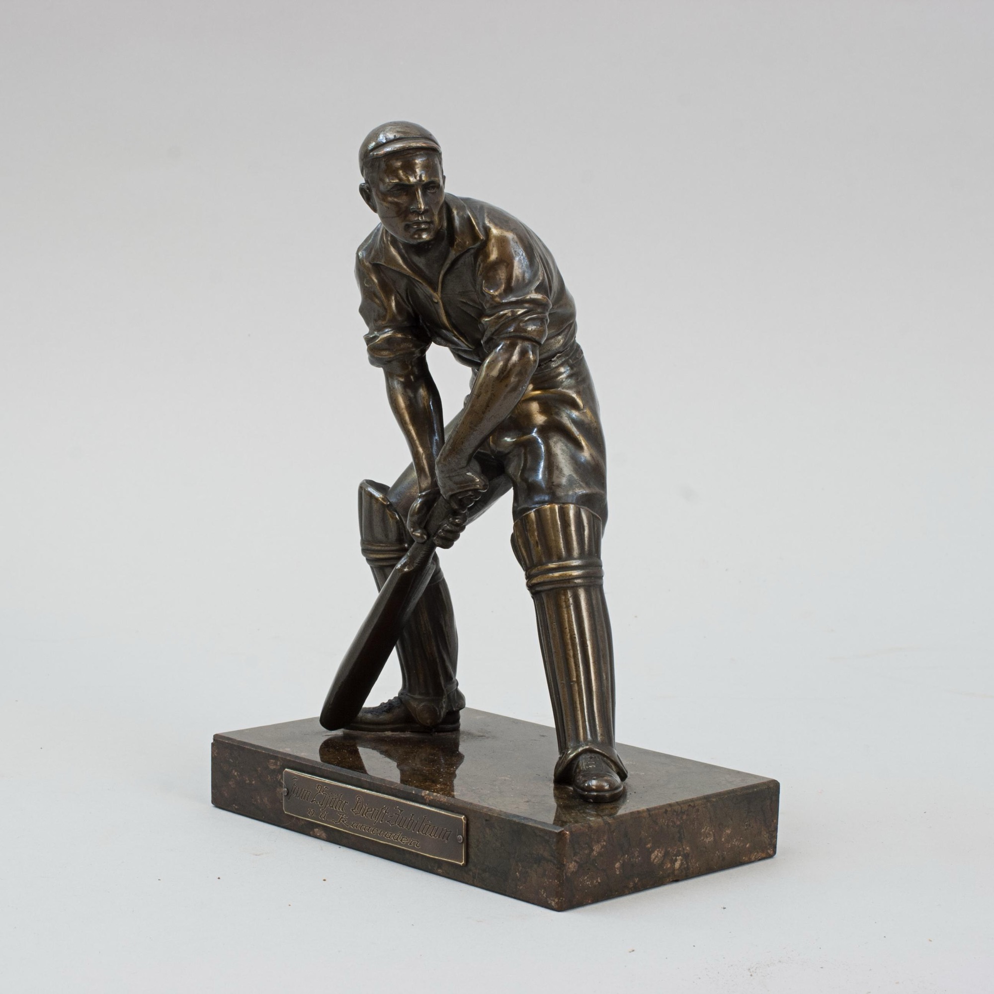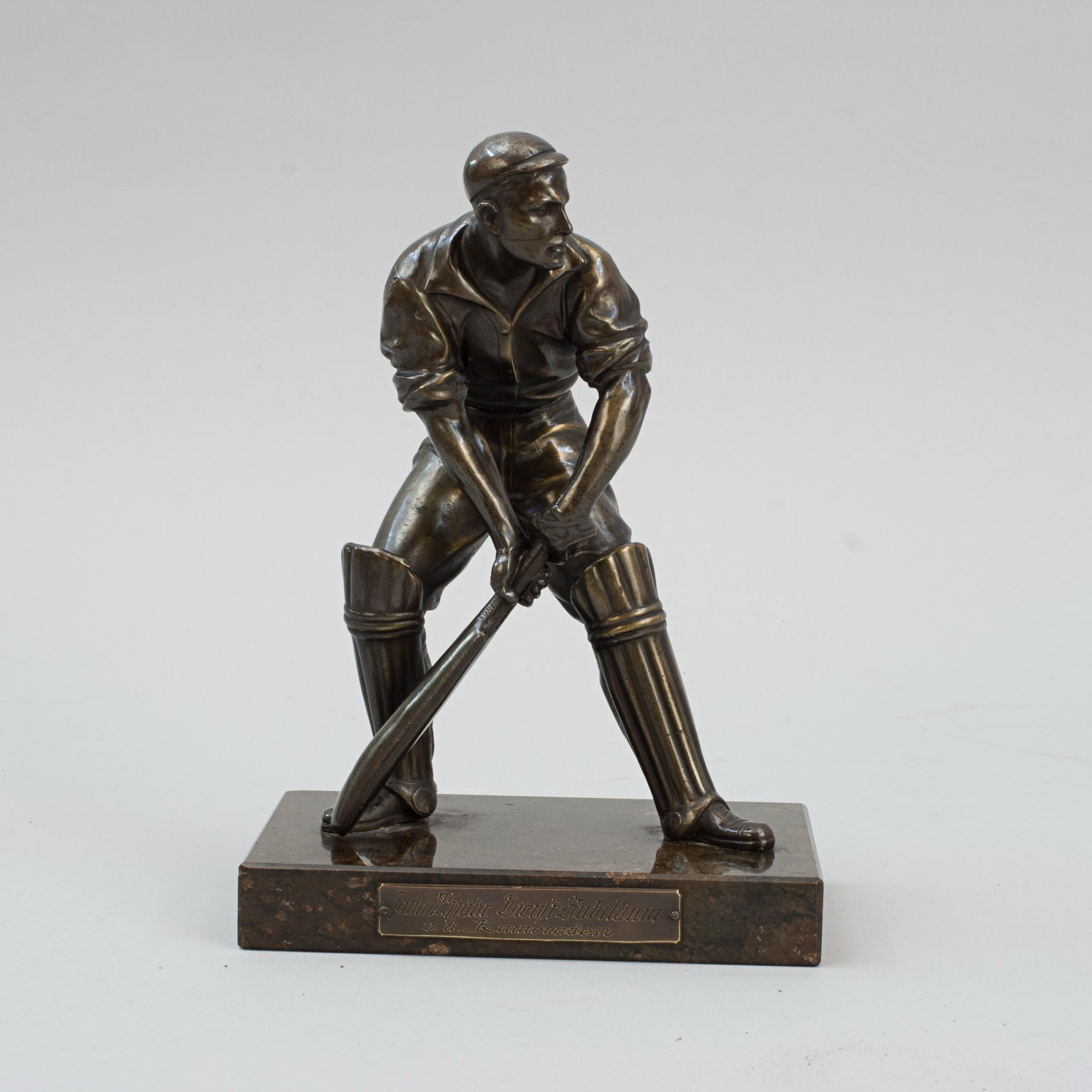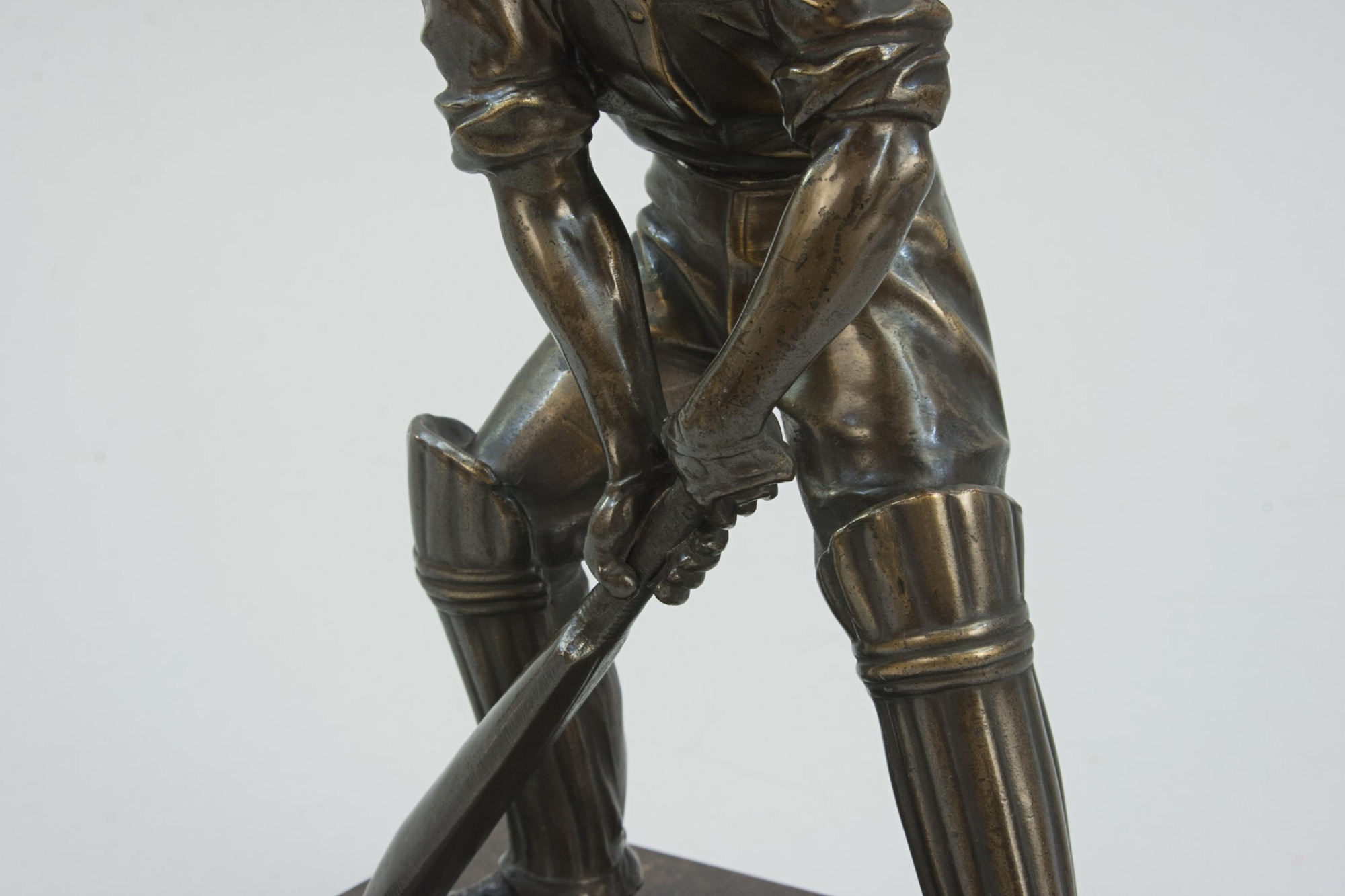 A very nice Edwardian spelter figure of a male cricketer wearing a cap and is equipped with a bat and cricket pads. His pose depicts him standing at the crease, awaiting the ball to be bowled. The figure has a bronzed finish and is mounted on a marble base with an inscribed plaque reading: "Zum 25 jӓhr. Dienst-Jubilӓum, v.d. Kameraden" ("On the occasion of the 25-year service anniversary, from the comrades").