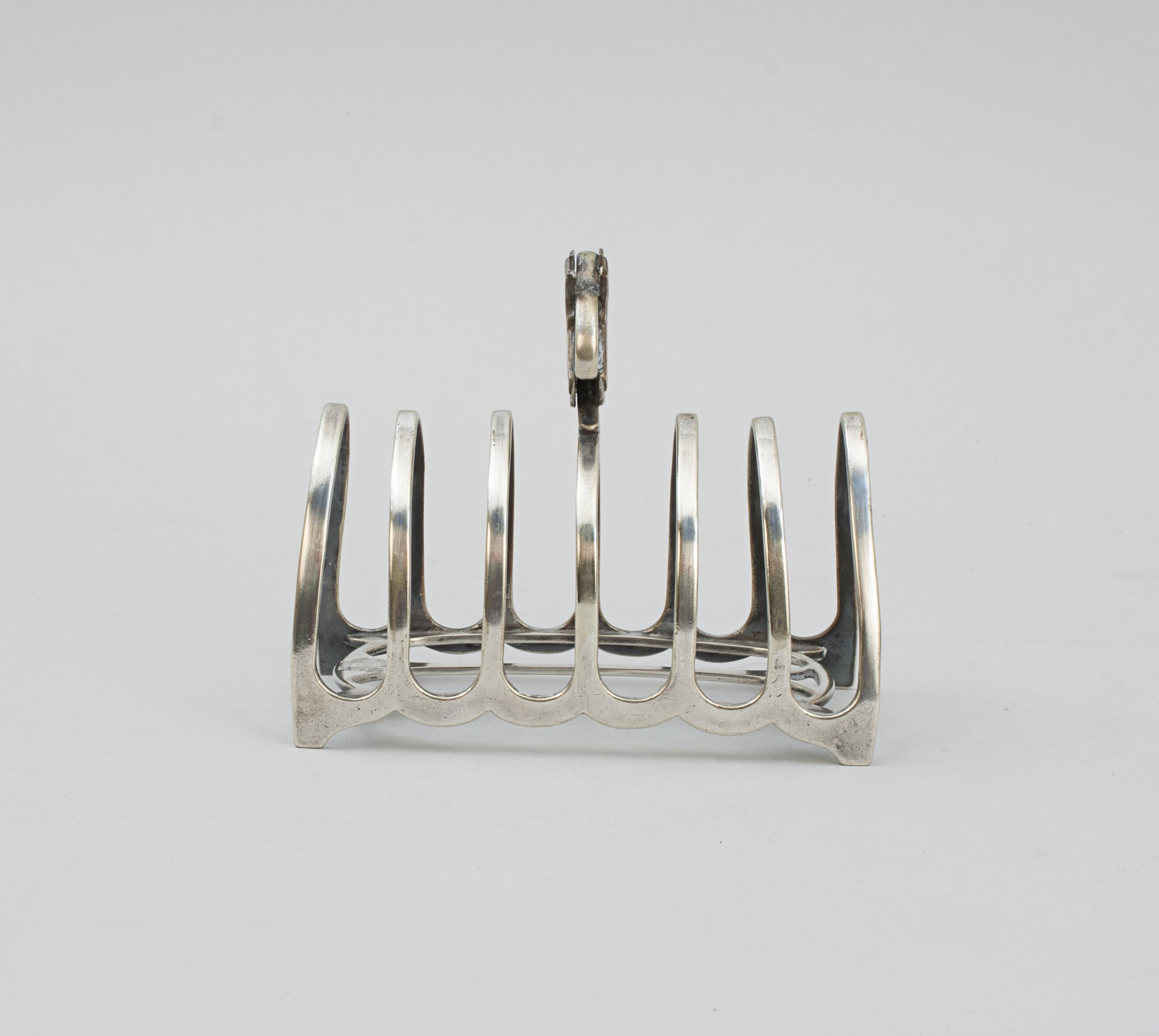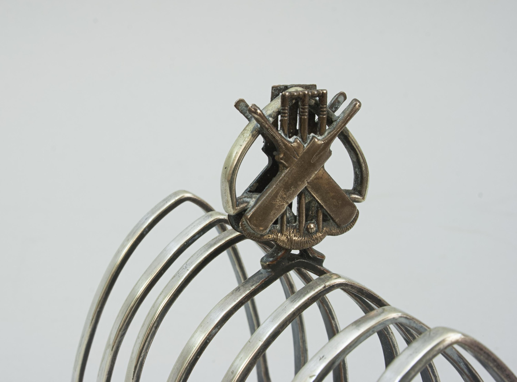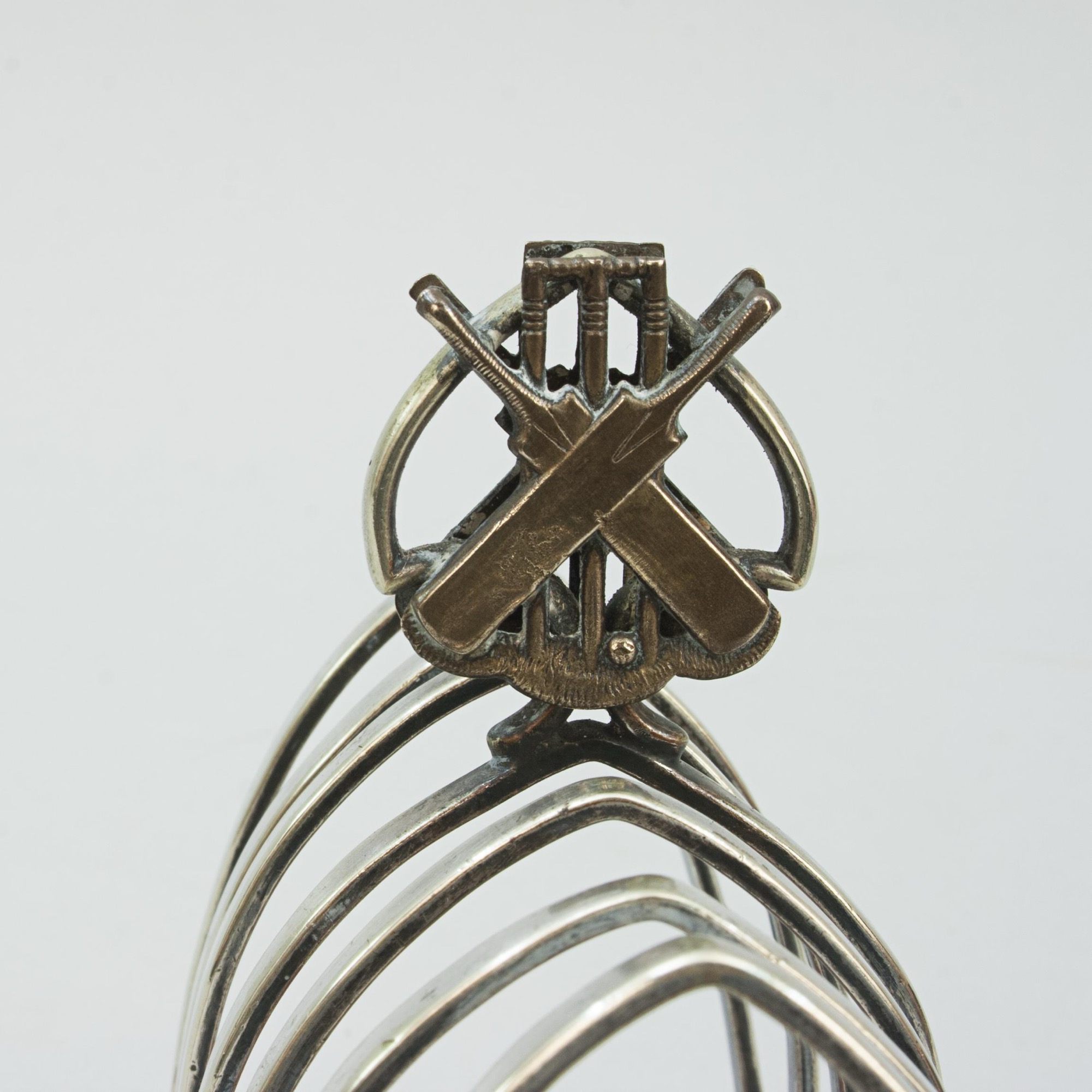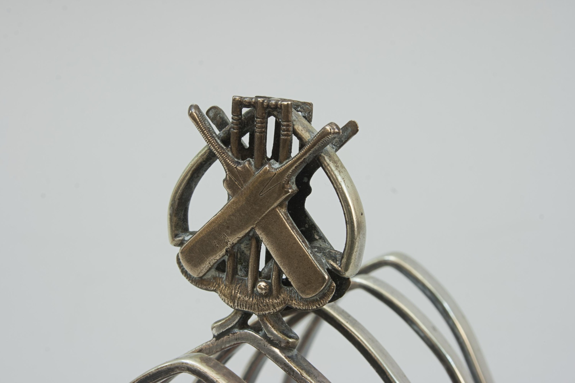 A novelty plated cricket toast rack which can also be used as a letter rack or napkin holder. There are seven dividers creating six spaces for toast. The ring handle in the form of wickets (stumps and bails), two crossed bats and a cricket ball. The underside of the base stamped, 'Hutton, Sheffield, H2087', with an eight crossed arrow mark, which William Hutton & Sons Ltd. used from 1902. The firm was absorbed by another well known Sheffield silver smith, James Dixon & Sons in 1930.
