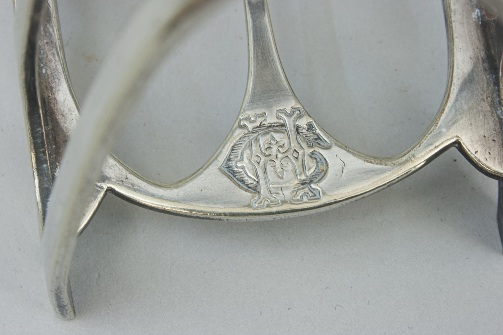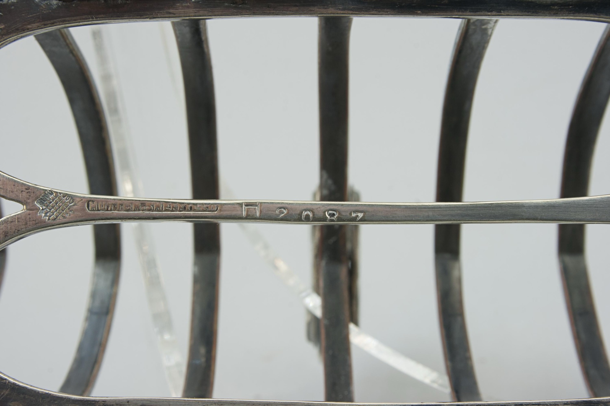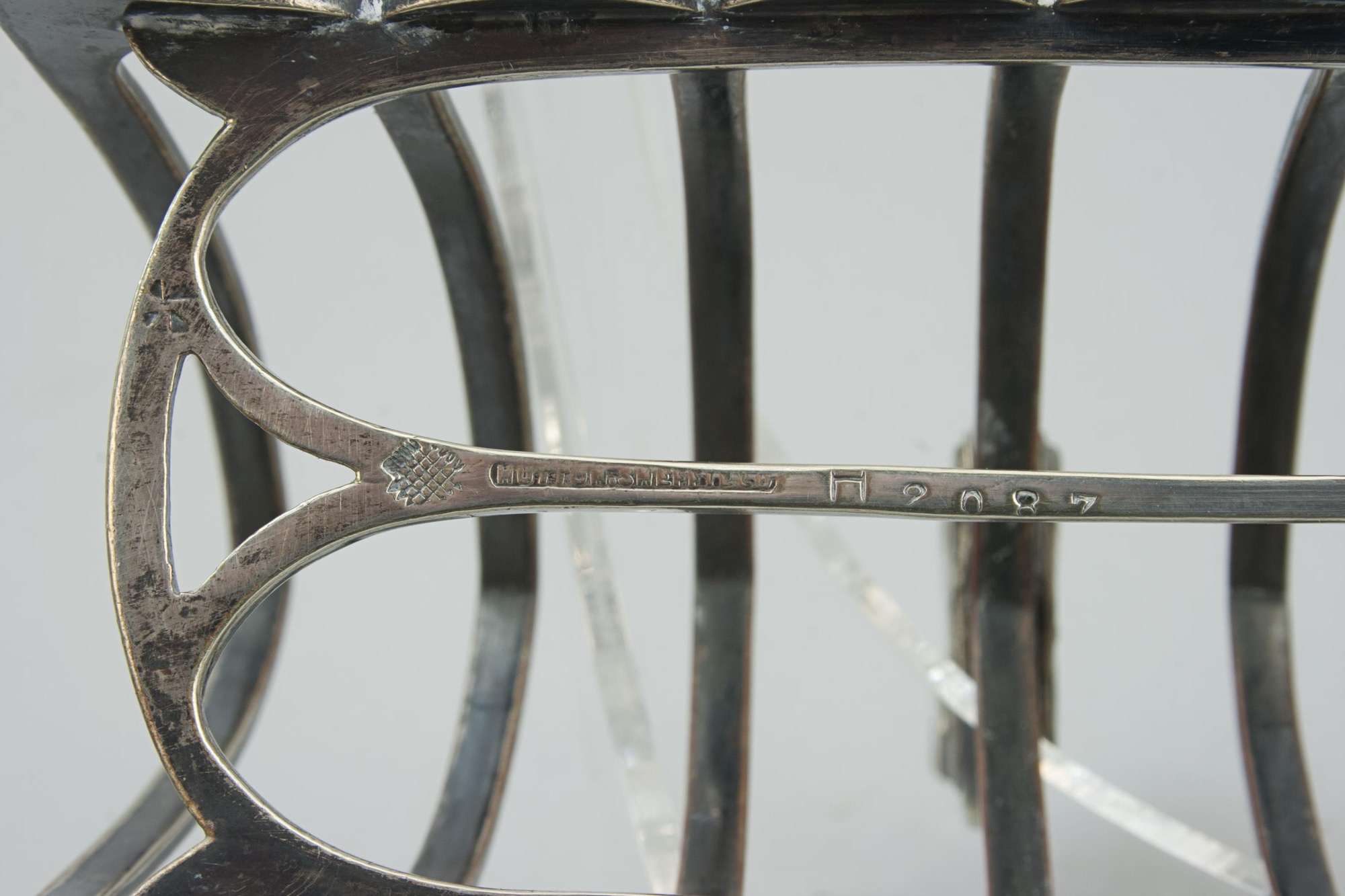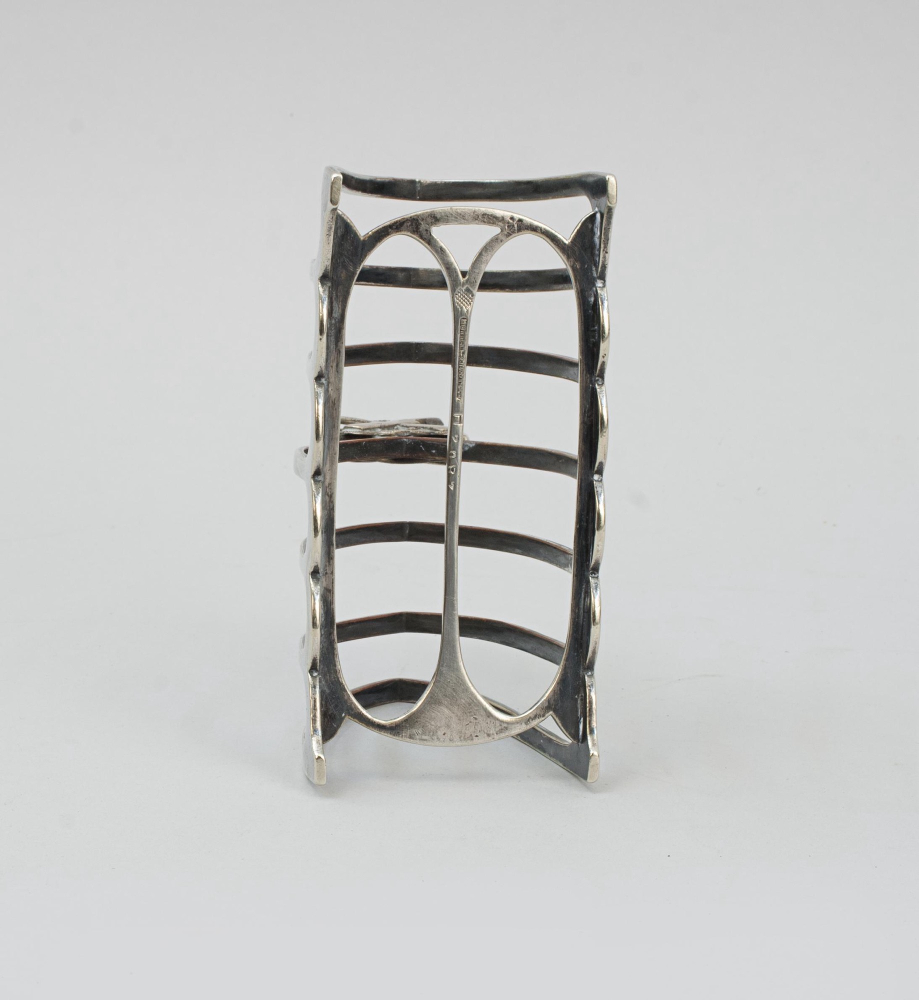 A novelty plated cricket toast rack which can also be used as a letter rack or napkin holder. There are seven dividers creating six spaces for toast. The ring handle in the form of wickets (stumps and bails), two crossed bats and a cricket ball. The underside of the base stamped, 'Hutton, Sheffield, H2087', with an eight crossed arrow mark, which William Hutton & Sons Ltd. used from 1902. The firm was absorbed by another well known Sheffield silver smith, James Dixon & Sons in 1930.