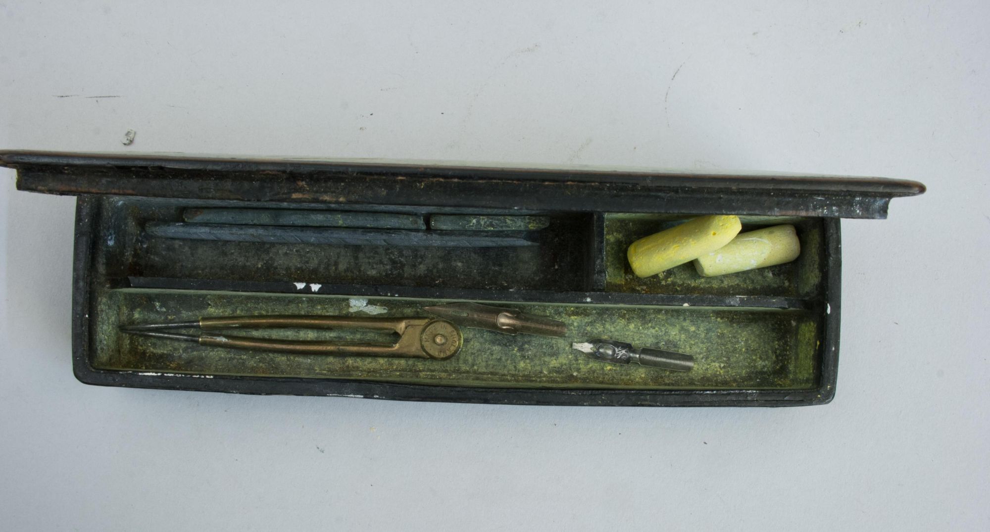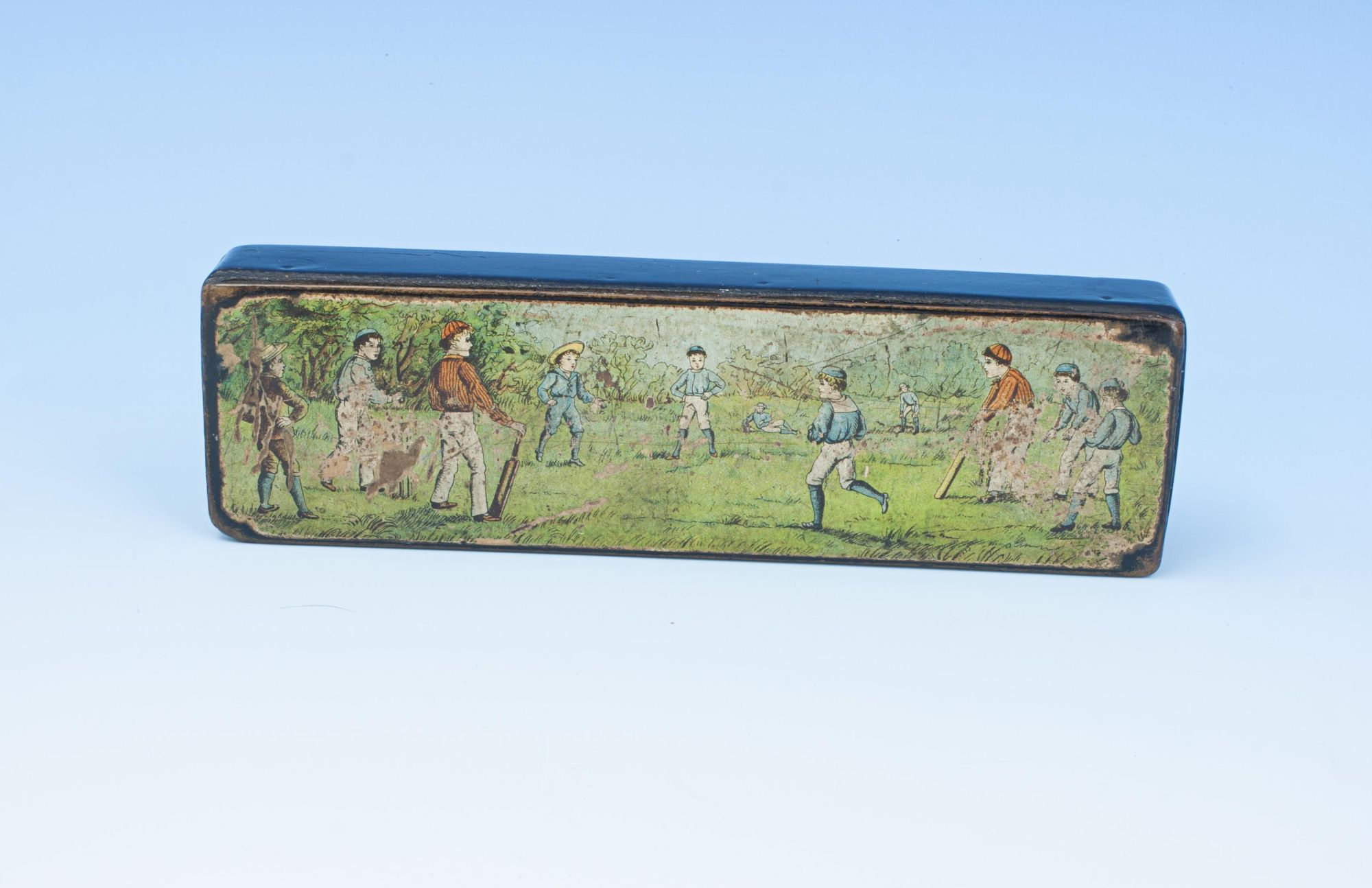 A black lacquered Papier-mâché pencil box with partitioned interior (still containing some of its contents), hinged lid with applied printed scene. The scene depicting a group of boys playing cricket. A rare cricket collectors item.