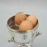 Using an egg steamer meant that the eggs could be prepared at the table and served hot. The wire ring frame within the coddler holds the eggs under the boiling water keeping them warm, the burner underneath maintaining the temperature.