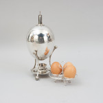 The large and impressive silver plate egg steamer, boiler (or egg coddler) stands 26 cm high and is supported on three ball end legs. The steamer can be used to boil or coddle one or more eggs. The dome contains a four ring frame for holding the eggs while being cooked, there is a central loop handle to lift the device from the water. There is a cup to the base for holding the spirit lamp, its handle made of crossed cricket bats and a ball. The dome top with handle in the shape of a cricket bat with ball and a set of stumps. The base is stamped 'EPNS, 25934' with a symbol of a club with three stars.