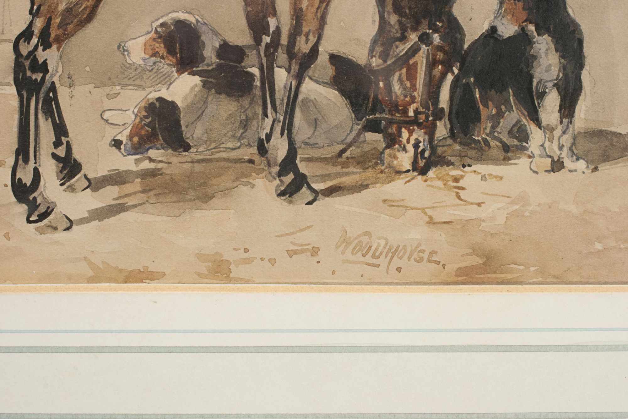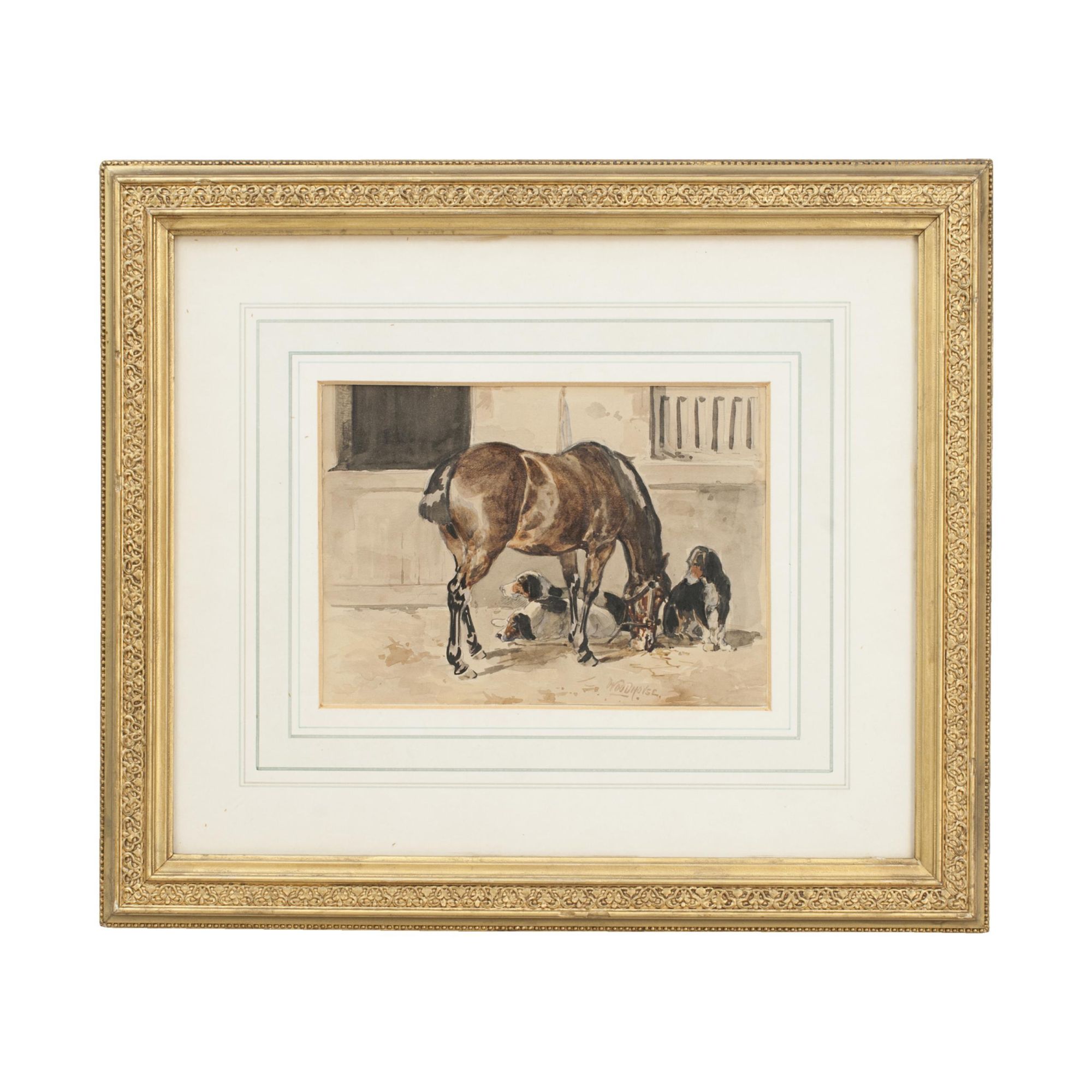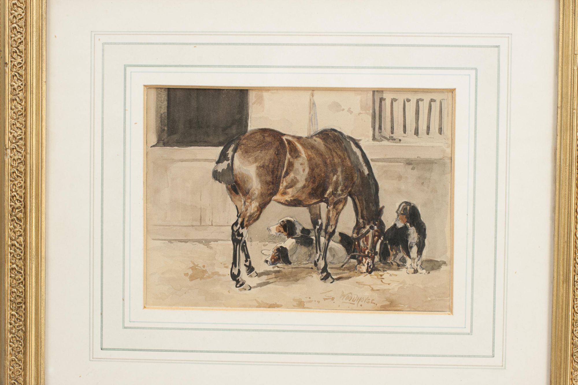 An exquisite antique watercolor painting by renowned British animal painter William Woodhouse, known for his lifelike depictions of horses, dogs, and rural scenes. This work features a dignified bay horse standing in a rustic stable, accompanied by three setters, rendered with remarkable sensitivity and detail.