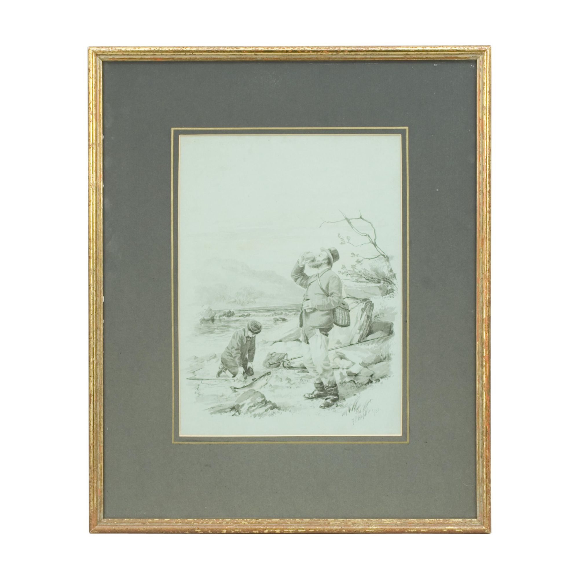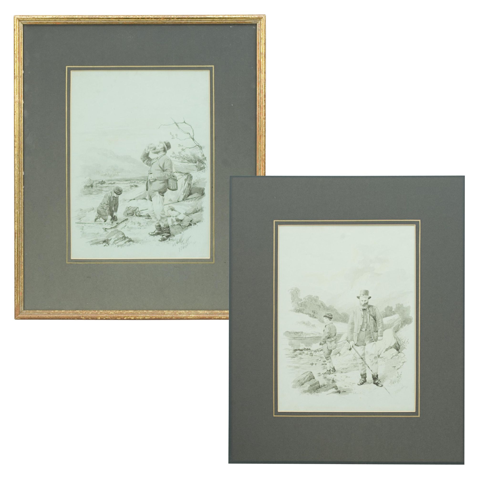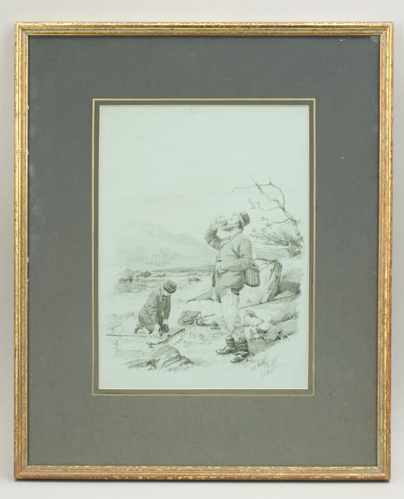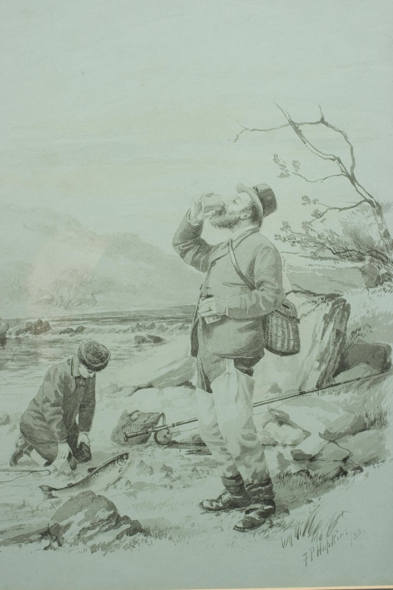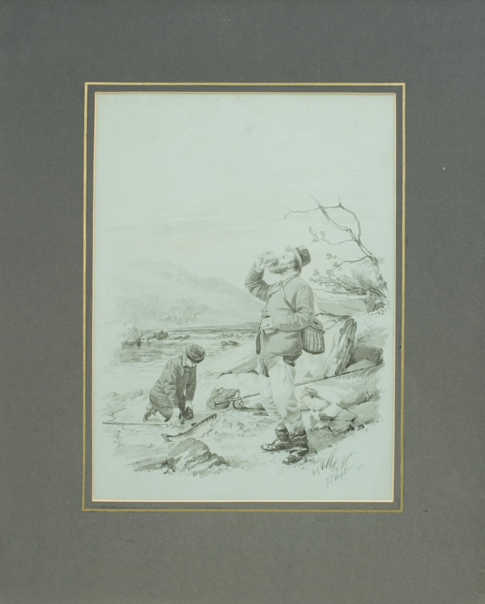 A wonderful pair of original fishing watercolours, a self portrait of one of the most important golf artists of the Victorian era. Signed and dated 1886. Major Hopkins is well know for his golf watercolours but he was a keen fisherman who included angling among his contributions to 'The Field' magazine and wrote and illustrated "Fishing Experiences of Half a Century". These images were published by McQueen in 1886, The angling pictures have been completed on a light blue paper and painted in monochrome. Got Him! shows two fishermen, one kneeling on the ground looking over the catch whilst the other is having a drink from a beaker, with a wicker creel over his back. Lost Him! shows the same fishermen, the older rod in hand looking very angry whilst the younger looks out over the river with a gaff in his hand. The detail in these pictures is quite remarkable.