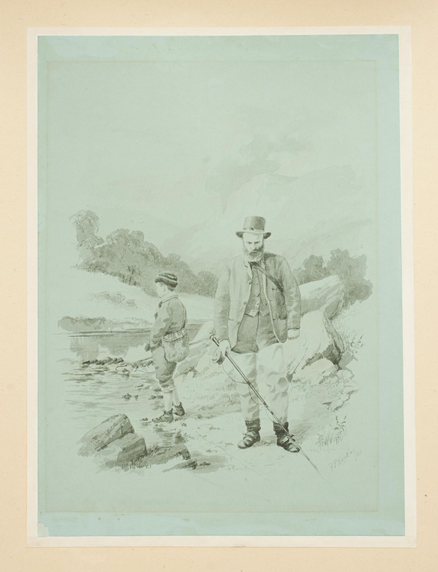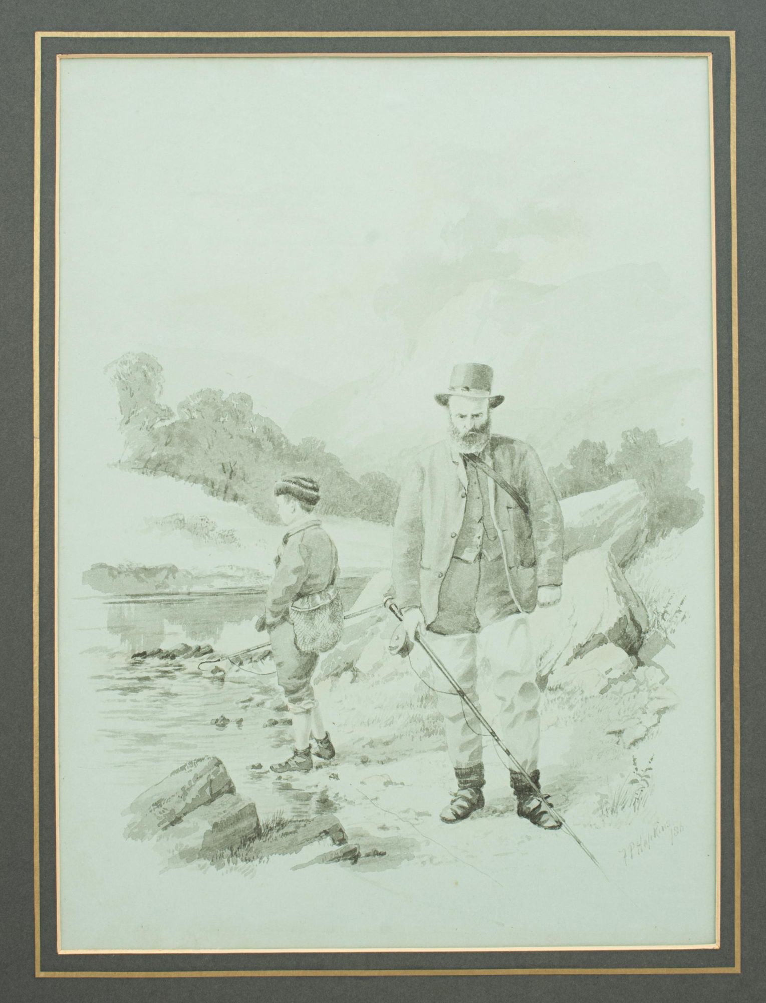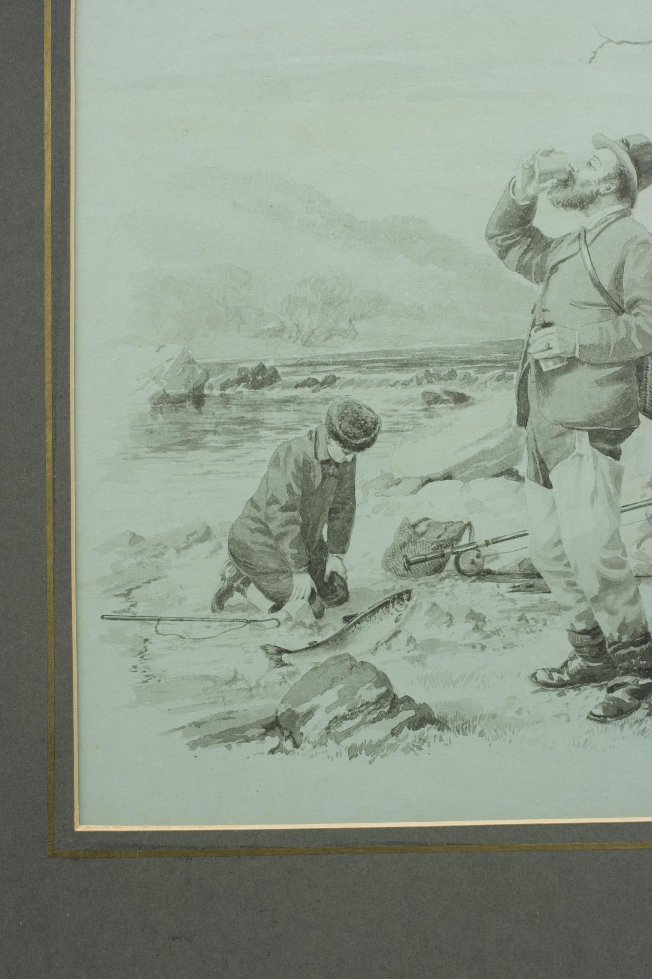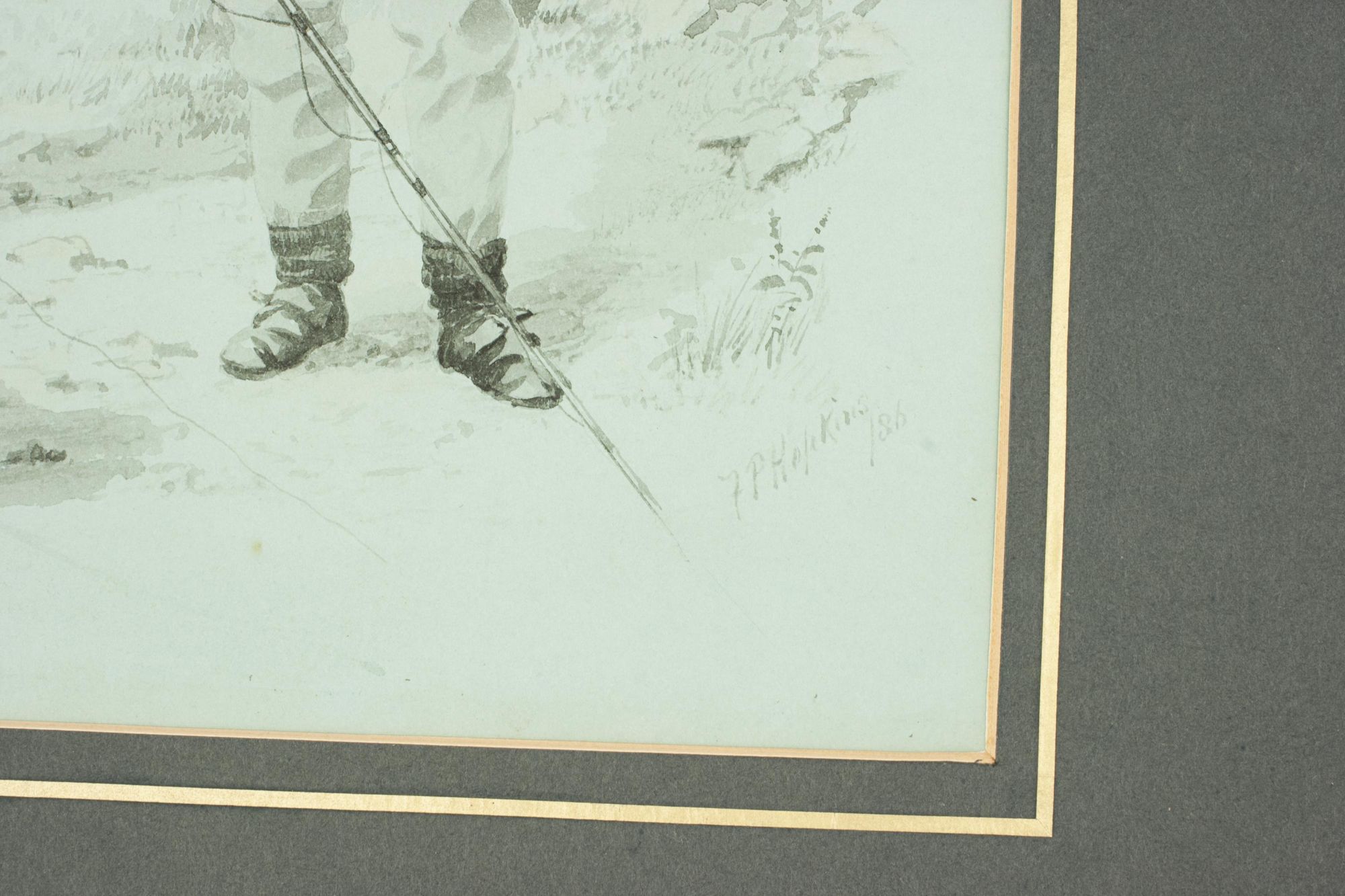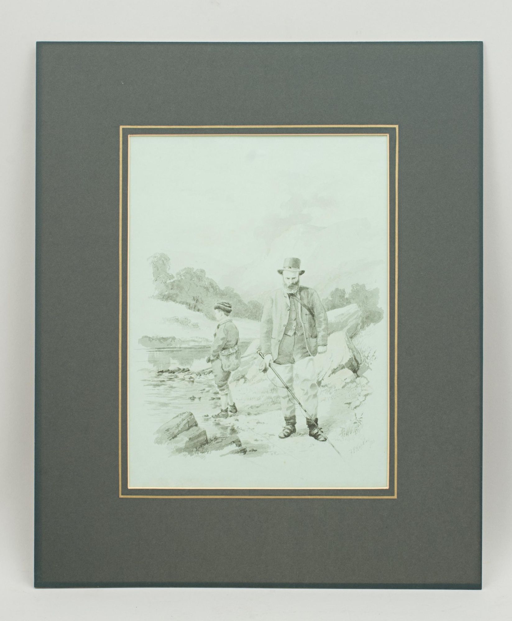 A wonderful pair of original fishing watercolours, a self portrait of one of the most important golf artists of the Victorian era. Signed and dated 1886. Major Hopkins is well know for his golf watercolours but he was a keen fisherman who included angling among his contributions to 'The Field' magazine and wrote and illustrated "Fishing Experiences of Half a Century". These images were published by McQueen in 1886, The angling pictures have been completed on a light blue paper and painted in monochrome. Got Him! shows two fishermen, one kneeling on the ground looking over the catch whilst the other is having a drink from a beaker, with a wicker creel over his back. Lost Him! shows the same fishermen, the older rod in hand looking very angry whilst the younger looks out over the river with a gaff in his hand. The detail in these pictures is quite remarkable.
