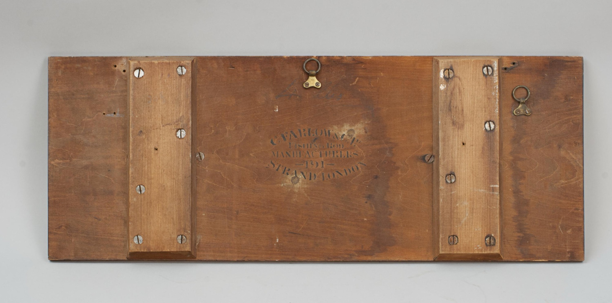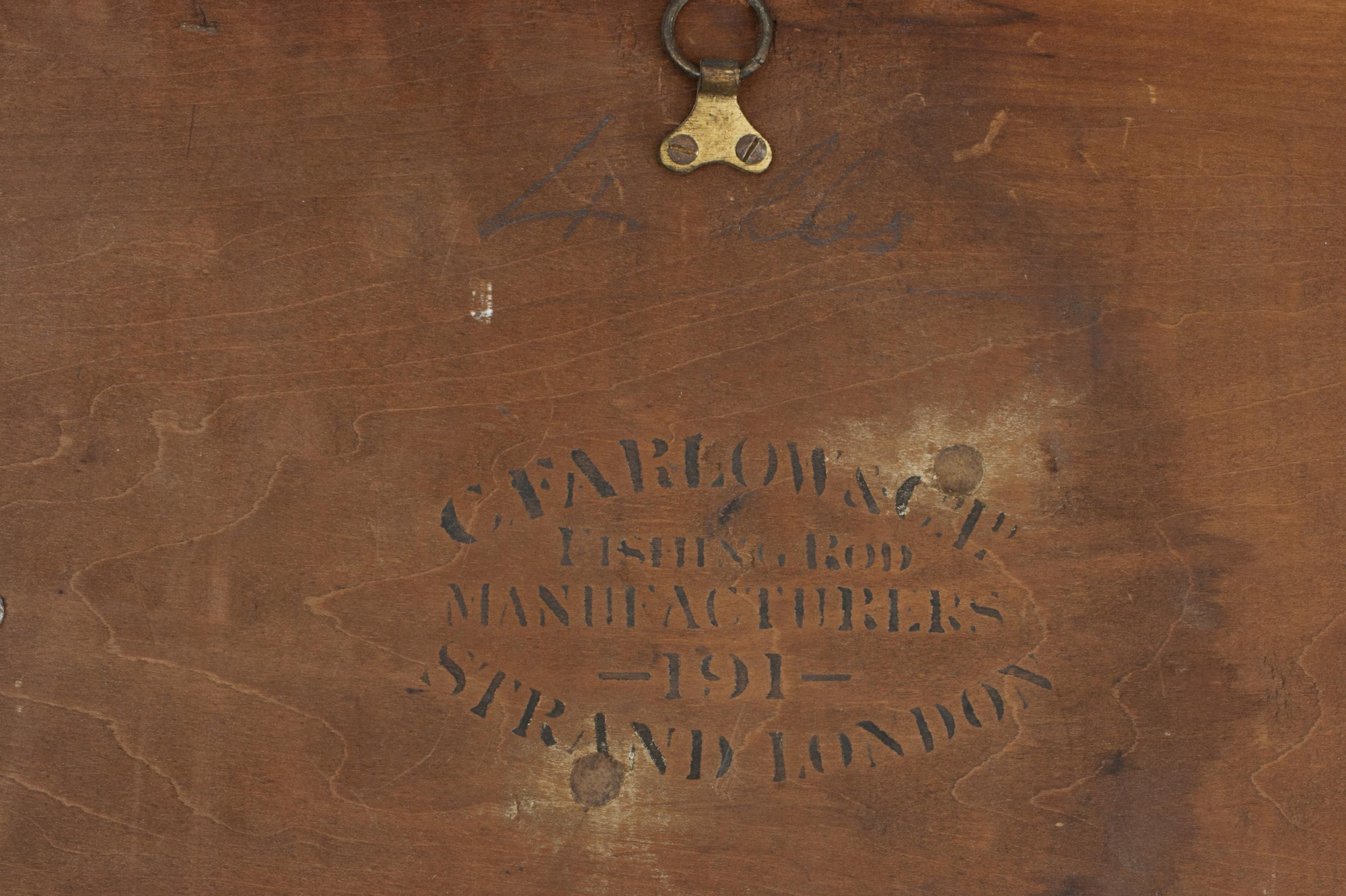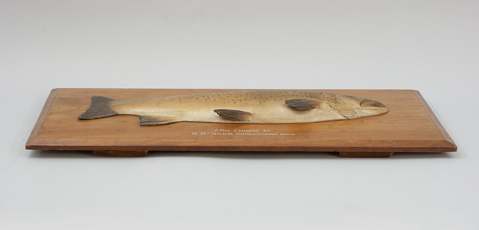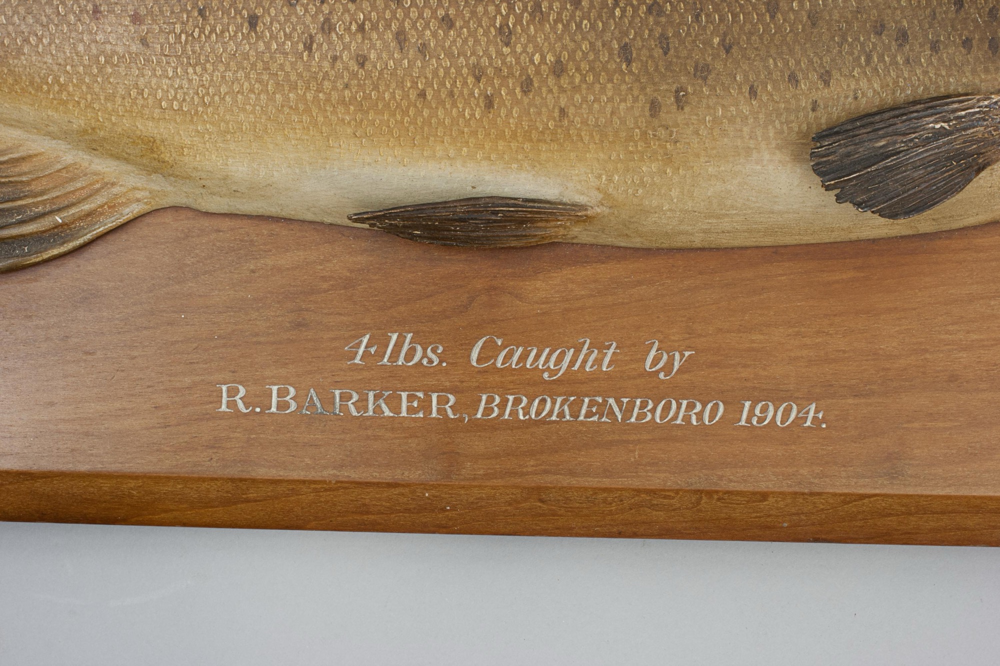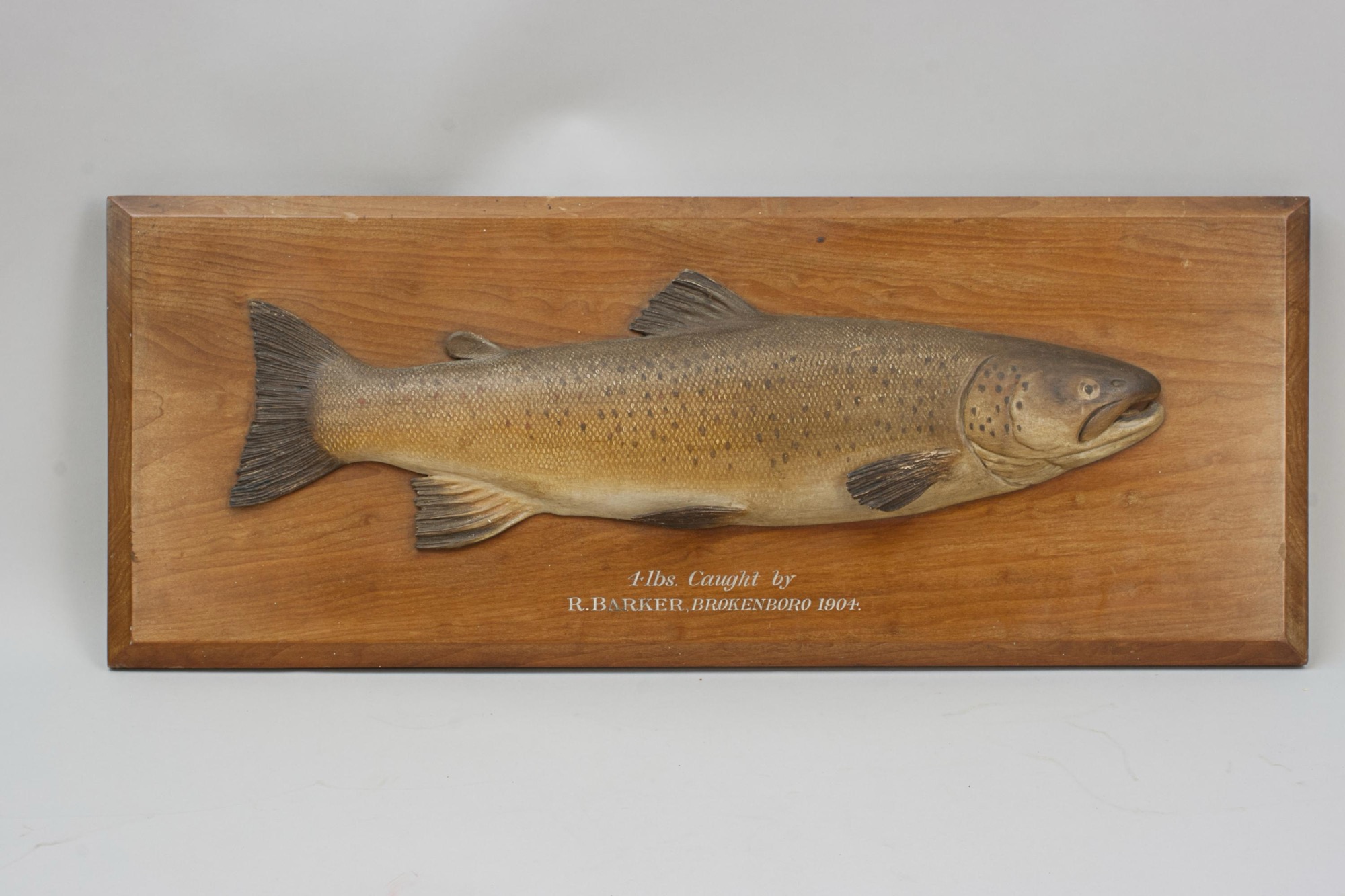 An exceptional carved wooden half-block brown trout mounted on its original bevelled-edge polished backboard retailed by Charles Farlow & Co, Ltd,. The reverse of the board features a 'Farlow' stencil reading: "C. Farlow & Co. Ltd., Fishing Rod Manufacturers, 191 Strand, London." There is a hand painted inscription on the face of the backboard that reads: "4lbs. Caught by R. Barker, Brokenboro 1904."