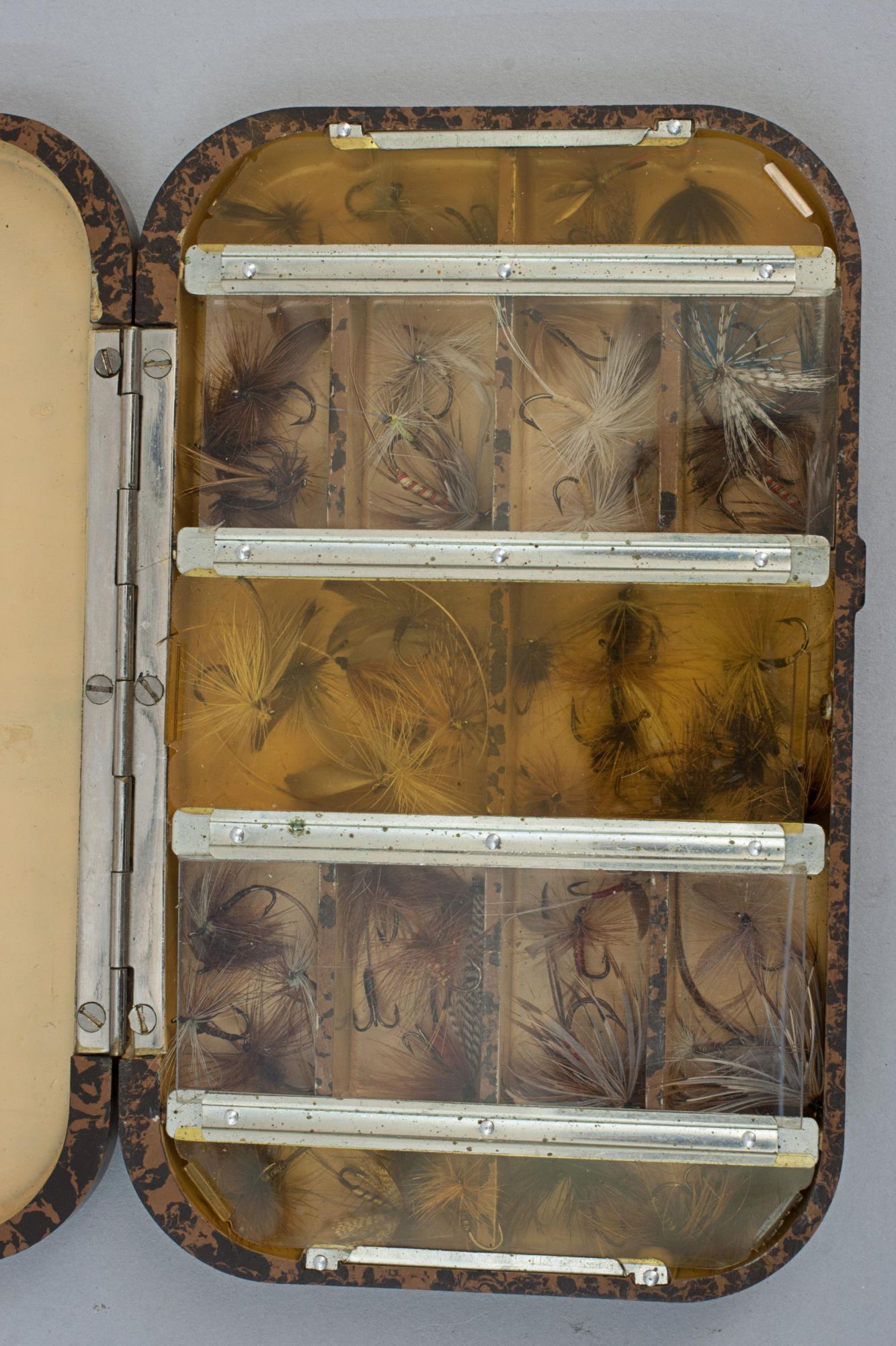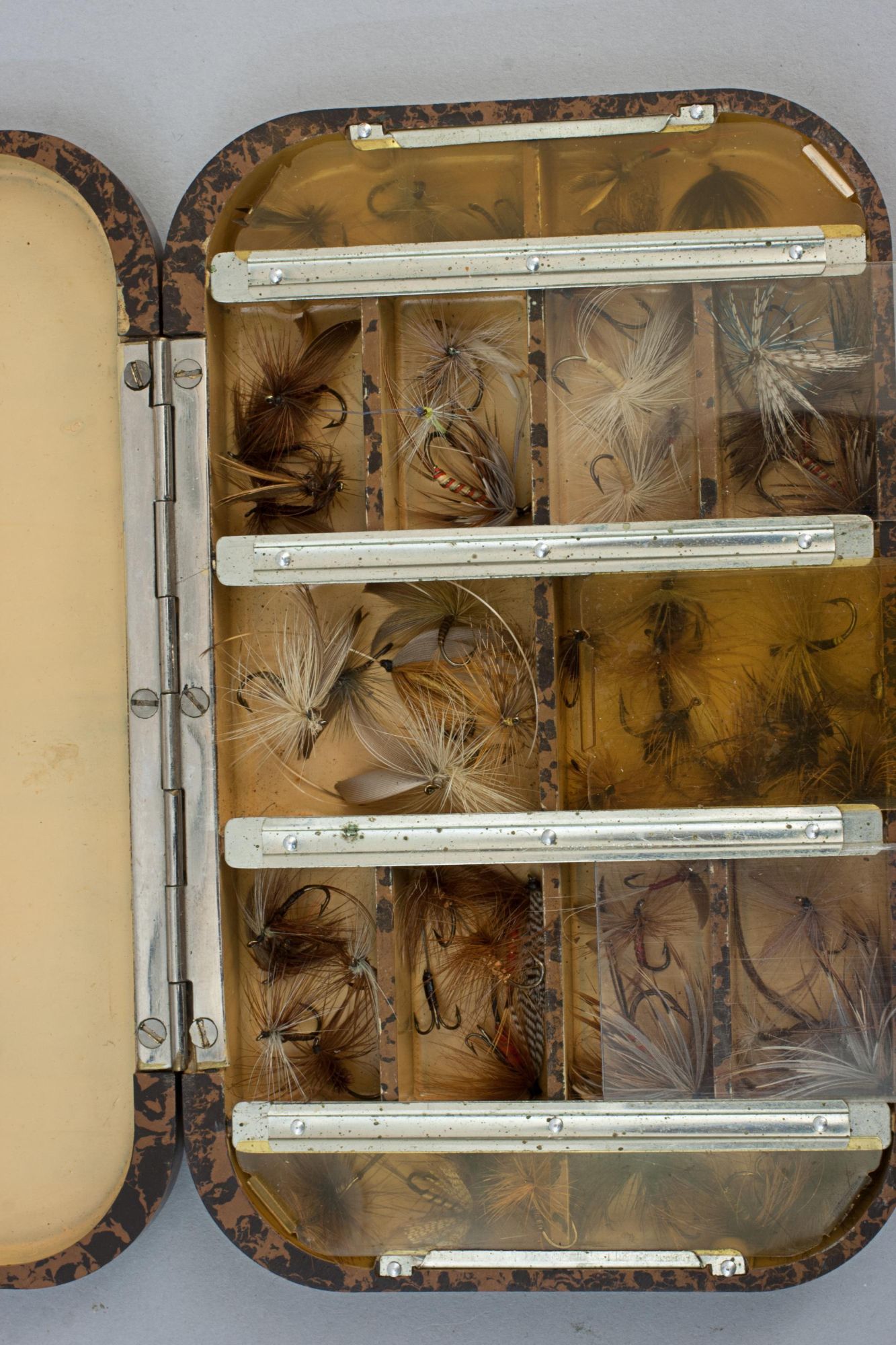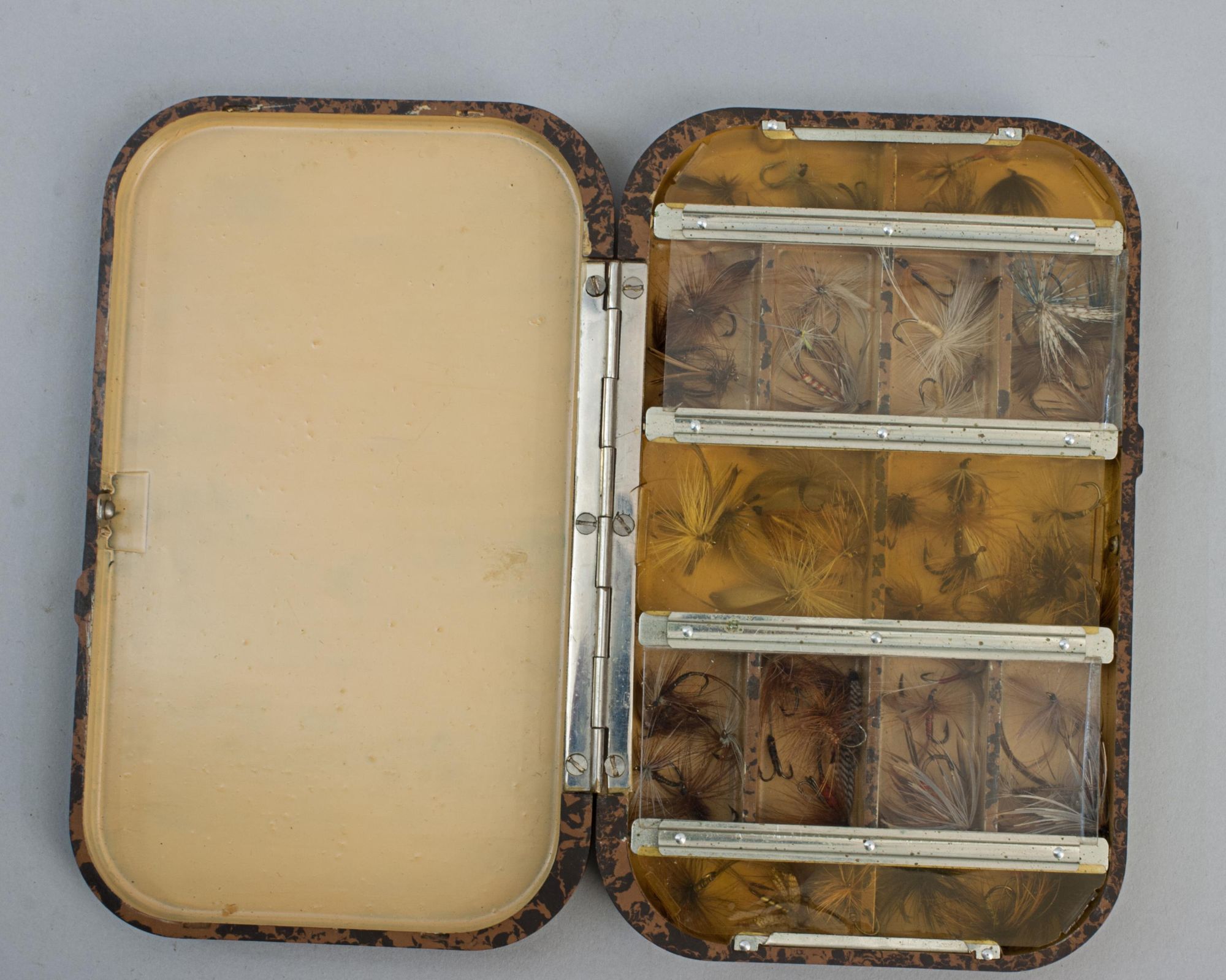 A good Neroda fly box made from bakelite with a brown tortoiseshell finish manufactured by Hardy's of Alnwick. The lid and bottom are embossed with 'HARDY BROS. MAKERS ENGLAND' and holding a small selection of fully dressed trout flies within fourteen compartments. The compartments being covered by sliding transparent doors. In Hardy's Anglers' Guides they say about the fly boxes:- We wish to introduce to our Angling friends a long felt want in the form of a new and perfect fly box, something which entirely eclipses the japanned tin and aluminium boxes now used.