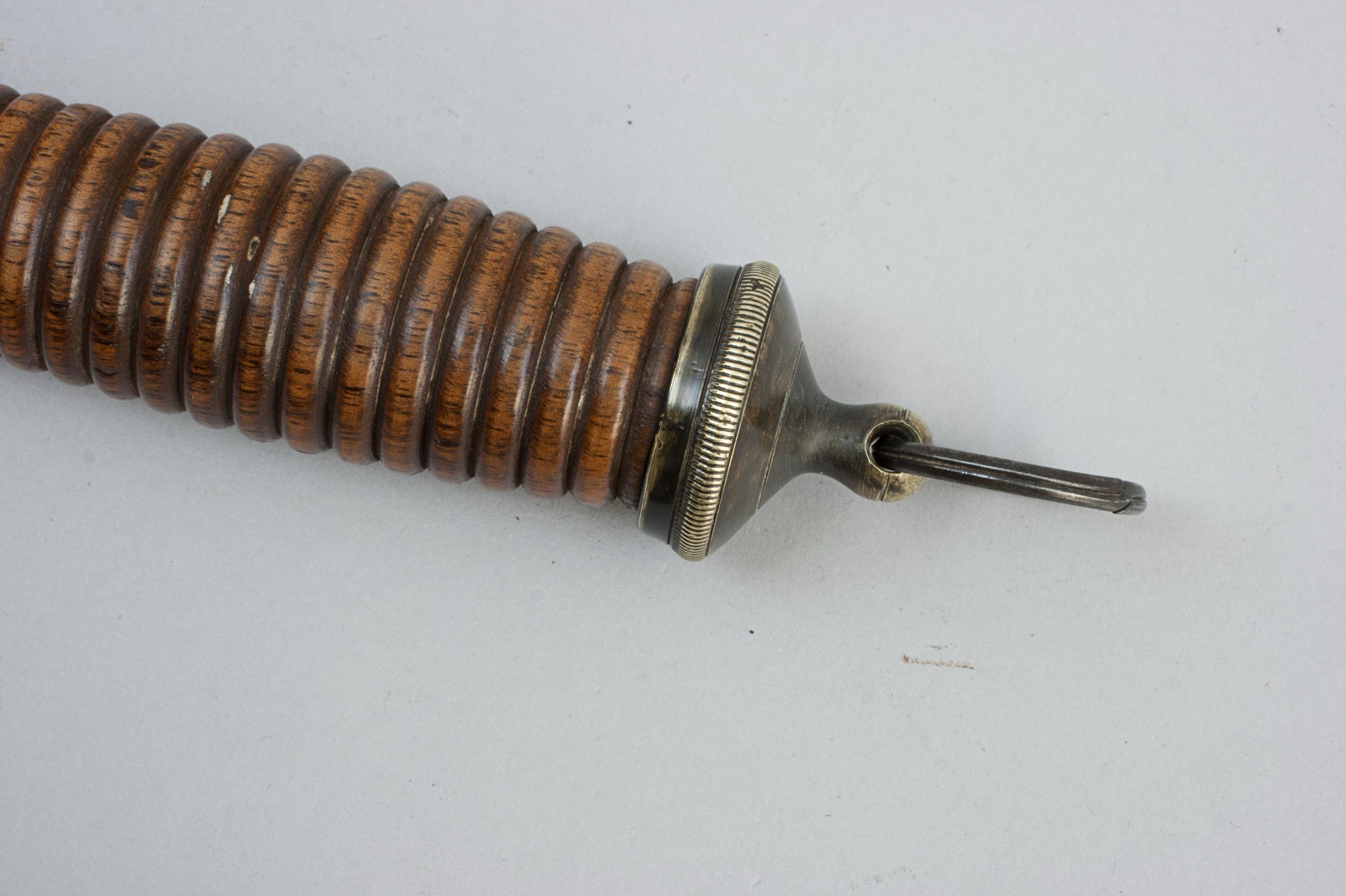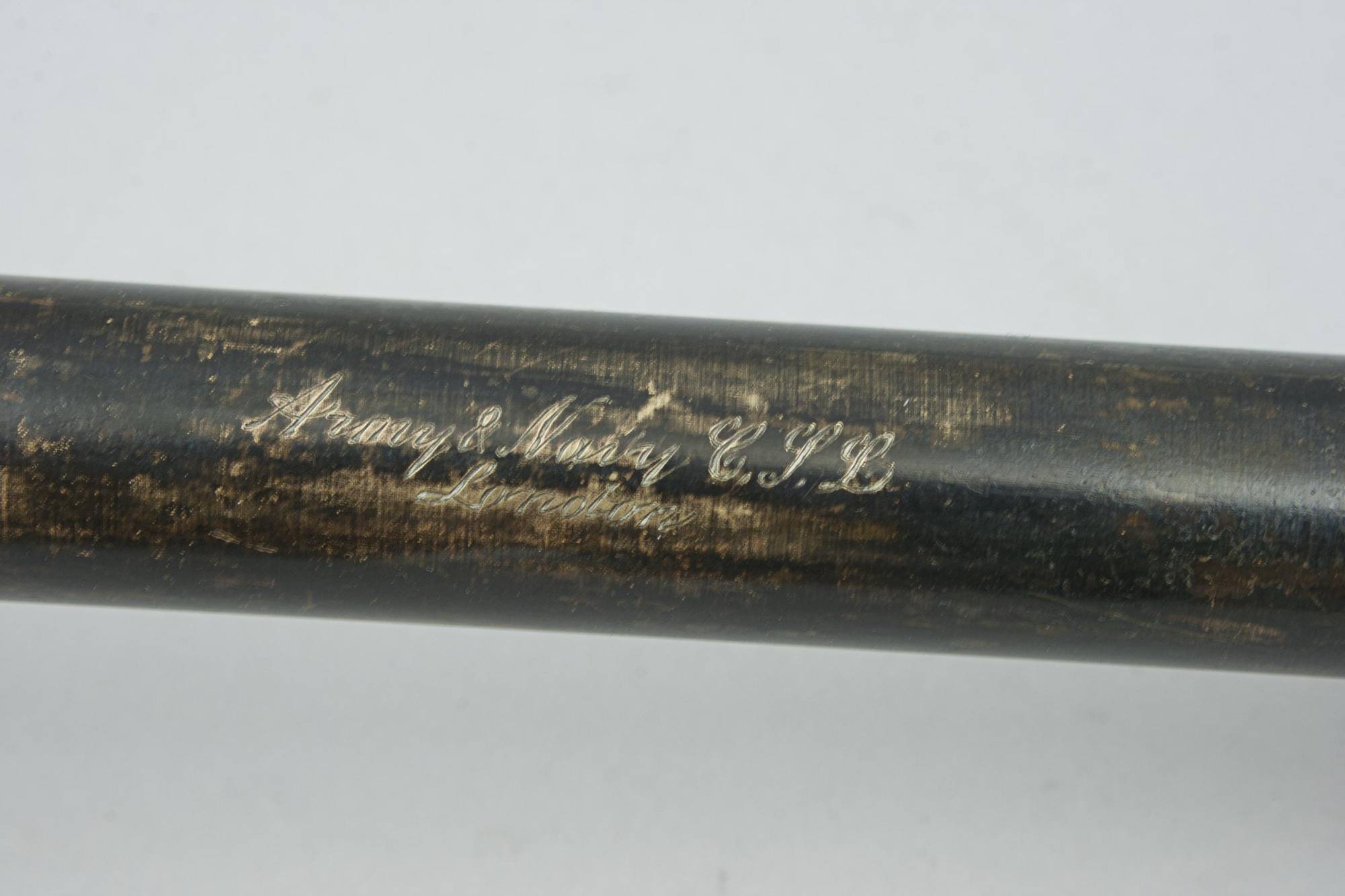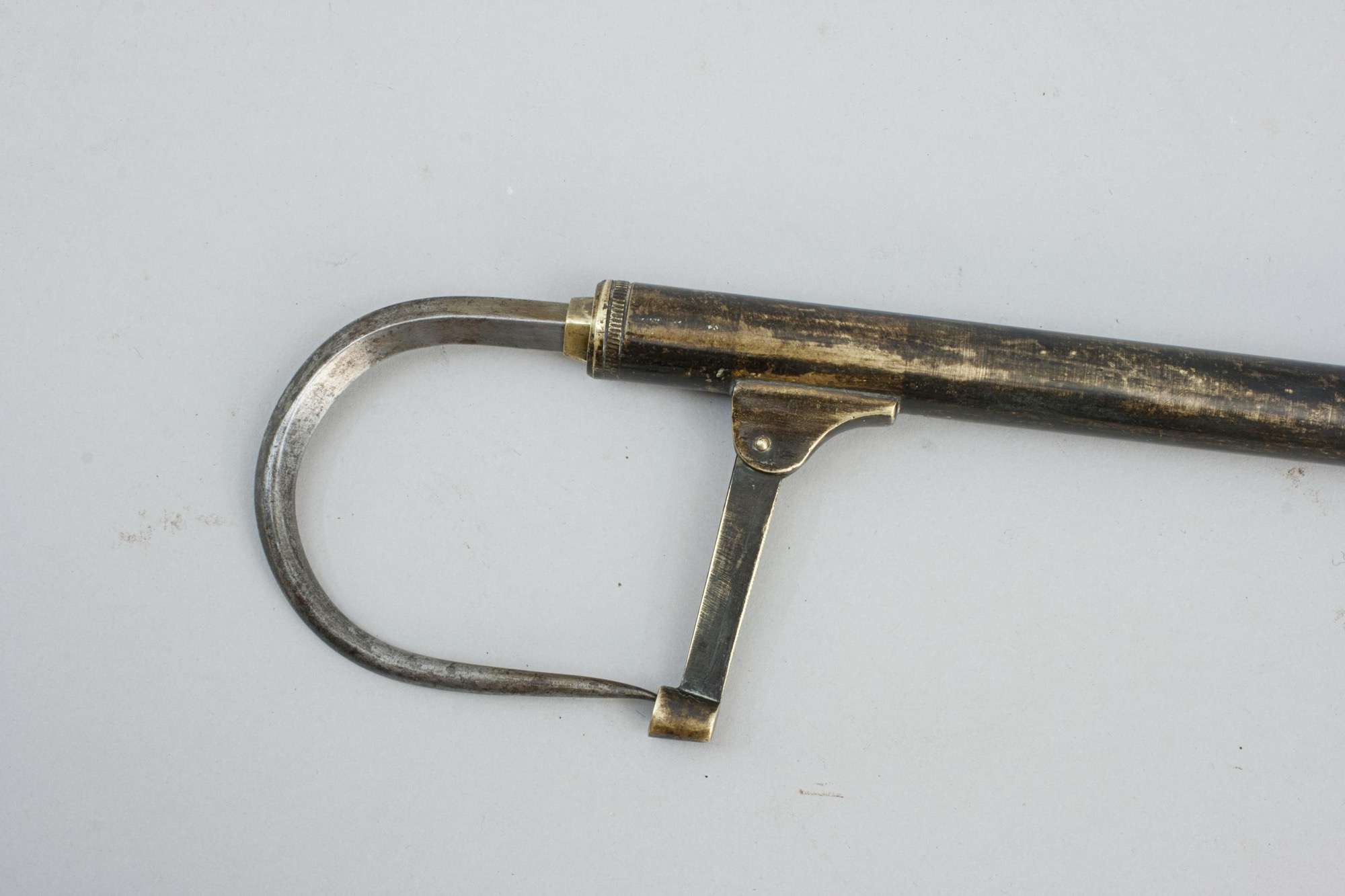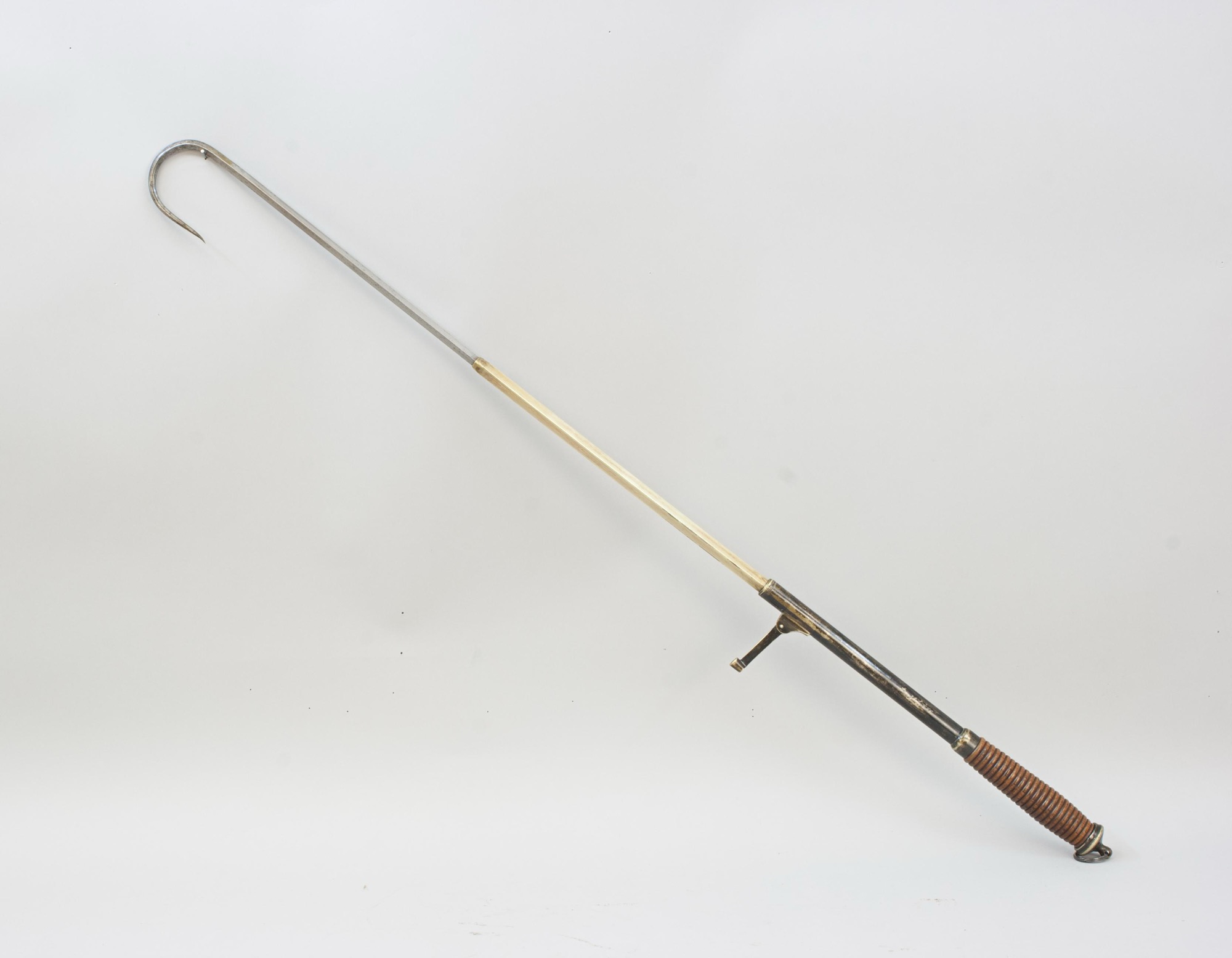 A very nice three piece telescopic fishing gaff by Army and Navy Stores, London. The high quality piece has a round outer body, the telescopic pieces with a square shape, the hook being made of steel. The main body is brass and is engraved 'Army & Navy C.S.L., London' and incorporates a brass folding safety guard for the hook. The wooden handle is made of lignum vitae and finished off with a brass finial.