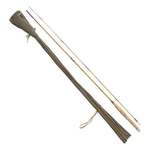 The Hardy 'Featherweight' is a split cane Palakona 2-piece rod made by Hardy's of Alnwick. The rod is in good used condition with green silk whippings, suction joints, adjustable alloy screw grip reel holder with spanner, 10 ½" cork handle. It has the registration number E90976 dating it to 1953. The rod is 9 ft long has the painted black inscription spiralling around the shaft 'the 'Featherweight Perfection', 'Palakona' and 'Regd. Trade Mark'. The butt and end rings are Agate, intermediate are 'full open' rings. Comes in a Hardy's canvas bag with paper label on 'Care Of Rods'.