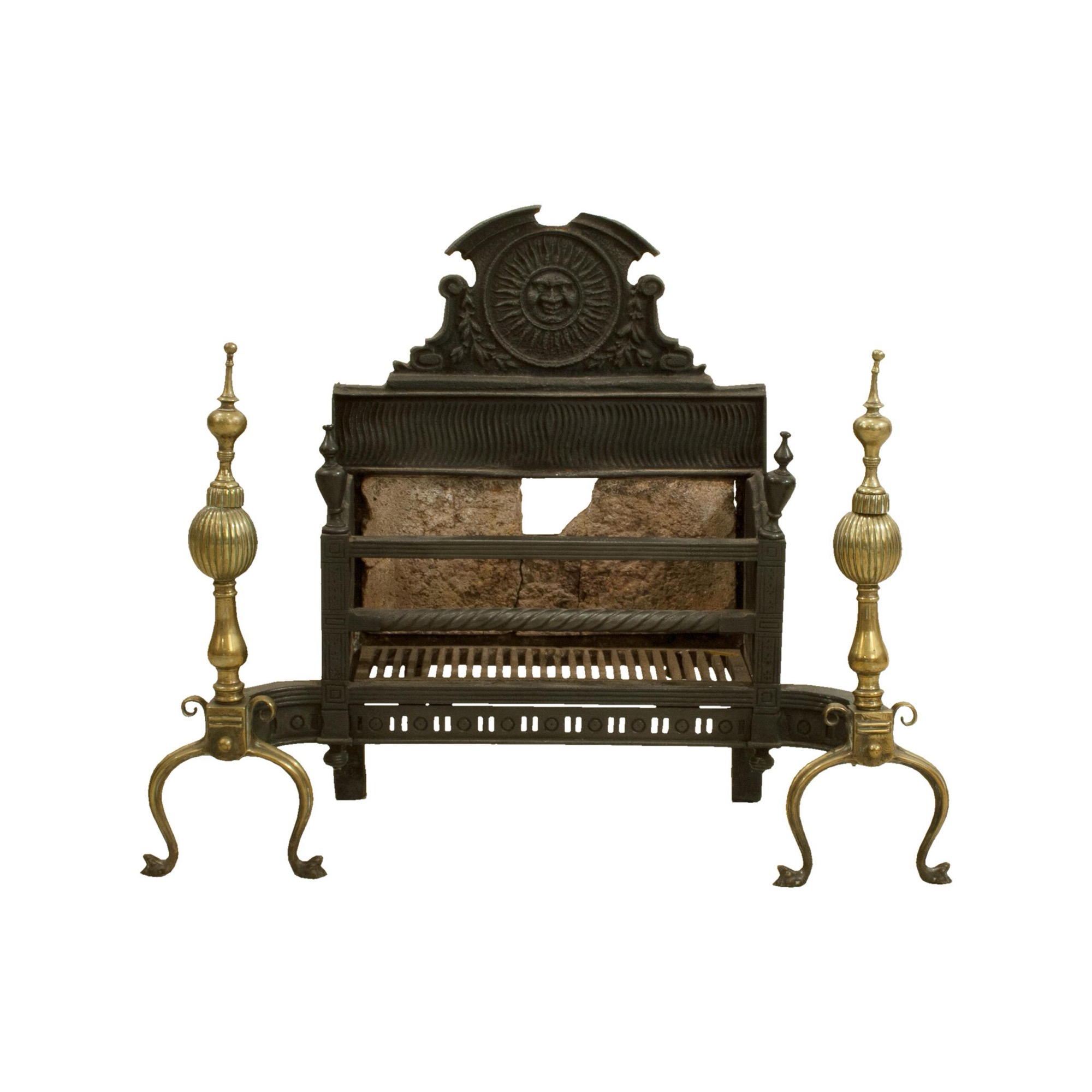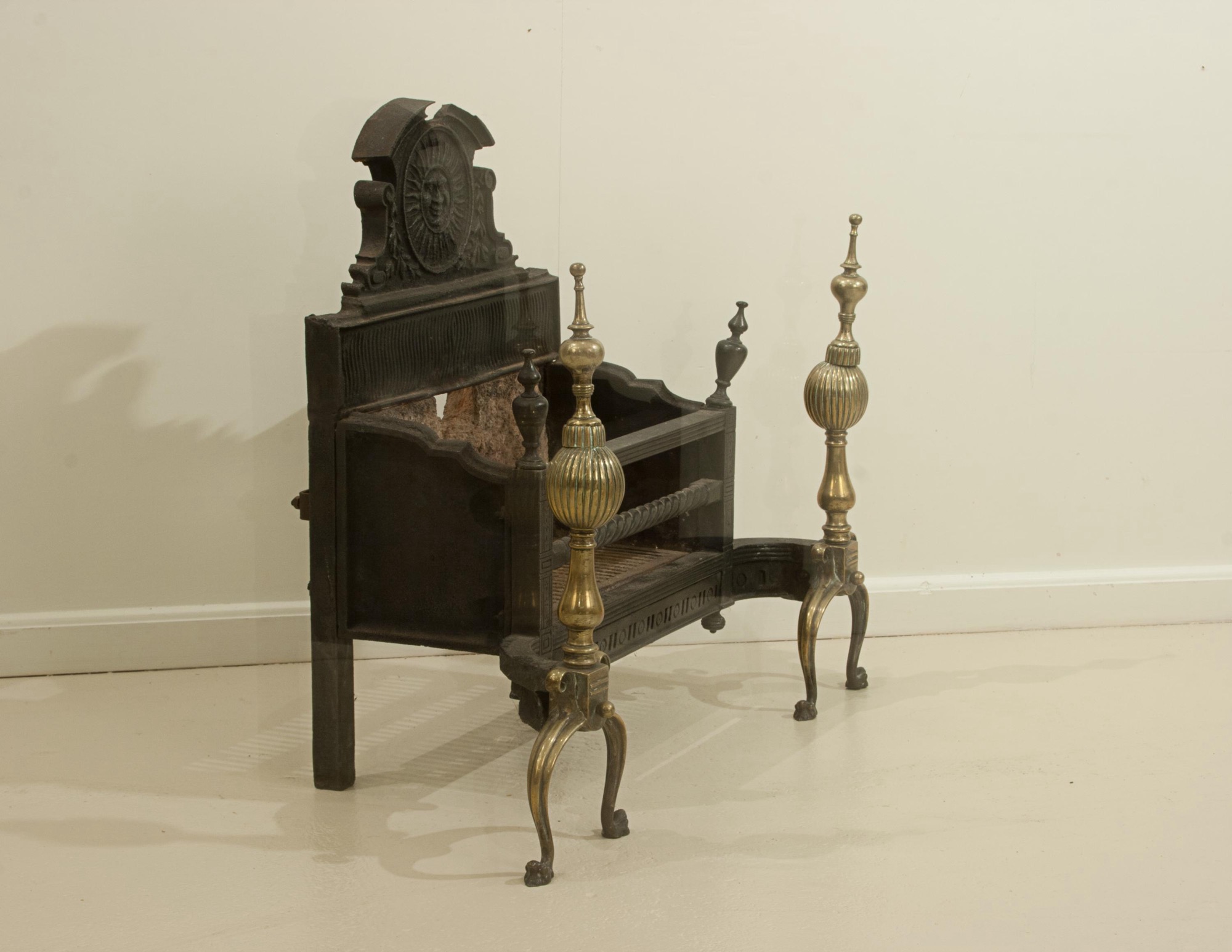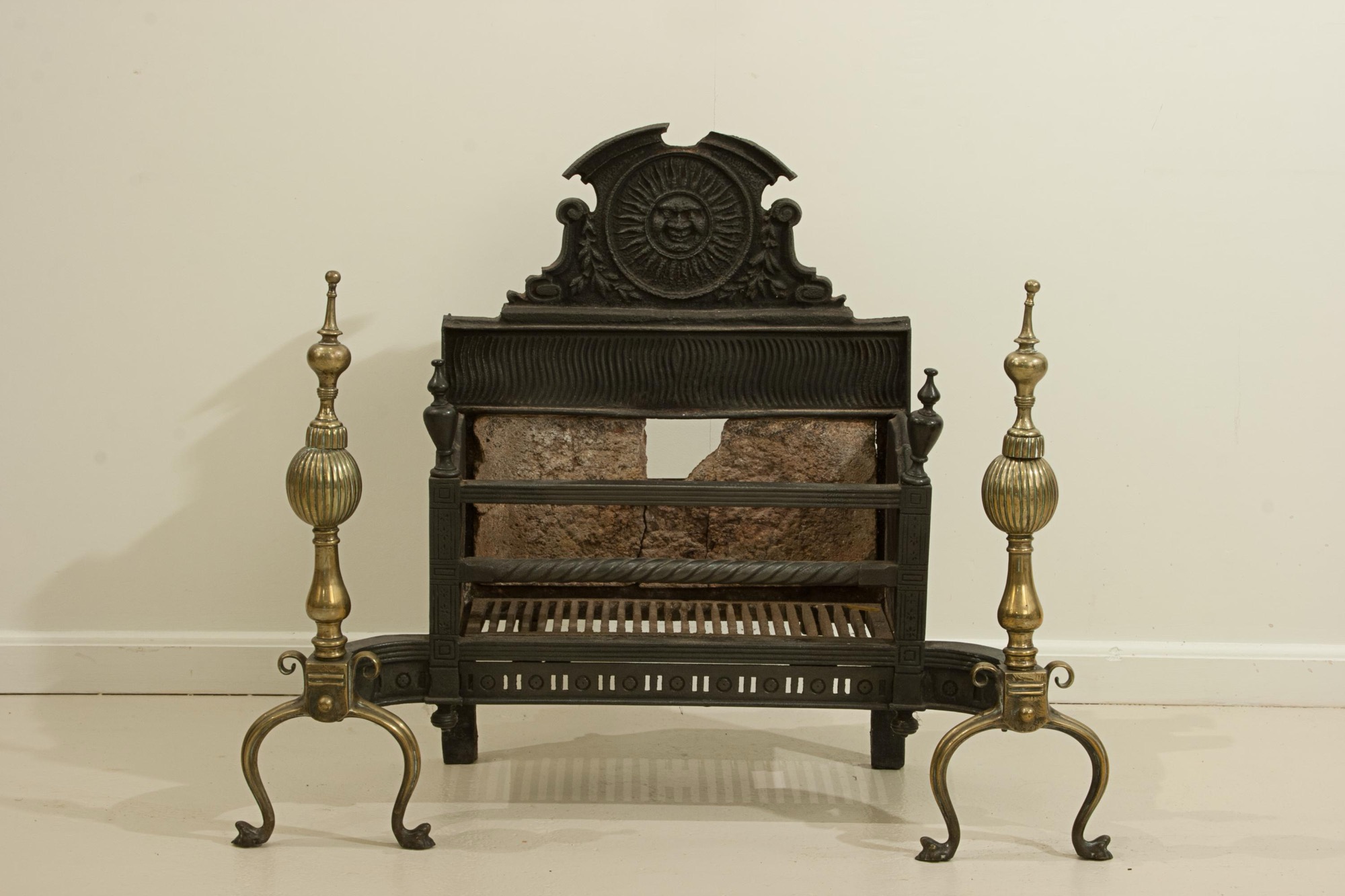 A cast iron decorative centerpiece for a hearth, antique fire basket with brass ball finial dog grates and decorated back piece with a central sun motif. This fire basket, also known as a dog grate, with a great pair of matching brass fire dogs.