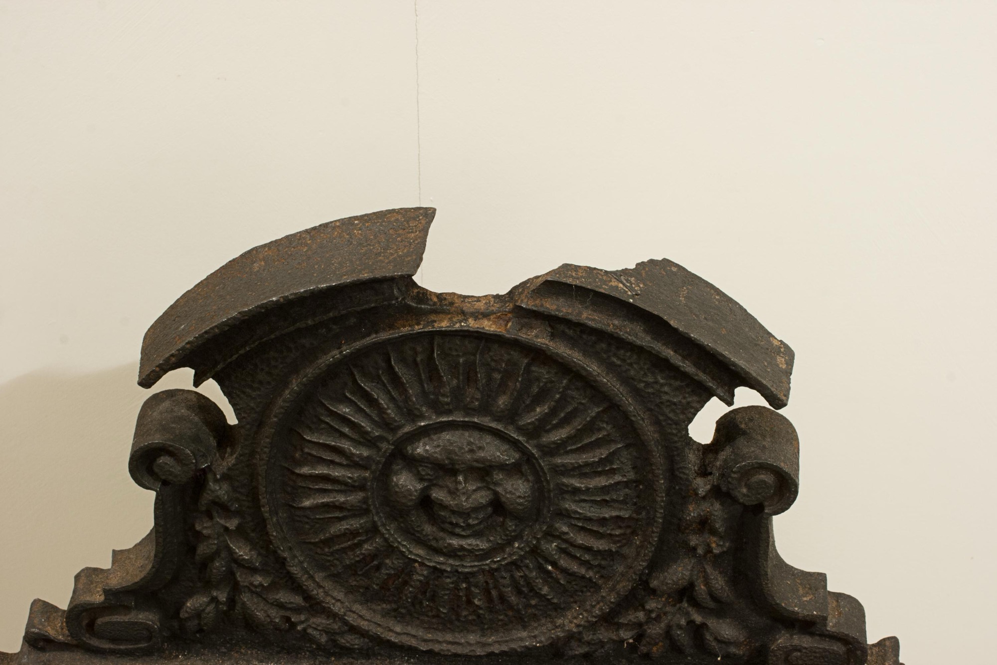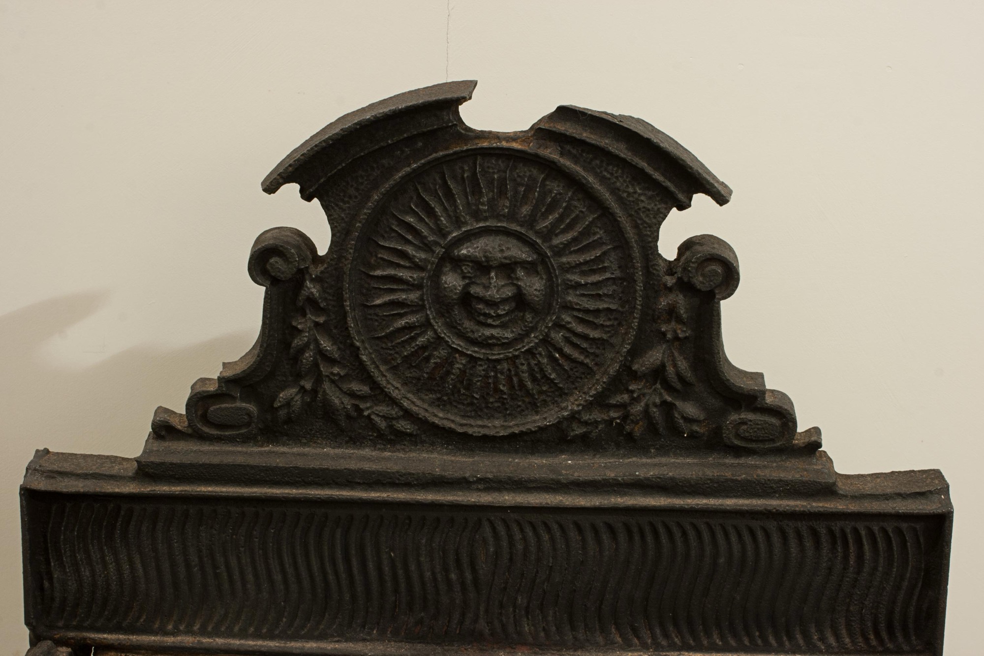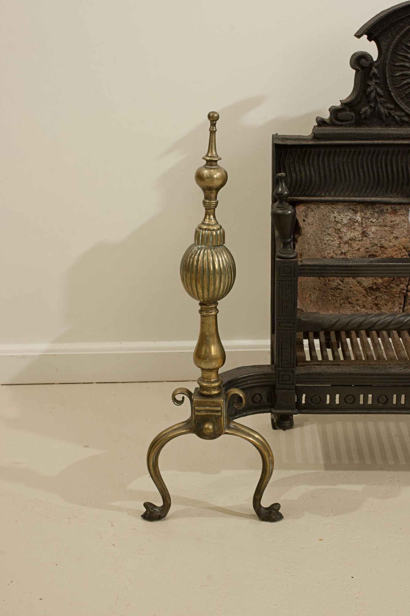 A cast iron decorative centerpiece for a hearth, antique fire basket with brass ball finial dog grates and decorated back piece with a central sun motif. This fire basket, also known as a dog grate, with a great pair of matching brass fire dogs.