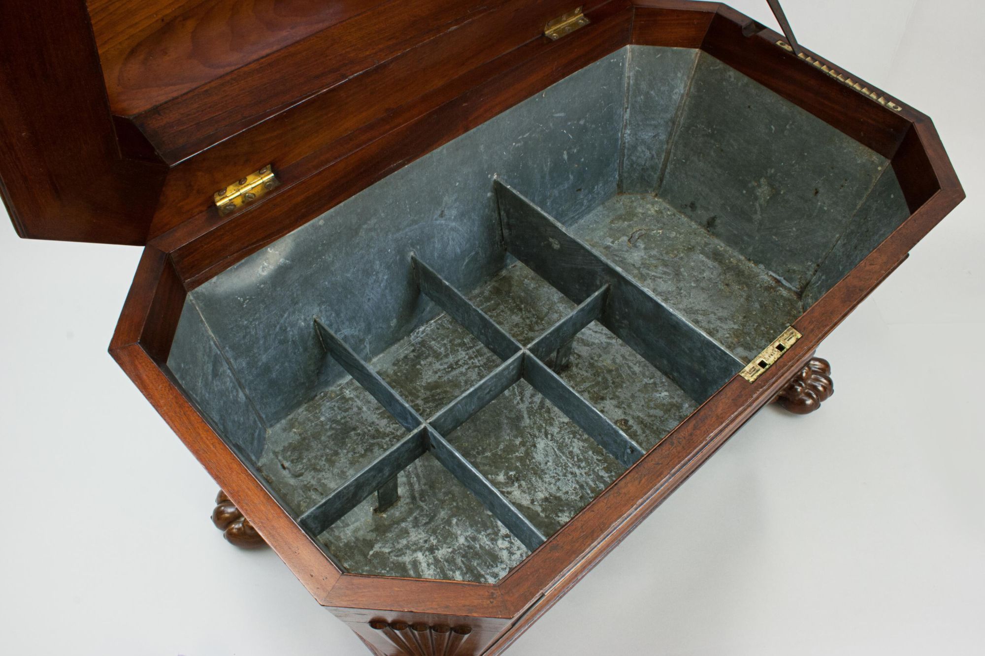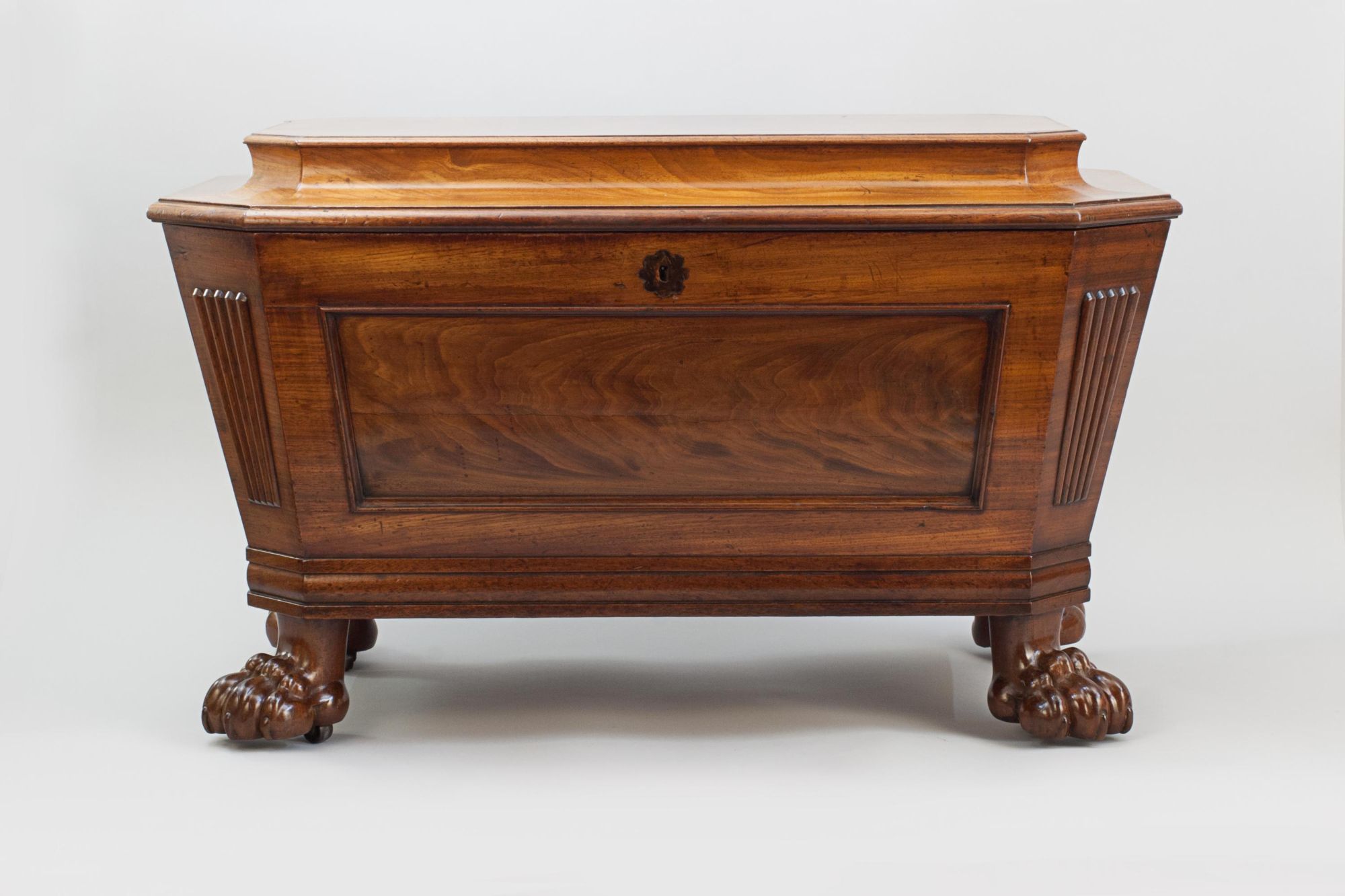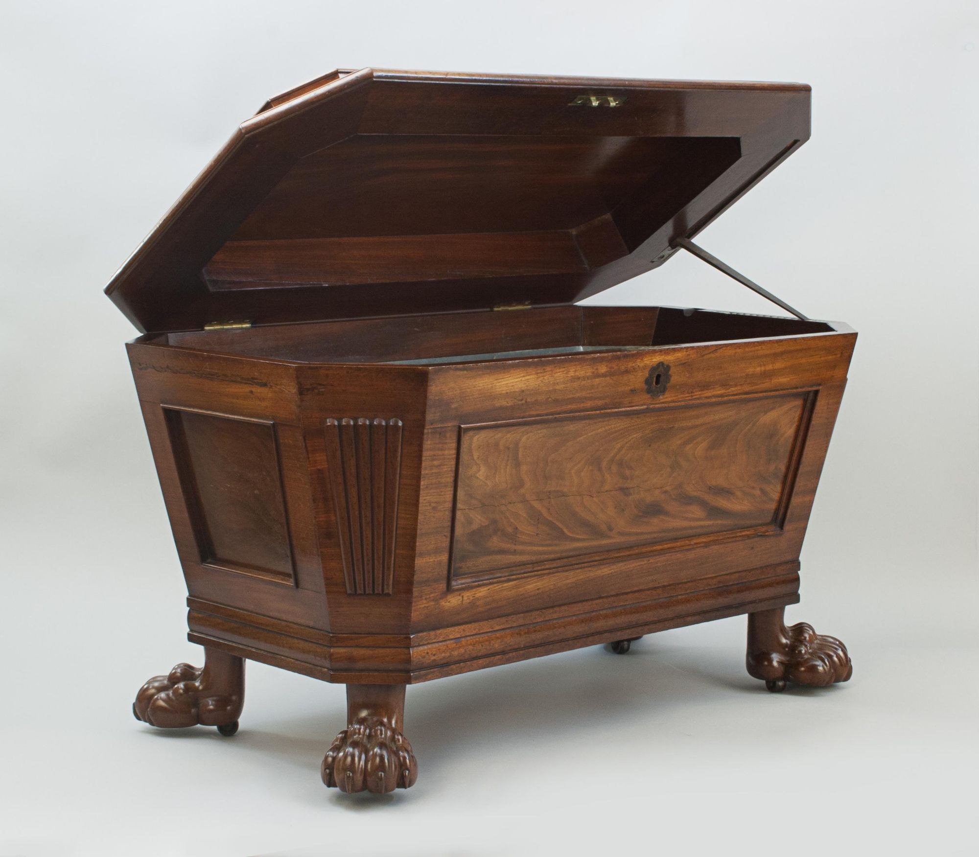 A superb-quality Regency mahogany wine or champagne cooler of sarcophagus form, featuring a cavetto-moulded hinged lid that opens to reveal its original lead-lined interior complete with dividers. The tapering body is designed with cut corners and adorned with reeded fan motifs and panelled detailing to the front and sides. It stands proudly on finely carved lion-paw feet fitted with recessed castors for ease of movement.