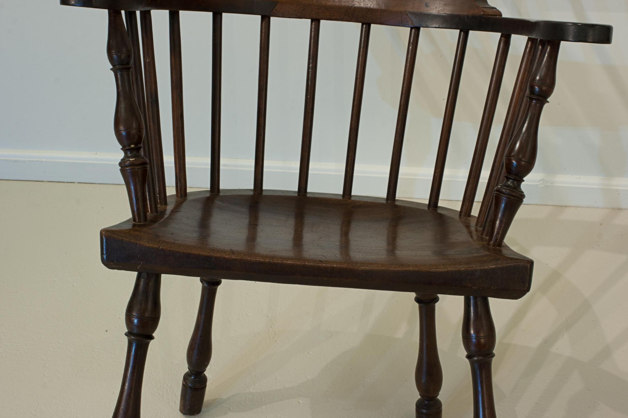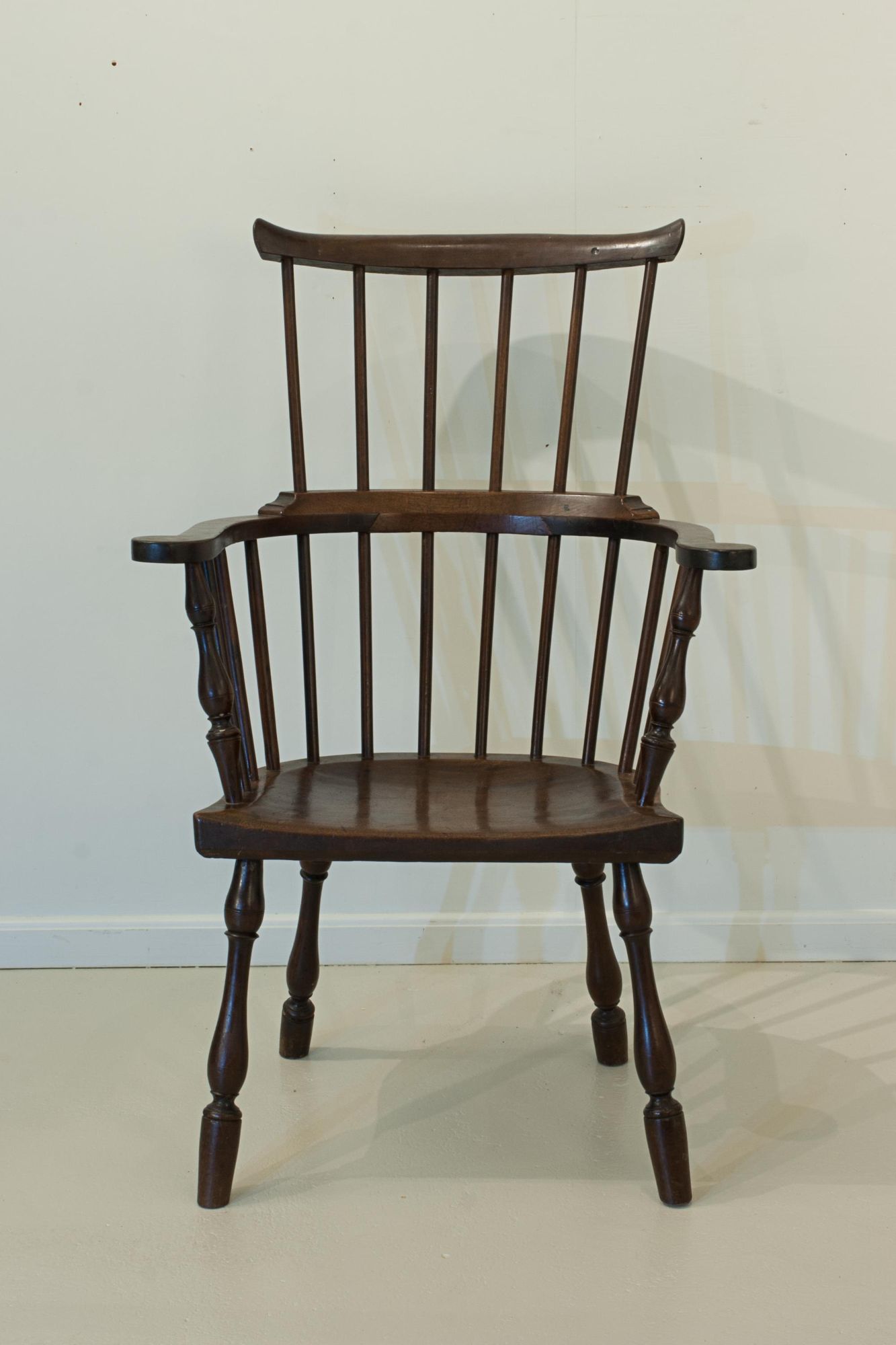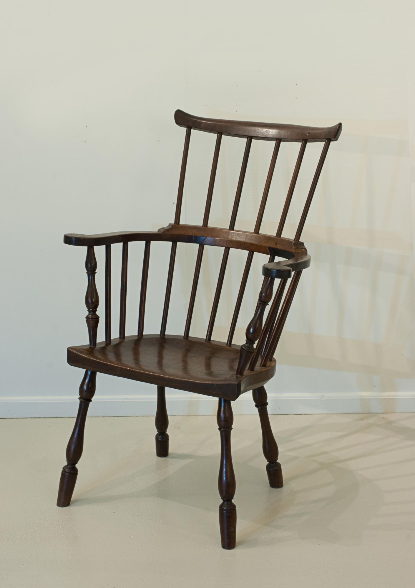 An attractive Windsor chair featuring a tall, six-spindle high comb back supporting a curved top (comb) rail. The chair has elegant curved arms with turned outer uprights and additional spindle supports, all leading to a well-shaped seat. It stands on beautifully turned, bulbous, splayed legs - notably, without stretchers - adding to its distinctive character. An original piece displaying fine colour and excellent patination.