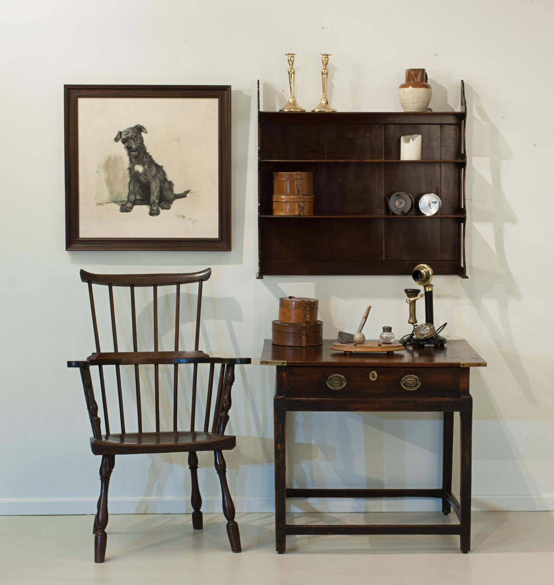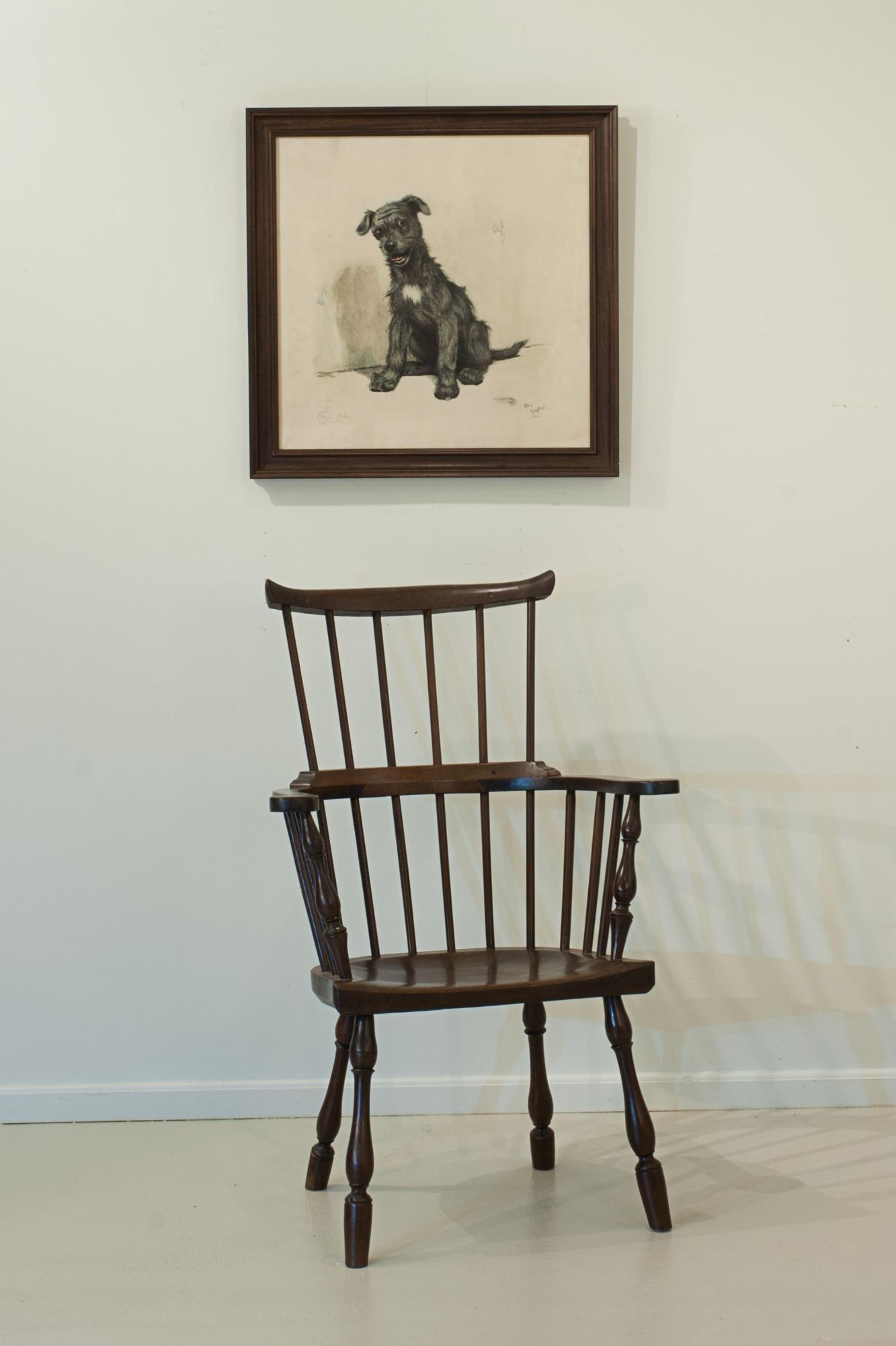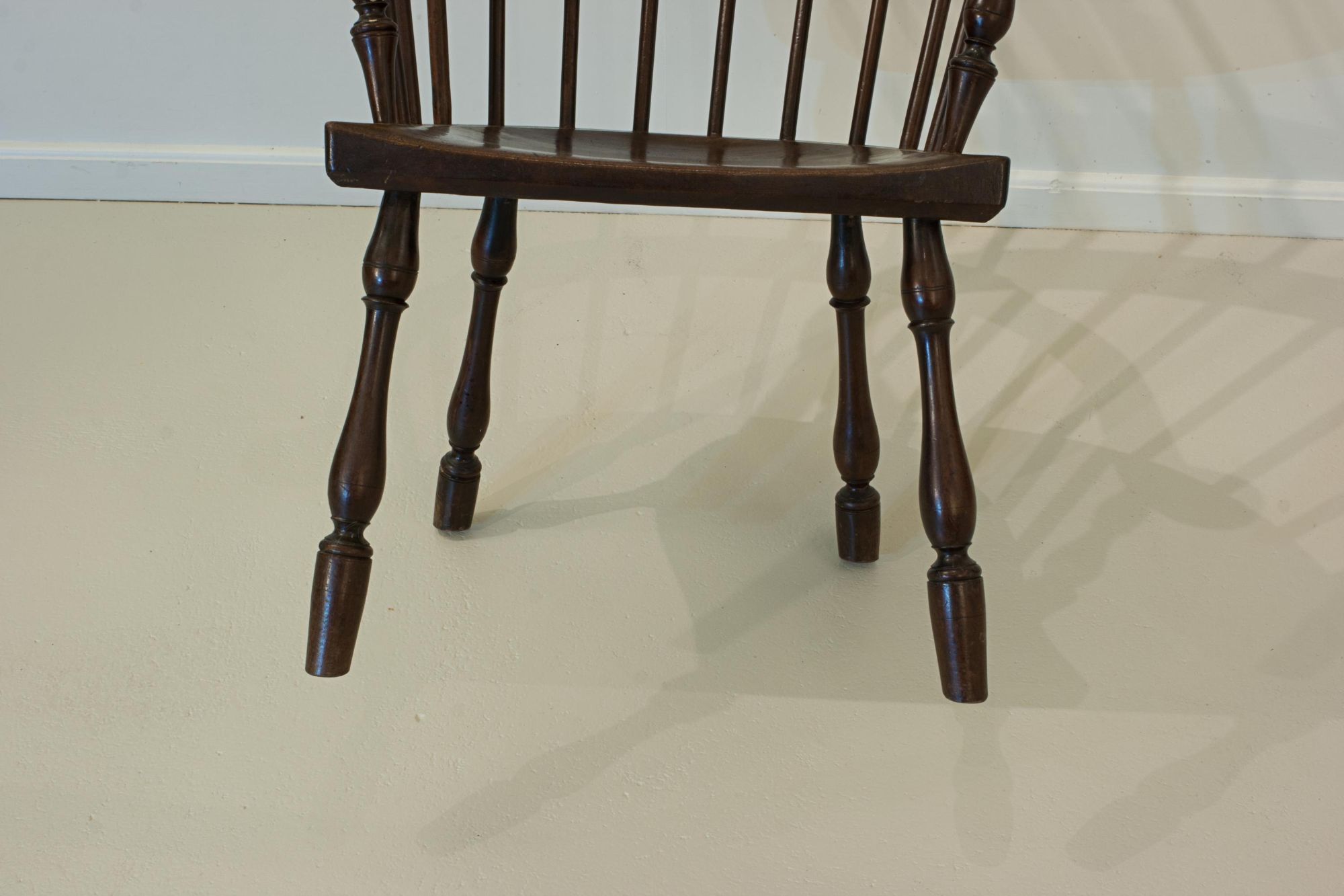 An attractive Windsor chair featuring a tall, six-spindle high comb back supporting a curved top (comb) rail. The chair has elegant curved arms with turned outer uprights and additional spindle supports, all leading to a well-shaped seat. It stands on beautifully turned, bulbous, splayed legs - notably, without stretchers - adding to its distinctive character. An original piece displaying fine colour and excellent patination.